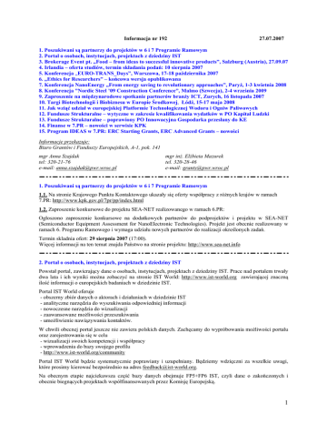 Informacja nr 192 27.07.2007 1. Poszukiwani są partnerzy do projektów w 6 i 7 Programie Ramowym 2. Portal o osobach, instytucjach, projektach z dziedziny IST 3. Brokerage Event pt. „Food – from ideas to successful innovative products”, Salzburg (Austria), 27.09.07 4. Irlandia – oferta studiów, termin składania podań: 10 sierpnia 2007 5. Konferencja „EURO-TRANS_Days”, Warszawa, 17-18 października 2007 6. „Ethics for Researchers” – końcowa wersja opublikowana 7. Konferencja NanoEnergy „From energy saving to revolutionary approaches”, Paryż, 1-3 kwietnia 2008 8. Konferencja ”Nordic Steel ’09 Construction Conference”, Malmo (Szwecja), 2-4 września 2009 9. Zaproszenie na międzynarodowe spotkanie partnerów branży ICT, Zurych, 16 listopada 2007 10. Targi Biotechnologii i Biobiznesu w Europie Środkowej, Łódź, 15-17 maja 2008 11. Jak wziąć udział w europejskiej Platformie Technologicznej Wodoru i Ogniw Paliwowych 12. Fundusze Strukturalne – wytyczne w zakresie kwalifikowania wydatków w PO Kapitał Ludzki 13. Fundusze Strukturalne – poprawiony PO Innowacyjna Gospodarka przesłany do KE 14. Finanse w 7.PR – nowości w serwisie KPK 15. Program IDEAS w 7.PR: ERC Starting Grants, ERC Advanced Grants – nowości Informacje przekazuje: Biuro Grantów i Funduszy Europejskich, A-1, pok. 141 mgr Anna Szajdak tel: 320-21-76 e-mail: [email protected] mgr inż. Elżbieta Mazurek tel. 320-28-46 e-mail: [email protected] 1. Poszukiwani są partnerzy do projektów w 6 i 7 Programie Ramowym 1.1. Na stronie Krajowego Punktu Kontaktowego ukazały się oferty współpracy z różnych krajów w ramach 7.PR: http://www.kpk.gov.pl/7pr/pp/index.html 1.2. Zaproszenie konkursowe do projektu SEA-NET realizowanego w ramach 6.PR: Ogłoszono zaproszenie konkursowe na dodatkowych partnerów do podprojektów i projektu w SEA-NET (Semiconductor Equipment Assessment for NanoElectronic Technologies). Projekt jest obecnie realizowany w ramach 6. Programu Ramowego i wymaga udziału nowych partnerów do realizacji określonych zadań. Termin skladnia ofert: 29 sierpnia 2007 (17:00). Więcej informacji na ten temat znajda Państwo na stronie projektu: http://www.sea-net.info 2. Portal o osobach, instytucjach, projektach z dziedziny IST Powstał portal, zawierający dane o osobach, instytucjach, projektach z dziedziny IST. Prace nad portalem trwały dwa lata i ich wyniki można zobaczyć na stronie IST World: http://www.ist-world.org zawierającej znaczną ilość informacji o europejskich badaniach w dziedzinie IST. Portal IST World oferuje - obszerny zbiór danych o aktorach i działaniach w dziedzinie IST - analityczne narzędzia do wyszukiwania odpowiedniej informacji - nowoczesne narzędzia do wizualizacji - zaawansowane możliwości przeszukiwania - umożliwienie nawiązywania kontaktów. W chwili obecnej portal jeszcze nie zawiera polskich danych. Zachęcamy do wypróbowania możliwości portalu oraz zarejestrowania się w celu - wizualizacji swoich kompetencji i współpracy - wprowadzenia do bazy swojego profilu - http://www.ist-world.org/community Portal IST World będzie systematycznie poprawiany i uzupełniany. Będziemy wdzięczni za wszelkie uwagi, które prosimy kierować bezpośrednio na adres [email protected]. Na obecnym etapie najciekawsza część bazy danych obejmuje FP5+FP6 IST, czyli dane o zakończonych i obecnie biegnących projektach współfinansowanych przez Komisję Europejską. 1 3. Brokerage Event pt. „Food – from ideas to successful innovative products”, Salzburg (Austria), 27.09.07 27 września 2007, w Salzburgu, odbędzie się impreza organizowana przez EUREKA Austria oraz EUROAGRI, której celem jest zorganizowanie spotkań przedstawicielom przemysłu z naukowcami i pomoc tym grupom w stworzeniu konsorcjów do przyszłych wniosków projektowych. Hasłem przewodnim ww. imprezy jest "Żywność - Od pomysłu do innowacyjnego produktu". Udział w imprezie jest bezpłatny. Więcej informacji dostępnych pod adresem: http://www.matchmaking.at/euroagri07 , na której można znaleźć również informacje na temat organizacji, które już zgłosiły swój udział w spotkaniu. 4. Irlandia – oferta studiów, termin składania podań: 10 sierpnia 2007 Poniżej przesyłamy ofertę stypendialną Irish Research Council skierowaną dla studentów zainteresowanych dalszą nauką w Irlandii (MSc lub PhD). Szczególy na stronie www.ircset.ie. 2007 Programme [Second Call] NOW OPEN The Irish Research Council for Science, Engineering & Technology invites applications for funding from intending postgraduate researchers under the Embark Initiative Postgraduate Research Scholarship Scheme [Second Call] 2007. The Embark Initiative's Postgraduate Research Scholarship Scheme is designed for either Masters or Doctorate level researchers in the sciences, engineering or technology. Approximately 50 awards will be funded in this round, with the expectation that up to ten of these will be within the Enterprise Partnership Scheme. The scheme is open to candidates worldwide with a small number of the scholarships available to exceptional candidates from non EU member states. SEI Scholarships As part of its annual research scholarship programme in conjunction with IRCSET, Sustainable Energy Ireland (SEI) will consider funding for 1-2 Doctoral Scholarships, specifically in the areas of: transport energy efficiency, industrial energy efficiency, or building energy efficiency. The research agendas should help provide a better understanding of fundamental aspects of sectoral energy efficiency. Economic, as well as scientific and engineering proposals are welcome. This scholarship(s) will be funded by SEI and administered by IRCSET. The Marine Institute will be offering a number of scholarships as part of this call; further details will be available shortly. The Closing Date for all applications will be 5pm, Friday 10 August 2007. 5. Konferencja „EURO-TRANS_Days”, Warszawa,