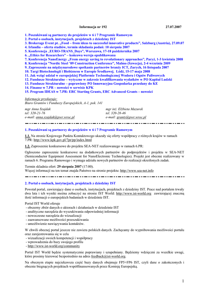 Informacja nr 192 27.07.2007 1. Poszukiwani są partnerzy do