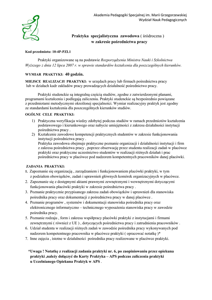 Akademia Pedagogiki Specjalnej im. Marii Grzegorzewskiej Wydział Nauk Pedagogicznych Praktyka specjalistyczna zawodowa ( śródroczna ) w zakresie pośrednictwa pracy Kod przedmiotu: 10-4P-PZL1 Praktyki organizowane są na podstawie Rozporządzenia Ministra Nauki i Szkolnictwa Wyższego z dnia 12 lipca 2007 r. w sprawie standardów kształcenia dla poszczególnych kierunków. WYMIAR PRAKTYKI: 40 godzin. MIEJSCE REALIZACJI PRAKTYKI: w urzędach pracy lub firmach pośrednictwa pracy lub w działach kadr zakładów pracy prowadzących działalność pośrednictwo pracy. Praktyki studenckie są integralną częścią studiów, zgodne z zatwierdzonymi planami, programami kształcenia i podlegają zaliczeniu. Praktyki studenckie są bezpośrednio powiązane z przedmiotami metodycznymi określonej specjalności. Wymiar realizacyjny praktyk jest zgodny ze standardami kształcenia dla poszczególnych kierunków studiów. OGÓLNE CELE PRAKTYKI: 1) Praktyczna weryfikacja wiedzy zdobytej podczas studiów w ramach przedmiotów kształcenia podstawowego i kierunkowego oraz nabycie umiejętności z zakresu działalności instytucji pośrednictwa pracy . 2) Kształcenie zawodowe kompetencji praktycznych studentów w zakresie funkcjonowania instytucji pośrednictwa pracy . Praktyka zawodowa obejmuje praktyczne poznanie organizacji i działalności instytucji i firm z zakresu pośrednictwa pracy , poprzez obserwację przez studenta realizacji zadań w placówce praktyki oraz praktyczne uczestnictwo studentów w realizacji różnych działań i prac pośrednictwa pracy w placówce pod nadzorem kompetentnych pracowników danej placówki. ZADANIA PRAKTYKI: 1. Zapoznanie się organizacją , zarządzaniem i funkcjonowaniem placówki praktyki, w tym 2. 3. 4. 5. 6. 7. z podziałem obowiązków, zadań i uprawnień głównych komórek organizacyjnych w placówce. Zapoznanie się z dostępnymi aktami prawnymi zewnętrznymi i wewnętrznymi dotyczącymi funkcjonowania placówki praktyki w zakresie pośrednictwa pracy . Poznanie praktycznie przypisanego zakresu zadań obowiązków i uprawnień dla stanowiska pośrednika pracy oraz dokumentacji z pośrednictwa pracy w danej placówce . Poznanie programów , systemów i dokumentacji stanowiska pośrednika pracy oraz elektronicznego informatyczno – technicznego wyposażenia stanowiska pracy w zawodzie pośrednika pracy. Poznanie rodzaju , form i zakresu współpracy placówki praktyki z instytucjami i firmami zewnętrznymi ( również z UE ) , dotyczących pośrednictwa pracy i zatrudnienia pracowników . Udział studenta w realizacji różnych zadań w zawodzie pośrednika pracy wykonywanych pod nadzorem kompetentnego pracownika w placówce praktyki ( opracować notatkę )* Inne zajęcia , istotne w działalności pośrednika pracy realizowane w placówce praktyki. *Uwaga ! Notatkę z realizacji zadania praktyki nr. 6, po zaopiniowaniu przez opiekuna praktyki ,należy dołączyć do Karty Praktyka – APS podczas zaliczenia praktyki u Uczelnianego Opiekuna Praktyk w APS . Akademia Pedagogiki Specjalnej im. Marii Grzegorzewskiej Wydział Nauk Pedagogicznych ZAKŁADA SIĘ, ŻE STUDENT W RAMACH ZREALIZOWANYCH ODBYTEJ PRAKTYKI NABĘDZIE NIŻEJ WYMIENIONE KOMPETENCJE W ZAKRESIE : 1. PRZYGOTOWANIE MERYTORYCZNE ( WIEDZA – UMIEJĘTNOŚCI ) : ▪ zna założenia organizacyjne i zadania placówki w zakresie pośrednictwa pracy. ▪ zna podstawowe przepisy prawne i dokumentację w zakresie pośrednictwa pracy. ▪ zna różne formy współpracy placówki z instytucjami i firmami zewnętrznymi, w tym z UE w zakresie pozyskiwania informacji oraz pozyskiwania i kierowania do zatrudnienia pracowników o wymaganych kwalifikacjach i kompetencjach zawodowych. 2. UMIEJĘTNOŚCI Z ZAKRESU ORGANIZACJI I PROWADZENIA OBSERWACJI : ▪ potrafi rozpoznać i ocenić potrzeby zatrudnieniowe rynku pracy w różnych zawodach . ▪ potrafi opracować ramowe programy dla pozyskiwaniu i zatrudniania pracowników wg zawartych umów z firmami zlecającymi pośrednictwo pracy. ▪ potrafi posługiwać się technicznym wyposażeniem informatyczno – operacyjnym na stanowisku pośrednika pracy z wykorzystaniem programów komputerowych. ▪ prawidłowo dokonuje zapisu z obserwacji pracy na stanowisku pośrednika pracy. . 3. POSTAWA PRAKTYKANTA . ▪ autoprezentacja- kultura osobista, kultura słowa, zainteresowanie problematyką pracy z zakresu pośrednictwa pracy , . ▪ współpraca praktykanta z opiekunem praktyki i innymi pracownikami placówki podczas praktyk realizowanych indywidualnie w danej placówce, . 4. PRZYGOTOWANIE INTERPERSONALNE DO REALIZACJI ZADAN POŚREDNIKA PRACY Identyfikuje się z rolą i zadaniami pracownika na stanowisku pośrednika pracy, radzi sobie w różnych sytuacjach współpracy z pracownikami placówki praktyki . OCENA I ZALICZENIE PRAKTYKI Podstawą zaliczenia praktyki jest wypełnienie obowiązków wynikających z zadań programu praktyki oraz udokumentowanie przez studenta rzeczywistego przebiegu praktyki. Student wpisuje w Karcie Praktykanta - APS adres placówki praktyki , a w pkt.2.( harmonogram ) zadania praktyki wymienione w programie praktyki ( pkt.1-7 ) i z opiekunem praktyki w placówce ustalają terminy ich realizacji. Opiekun praktyki studenta , jako koordynator praktyki w placówce, potwierdza odbycie praktyki przez studenta i ocenia jej realizację , dokonując odpowiedniego wpisu w dzienniku praktyk pedagogicznych oraz w Karcie Praktykanta – APS, przedstawionych przez studenta. W opinii o przebiegu praktyki ( dziennik praktyk ) powinny być wpisane osiągnięcia studenta oraz jego braki i trudności ujawniane w trakcie zajęć praktycznych, z uwzględnieniem kryteriów, jak niżej: 1) przygotowanie merytoryczne ( wiedza – umiejętności ). 2) umiejętności z zakresu organizacji i prowadzenia obserwacji . 3) postawa praktykanta w odniesieniu do realizacji zadań praktyki. 4) przygotowanie interpersonalne do realizacji zadań w zwodzie pośrednika pra