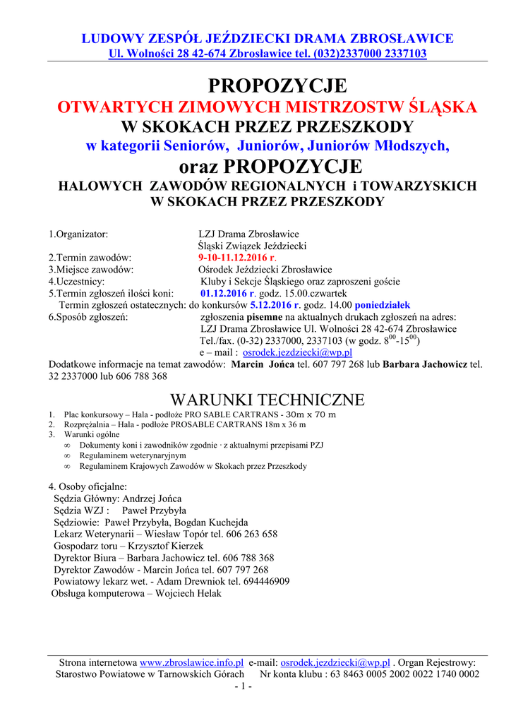 LUDOWY ZESPÓŁ JEŹDZIECKI DRAMA ZBROSŁAWICE Ul. Wolności 28 42-674 Zbrosławice tel. (032)2337000 2337103 PROPOZYCJE OTWARTYCH ZIMOWYCH MISTRZOSTW ŚLĄSKA W SKOKACH PRZEZ PRZESZKODY w kategorii Seniorów, Juniorów, Juniorów Młodszych, oraz PROPOZYCJE HALOWYCH ZAWODÓW REGIONALNYCH i TOWARZYSKICH W SKOKACH PRZEZ PRZESZKODY 1.Organizator: LZJ Drama Zbrosławice Śląski Związek Jeździecki 2.Termin zawodów: 9-10-11.12.2016 r. 3.Miejsce zawodów: Ośrodek Jeździecki Zbrosławice 4.Uczestnicy: Kluby i Sekcje Śląskiego oraz zaproszeni goście 5.Termin zgłoszeń ilości koni: 01.12.2016 r. godz. 15.00.czwartek Termin zgłoszeń ostatecznych: do konkursów 5.12.2016 r. godz. 14.00 poniedziałek 6.Sposób zgłoszeń: zgłoszenia pisemne na aktualnych drukach zgłoszeń na adres: LZJ Drama Zbrosławice Ul. Wolności 28 42-674 Zbrosławice Tel./fax. (0-32) 2337000, 2337103 (w godz. 800-1500) e – mail : [email protected] Dodatkowe informacje na temat zawodów: Marcin Jońca tel. 607 797 268 lub Barbara Jachowicz tel. 32 2337000 lub 606 788 368 WARUNKI TECHNICZNE 1. 2. 3. Plac konkursowy – Hala - podłoże PRO SABLE CARTRANS - 30m x 70 m Rozprężalnia – Hala - podłoże PROSABLE CARTRANS 18m x 36 m Warunki ogólne • Dokumenty koni i zawodników zgodnie · z aktualnymi przepisami PZJ • Regulaminem weterynaryjnym • Regulaminem Krajowych Zawodów w Skokach przez Przeszkody 4. Osoby oficjalne: Sędzia Główny: Andrzej Jońca Sędzia WZJ : Paweł Przybyła Sędziowie: Paweł Przybyła, Bogdan Kuchejda Lekarz Weterynarii – Wiesław Topór tel. 606 263 658 Gospodarz toru – Krzysztof Kierzek Dyrektor Biura – Barbara Jachowicz tel. 606 788 368 Dyrektor Zawodów - Marcin Jońca tel. 607 797 268 Powiatowy lekarz wet. - Adam Drewniok tel. 694446909 Obsługa komputerowa – Wojciech Helak Strona internetowa www.zbroslawice.info.pl e-mail: [email protected] . Organ Rejestrowy: Starostwo Powiatowe w Tarnowskich Górach Nr konta klubu : 63 8463 0005 2002 0022 1740 0002 -1- LUDOWY ZESPÓŁ JEŹDZIECKI DRAMA ZBROSŁAWICE Ul. Wolności 28 42-674 Zbrosławice tel. (032)2337000 2337103 Program zawodów Dzień pierwszy Piątek 9.12.2016 r. Początek konkursów Godz. 9.00 Konkurs Nr 1 60 cm. – Seria A -Towarzyski 60 cm. – z oceną stylu Jeźdźca; Seria B Kuce HZR Konkurs Nr 2 80 cm - Seria A Kuce HZR ; Seria B - Towarzyski . – z oceną stylu Jeźdźca Konkurs Nr 3 Kl. „LL” – dokładności bez rozgrywki art. 238 1.1 Konkurs Nr 4 Kl. „L” – dokładności bez rozgrywki art. 238 1.1 Konkurs Nr 5 Kl. „P” – zwykły art. 238.2.1 Konkurs Nr 6 Kl. „N” – dwufazowy art. 274.5.3 Konkurs Nr 7 Kl. „C” - dwufazowy art. 274.5.3 (przy min 5 zgłoszonych koniach) Zimowe Mistrzostwa Śląska (ZMŚl) (dokładna godz. rozpoczęcia po zamknięciu zgłoszeń) Konkurs Nr 8 Kl. „L” – z oceną stylu jeźdźca, I-półfinał Juniorów młodszych ZMŚl Konkurs Nr 9 Kl. „P” – zwykły - Art. 238.2.1, I-półfinał Juniorów Zimowe Mistrzostw Śląska Konkurs Nr 10 Kl. „N”- szybkości – Art. 239 I-półfinał Seniorów ZMŚl Dzień drugi Sobota 10.12.2015 r. Początek konkursów Godz. 8.30 Konkurs Nr 11 60 cm. – Seria A -Towarzyski – z oceną stylu Jeźdźca; Seria B Kuce HZR Konkurs Nr 12 80 cm. Seria A Kuce HZR ; Seria B - Towarzyski . – z oceną stylu Jeźdźca Konkurs Nr 13 Kl. „LL” – dokładności bez rozgrywki art. 238 1.1 Konkurs Nr 14 Kl. „L” – zwykły Art. 238.2.1 Konkurs Nr 15 Kl. „L1” - egzaminacyjny art. 6 Reg. PZJ Konkurs Nr 16 Kl. „P” – zwykły Art. 238.2.1 Konkurs Nr 17 Kl. „N” – zwykły art. 238.2.1 Konkurs Nr 18 Kl. „C” - zwykły art. 238.2.1 (przy 5 zgłoszonych koniach) Zimowe Mistrzostwa Śląska (dokładna godz. rozpoczęcia po zamknięciu zgłoszeń) Konkurs Nr 19 Kl. „L” – z oceną stylu jeźdźca, II-półfinał juniorów młodszych ZMŚl Konkurs Nr 20 Kl. „P-1” - zwykły Art. 238.2.1 , II-półfinał Juniorów ZMŚl Konkurs Nr 21 Kl. „N”- zwykły, II-półfinał Seniorów Art. 238.2.1 ZMŚl Dzień trzeci Niedziela 11.12.2016 r. Początek konkursów Godz. 8.30 Finały Zimowych Mistrzostw Śląska (ZMŚl) Konkurs Nr 22 Finał ZMŚl Juniorów młodszych - Konkurs dwunawrotowy I nawrót kl. „L” - z oceną stylu jeźdźca, II nawrót kl. „L1” dokładności art. 238.1.1 W II Nawrocie błędy na parkurze wg pkt. 6 Tabela III, Regulamin rozgrywania zawodów krajowych w skokach przez przeszkody. Wydanie 10.5. Konkurs Nr 23 Finał ZMŚl Juniorów art. 273. 3.3. 4.3 I nawrót kl. „P-1” – dokładności, II nawrót kl. „N” zwykły Konkurs Nr 24 Finał ZMŚl Seniorów art. 273.3.3.4.3 I nawrót kl. „N-1” dokładności; II nawrót kl. „N1” zwykły Konkurs Nr 25 60 cm. – Seria A -Towarzyski 60 cm.; Seria B Kuce HZR - dokładności bez rozgrywki art. 238 1.1 Konkurs Nr 26 80 cm - Seria A Kuce HZR ; Seria B - Towarzyski . – dokładności bez rozgrywki art. 238 1.1 Konkurs Nr 27 Kl. „LL” – dokładności bez rozgrywki art. 238 1.1 Konkurs Nr 28 Kl. „L” – zwykły art. 238 2.1 Konkurs Nr 29 Kl. „P” – zwykły art. 238.2.1 Konkurs Nr 30 Kl. „N” – dwufazowy art. 274.5.3 Konkurs Nr 31 Kl. „C” - dwufazowy art. 274.5.3 (przy min 5 zgłoszonych koniach) Starty: Konie zapisane do ZMŚl. w piątek i w sobotę mają prawo do drugiego startu w ramach Zawodów Regionalnych. W niedziele każdy koń ma prawo do jednego startu, W niedziele w zawodach regionalnych konie, które nie startowały w piątek (czyli planują starty tylko w sobotę i w niedzielę) do klasy L włącznie – max 2 starty w ciągu dnia. Strona internetowa www.zbroslawice.info.pl e-mail: [email protected] . Organ Rejestrowy: Starostwo Powiatowe w Tarnowskich Górach Nr konta klubu : 63 8463 0005 2002 0022 1740 0002 -2- LUDOWY ZESPÓŁ JEŹDZIECKI DRAMA ZBROSŁAWICE Ul. Wolności 28 42-674 Zbrosławice tel. (032)2337000 2337103 Sprawy organizacyjne 1. Sprawdzanie dokumentów koni i zawodników : 8.12.
