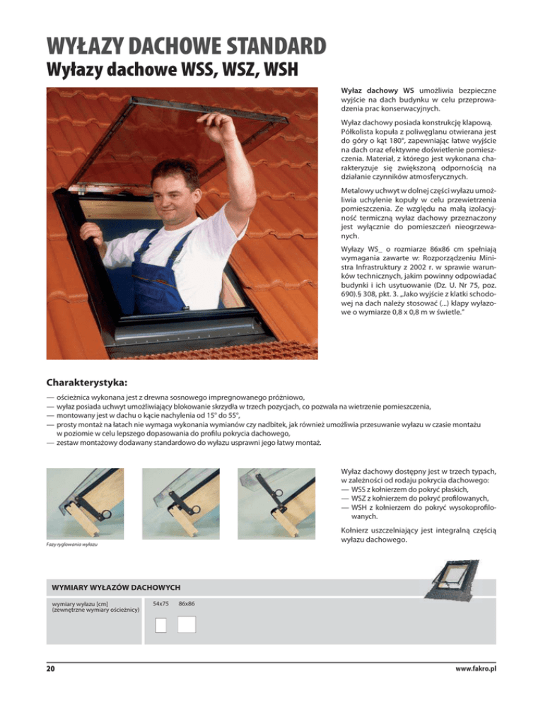 WYŁAZY DACHOWE STANDARD Wyłazy dachowe WSS, WSZ, WSH Wyłaz dachowy WS umożliwia bezpieczne wyjście na dach budynku w celu przeprowadzenia prac konserwacyjnych. Wyłaz dachowy posiada konstrukcję klapową. Półkolista kopuła z poliwęglanu otwierana jest do góry o kąt 180°, zapewniając łatwe wyjście na dach oraz efektywne doświetlenie pomieszczenia. Materiał, z którego jest wykonana charakteryzuje się zwiększoną odpornością na działanie czynników atmosferycznych. Metalowy uchwyt w dolnej części wyłazu umożliwia uchylenie kopuły w celu przewietrzenia pomieszczenia. Ze względu na małą izolacyjność termiczną wyłaz dachowy przeznaczony jest wyłącznie do pomieszczeń nieogrzewanych. Wyłazy WS_ o rozmiarze 86x86 cm spełniają wymagania zawarte w: Rozporządzeniu Ministra Infrastruktury z 2002 r. w sprawie warunków technicznych, jakim powinny odpowiadać budynki i ich usytuowanie (Dz. U. Nr 75, poz. 690).§ 308, pkt. 3. „Jako wyjście z klatki schodowej na dach należy stosować (...) klapy wyłazowe o wymiarze 0,8 x 0,8 m w świetle.” Charakterystyka: — ościeżnica wykonana jest z drewna sosnowego impregnowanego próżniowo, — wyłaz posiada uchwyt umożliwiający blokowanie skrzydła w trzech pozycjach, co pozwala na wietrzenie pomieszczenia, — montowany jest w dachu o kącie nachylenia od 15° do 55°, — prosty montaż na łatach nie wymaga wykonania wymianów czy nadbitek, jak również umożliwia przesuwanie wyłazu w czasie montażu w poziomie w celu lepszego dopasowania do profilu pokrycia dachowego, — zestaw montażowy dodawany standardowo do wyłazu usprawni jego łatwy montaż. Wyłaz dachowy dostępny jest w trzech typach, w zależności od rodaju pokrycia dachowego: — WSS z kołnierzem do pokryć płaskich, — WSZ z kołnierzem do pokryć profilowanych, — WSH z kołnierzem do pokryć wysokoprofilowanych. Kołnierz uszczelniający jest integralną częścią wyłazu dachowego. Fazy ryglowania wyłazu WYMIARY WYŁAZÓW DACHOWYCH wymiary wyłazu [cm] (zewnętrzne wymiary ościeżnicy) 20 54x75 86x86 www.fakro.pl Wyłazy dachowe WGT, WGI Wyłaz dachowy WG przeznaczony jest do poddaszy nieużytkowych. Umożliwia on łatwe i bezpieczne wyjście na dach, jak również zapewnia doświetlenie pomieszczenia. Wyłaz WG posiada kontrukcję klapową, skrzydło podnoszone jest do góry. Wyłaz WG dostępny jest w dwóch wersjach: — wersja WGT z pojedynczą szybą hartowaną 4H, — wersja WGI z szybą zespoloną 4H-10-4H, obie szyby; wewnętrzna i zewnętrzna są hartowane Ze względu na małą izolacyjność termiczną wyłaz dachowy przeznaczony jest wyłącznie do pomieszczeń nieogrzewanych. Charakterystyka: — ościeżnica wykonana jest z drewna sosnowego impregnowanego próżniowo, — skrzydło wykonane jest z profilu aluminiowego malowanego proszkowo, wyposażone od wewnątrz w uszczelkę obwodową, — wyłaz posiada uchwyt umożliwiający blokowanie skrzydła w trzech pozycjach, co pozwala na wietrzenie pomieszczenia, — montowany jest w dachu o kącie nachylenia od 15° do 60°, — prosty montaż na łatach nie wymaga wykonania wymianów czy nadbitek, jak również umożliwia przesuwanie wyłazu w czasie montażu w poziomie w celu lepszego dopasowania do profilu pokrycia dachowego, — zestaw montażowy dodawany standardowo do wyłazu usprawnia jego montaż. Wyłaz dachowy zintegrowany jest z uniwersalnym kołnierzem uszczelniającym zakończonym elastycznym fartuchem. Fazy ryglowania wyłazu WYMIARY WYŁAZÓW DACHOWYCH wymiary wyłazu [cm] (zewnętrzne wymiary ościeżnicy) PRODUKTY FAKRO 2008 45x55 45x75 21