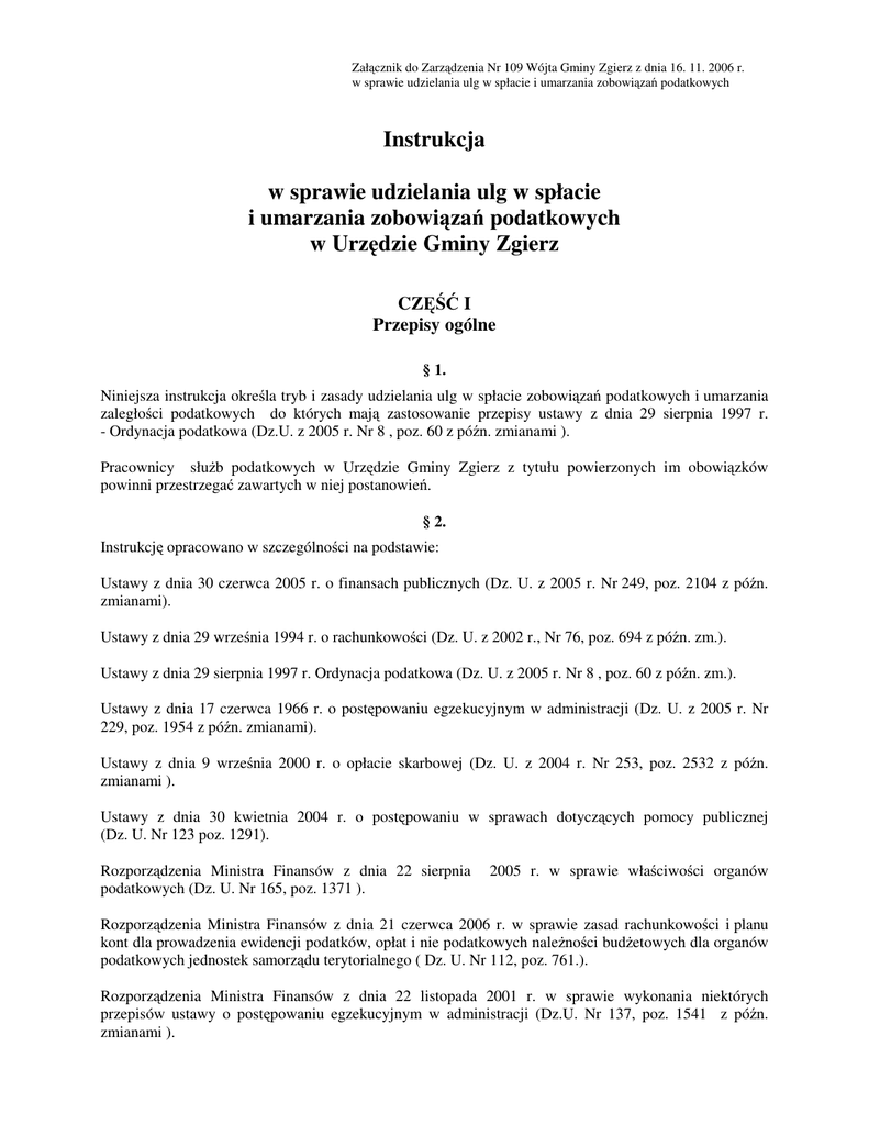 Załącznik do Zarządzenia Nr 109 Wójta Gminy Zgierz z dnia 16. 11. 2006 r. w sprawie udzielania ulg w spłacie i umarzania zobowiązań podatkowych Instrukcja w sprawie udzielania ulg w spłacie i umarzania zobowiązań podatkowych w Urzędzie Gminy Zgierz CZĘŚĆ I Przepisy ogólne § 1. Niniejsza instrukcja określa tryb i zasady udzielania ulg w spłacie zobowiązań podatkowych i umarzania zaległości podatkowych do których mają zastosowanie przepisy ustawy z dnia 29 sierpnia 1997 r. - Ordynacja podatkowa (Dz.U. z 2005 r. Nr 8 , poz. 60 z późn. zmianami ). Pracownicy służb podatkowych w Urzędzie Gminy Zgierz z tytułu powierzonych im obowiązków powinni przestrzegać zawartych w niej postanowień. § 2. Instrukcję opracowano w szczególności na podstawie: Ustawy z dnia 30 czerwca 2005 r. o finansach publicznych (Dz. U. z 2005 r. Nr 249, poz. 2104 z późn. zmianami). Ustawy z dnia 29 września 1994 r. o rachunkowości (Dz. U. z 2002 r., Nr 76, poz. 694 z późn. zm.). Ustawy z dnia 29 sierpnia 1997 r. Ordynacja podatkowa (Dz. U. z 2005 r. Nr 8 , poz. 60 z późn. zm.). Ustawy z dnia 17 czerwca 1966 r. o postępowaniu egzekucyjnym w administracji (Dz. U. z 2005 r. Nr 229, poz. 1954 z późn. zmianami). Ustawy z dnia 9 września 2000 r. o opłacie skarbowej (Dz. U. z 2004 r. Nr 253, poz. 2532 z późn. zmianami ). Ustawy z dnia 30 kwietnia 2004 r. o postępowaniu w sprawach dotyczących pomocy publicznej (Dz. U. Nr 123 poz. 1291). Rozporządzenia Ministra Finansów z dnia 22 sierpnia podatkowych (Dz. U. Nr 165, poz. 1371 ). 2005 r. w sprawie właściwości organów Rozporządzenia Ministra Finansów z dnia 21 czerwca 2006 r. w sprawie zasad rachunkowości i planu kont dla prowadzenia ewidencji podatków, opłat i nie podatkowych należności budżetowych dla organów podatkowych jednostek samorządu terytorialnego ( Dz. U. Nr 112, poz. 761.). Rozporządzenia Ministra Finansów z dnia 22 listopada 2001 r. w sprawie wykonania niektórych przepisów ustawy o postępowaniu egzekucyjnym w administracji (Dz.U. Nr 137, poz. 1541 z późn. zmianami ). Rozporządzenia Ministra Finansów z dnia 22 sierpnia 2005 r. w sprawie naliczania odsetek za zwłokę oraz opłaty prolongacyjnej oraz zakresu informacji, które muszą być zawarte w rachunkach (Dz.U. Nr 165, poz. 1373 ). Rozporządzenia Ministra Finansów z dnia 25 lipca 2006 r. w sprawie zapłaty i zwrotu opłaty skarbowej (Dz. U. z 2006 r. Nr 137, poz. 975). Rozporządzenia Rady Ministrów z dnia 21 kwietnia 2004 r. w sprawie szczegółowych warunków udzielania pomocy w zakresie niektórych ulg i zwolnień podatkowych w ramach pomocy de minimis (Dz. U. z 2004 r. Nr 94, poz. 900). . CZĘŚĆ II Rozkładanie na raty i odraczanie terminów płatności zobowiązań i zaległości podatkowych oraz umarzanie odsetek za zwłokę od zaległości podatkowych § 3. 1. Ulgi w spłacie zobowiązań podatkowych w formie rozłożenia na raty lub odroczenia terminu płatności należności lub zaległości oraz umarzanie odsetek za zwłokę mogą być udzielone tylko na wniosek zobowiązanego, złożony na piśmie lub ustnie do protokołu. 2. Wpływające wnioski o rozłożenie na raty zobowiązań podatkowych lub o odroczenie terminu płatności oraz o umorzenie odsetek za zwłokę, winny być zaewidencjonowane w kancelarii Urzędu Gminy Zgierz w rejestrze wpływającej do urzędu korespondencji. 3. Pracownik kancelarii po wpisaniu wniosku do rejestru i opatrzeniu datą wpływu, przekazuje podanie ( wniosek, żądanie ) wraz z inną korespondencją Wójtowi Gminy Zgierz, który kieruje podanie do kierownika Referatu Finansowego, który następnie kieruje wniosek do pracownika Referatu Finansowego ds. egzekucji podatkowej. § 4. Po otrzymaniu wniosku pracownik wymieniony w § 3 pkt. 3, po zapoznaniu się z jego treścią, winien przeprowadzić postępowanie podatkowe poprzez wezwanie podatnika m.in. do: 1) uiszczenia należnej opłaty skarbowej od podania i załączników, w przypadku gdy nie uiszczono należnej opłaty skarbowej. Zaś jeśli podanie jest wolne od opłaty skarbowej pracownik winien zamieścić o tym adnotację, podając podstawę prawną zwolnienia. 2) uzupełnienia uzasadnienia wniosku w trybie przepisów art. 169 § 1 - 4 ustawy – Ordynacja podatkowa przez wykazanie istnienia „ważnego interesu podatnika” lub „ważnego interesu publicznego”, 3) udokumentowania osiąganych dochodów, a także udokumentowania powoływanych w uzasadnieniu podania motywów (dotyczy osób fizycznych: np. zaświadczenie o otrzymywanej pomocy społecznej, zaświadczenie stwierdzające stan bezrobocia, zaświadczenie o posiadanych zaległościach (KRUS, ZUS, US), kopie ewentualnych umów o spłacie zaciągniętego kredytu bankowego, zaświadczenie lekarskie i inne na żądanie organu podatkowego), 4) udokumentowania motywów powoływanych w uzasadnieniu, a także osiąganych dochodów (dotyczy osób prawnych lub jednostek organizacyjnych nie posiadających osobowości prawnej, w tym spółek: np. sprawozdania o przychodach, bilans, rachunek zysków i strat, kopie deklaracji podatkowych opatrzonych datownikiem urzędu skarbowego, kopie ewentualnych decyzji o spłacie zobowiązań publiczno-prawnych (US, ZUS), kopie ewentualnych umów o spłacie zaciągniętego kredytu bankowego oraz inne dokumenty na żądanie organy podatkowego), 5) złożenia zaświadczeń w trybie przepisów art. 169 § 1 ustawy Ordynacja podatkowa, wymaganych przepisami ustawy z dnia 30 kwietnia 2004 r. o postępowaniu w sprawach dotyczących pomocy publicznej(Dz. U. nr 123, poz. 1291) tj. informacji o pomocy publicznej otrzymywanej przez przedsiębiorcę i zaświadczeń o otrzymanej pomocy de minimis oraz informacji o otrzymanej pomocy publicznej innej niż pomoc de minimis (dotyczy osób fizycznych i osób prawnych prowadzących działalność gospodarczą). § 5. 1. Po przeprowadzeniu postępowania wymienionego w § 4 pracownik winien zawiadomić podatnika w trybi
