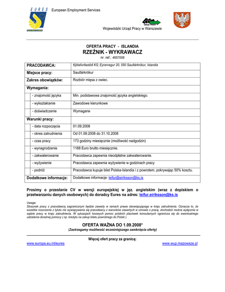 European Employment Services Wojewódzki Urząd Pracy w Warszawie OFERTA PRACY - ISLANDIA RZEŹNIK - WYKRAWACZ nr. ref.: 4657006 PRACODAWCA: Kjötafurðastöð KS; Eyrarvegur 20, 550 Sauðárkrókur, Islandia Miejsce pracy: Sauðárkrókur Zakres obowiązków: Rozbiór mięsa z owiec. Wymagania: - znajomość języka Min. podstawowa znajomość języka angielskiego. - wykształcenie Zawodowe kierunkowe - doświadczenie Wymagane Warunki pracy: - data rozpoczęcia 01.09.2008 - okres zatrudnienia Od 01.09.2008 do 31.10.2008 - czas pracy 173 godziny miesięcznie (moŜliwość nadgodzin) - wynagrodzenie 1168 Euro brutto miesięcznie. - zakwaterowanie Pracodawca zapewnia nieodpłatne zakwaterowanie. - wyŜywienie Pracodawca zapewnia wyŜywienie w godzinach pracy - podróŜ Pracodawca kupuje bilet Polska-Islandia i z powrotem, pokrywając 50% kosztu. Dodatkowe informacje: Dodatkowe informacje: leifur@[email protected] Prosimy o przesłanie CV w wersji europejskiej w jęz. angielskim (wraz z dopiskiem o przetwarzaniu danych osobowych) do doradcy Eures na adres: [email protected] Uwaga: Stosunek pracy z pracodawcą zagranicznym będzie zawarty w ramach prawa obowiązującego w kraju zatrudnienia. Oznacza to, Ŝe wszelkie roszczenie z tytułu nie wywiązywania się pracodawcy z warunków zawartych w umowie o pracę, dochodzić moŜna wyłącznie w sądzie pracy w kraju zatrudnienia. W sytuacjach losowych pomoc polskich placówek konsularnych ogranicza się do ewentualnego udzielenia doraźnej pomocy ( np. kredytu na zakup biletu powrotnego do Polski ). OFERTA WAśNA DO 1.09.2008* (Zastrzegamy moŜliwość wcześniejszego zamknięcia oferty) Więcej ofert pracy za granicą: www.europa.eu.int/eures www.wup.mazowsze.pl