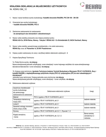 KRAJOWA DEKLARACJA WŁAŚCIWOŚCI UŻYTKOWYCH Nr. KDWU SM_12 1. Nazwa i nazwa handlowa wyrobu budowlanego: Kształtki drenarskie RAUDRIL PVC DN 100 – DN 350 2. Oznaczenie typu wyrobu budowlanego: − kształtki drenarskie RAUDRIL PVC-U 3. Zamierzone zastosowanie lub zastosowania: - do zewnętrznych sieci drenarskich i odwodnieniowych 4. Nazwa i adres siedziby producenta oraz miejsce produkcji wyrobu: REHAU AG+Co, 95104 Rehau, Niemcy. Fabryka1: REHAU AG + Co Schmidstraße 23, 94234 Viechtach, Niemcy 5. Nazwa i adres siedziby upoważnionego przedstawiciela, o ile został ustanowiony: REHAU Sp. z o.o. ul. Poznańska 1a, 62-081 Przeźmierowo 6. Krajowy system zastosowany do oceny i weryfikacji stałości właściwości użytkowych: 4 7. Krajowa Specyfikacja Techniczna: 7a. Polska Norma wyrobu: nie dotyczy Nazwa akredytowanej jednostki certyfikującej, numer akredytacji i numer krajowego certyfikatu lub nazwa akredytowanego laboratorium/laboratoriów i numer akredytacji: nie dotyczy 7b. Krajowa ocena techniczna: Aprobata Techniczna Instytutu Techniki Budowlanej w Warszawie ITB AT-15-8705/2016 „Rury i kształtki RAUDRIL z nieplastyfikowanego poli(chlorku winylu) (PVC-U) i polipropylenu (PP) do sieci odwadniających i drenażowych” Jednostka oceny technicznej / Krajowa jednostka oceny technicznej: nie dotyczy Nazwa akredytowanej jednostki certyfikującej, numer akredytacji i numer certyfikatu: nie dotyczy 8. Deklarowane właściwości użytkowe: Zasadnicze charakterystyki wyrobu budowlanego dla zamierzonego zastosowania lub zastosowań Materiał Temperatura mienienia wg. Vicata (VST) Liczba K Zawartość wolnego monomeru chlorku winylu (VCM) Wymiary Wygląd zewnętrzny i barwa Deklarowane właściwości użytkowe Uwagi PVC-U zgodne z ITB AT-15-8705/2016, pkt.3.1 zgodna z ITB AT-15-8705/2016, pkt.3.1 badanie materiału zgodna z ITB AT-15-8705/2016, pkt.3.1 badanie materiału zgodna z ITB AT-15-8705/2016, pkt.3.1 badanie materiału zgodna z ITB AT-15-8705/2016, pkt.3.2.1.1, Rysunek 1 i 2 zgodny z ITB AT-15-8705/2016, pkt. 3.2.1.2 Barwa warstwy zewnętrznej rur niebieska REHAU Sp. z o.o. Sprzedaż i Marketing Baranowo, ul. Poznańska 1A 62-081 Przeźmierowo k. Poznania Polska tel.: (+48) 61 84 98 400 fax: (+48) 61 84 98 401 www.rehau.pl Siedziba: Baranowo, ul. Poznańska 1A 62-081 Przeźmierowo k. Poznania Sąd Rejonowy Poznań - Nowe Miasto i Wilda w Poznaniu VIII Wydział Gospodarczy Krajowego Rejestru Sądowego Numer KRS: 0000049439 NIP: 781-00-16-806 Kapitał zakładowy: 46 500 000 zł Raiffeisen Bank Polska S.A. 53 1750 1019 0000 0000 0098 1017 Zasadnicze charakterystyki wyrobu budowlanego Deklarowane właściwości użytkowe dla zamierzonego zastosowania lub zastosowań Udarność kształtek RAUDRIL I i RAUDRIL II produkowanych zgodna z ITB AT-15-8705/2016, pkt. 3.2.1 Tablica 2 metoda wtrysku Szczelność połączeń z zgodna z ITB AT-15-8705/2016, pkt. 3.2.1 Tablica 2 pierścieniem uszczelniającym Cechowanie zgodne z ITB AT-15-8705/2016, pkt. 3.3 Uwagi Dotyczy połączeń kształtek 9. Właściwości użytkowe określonego powyżej wyrobu są zgodne z wszystkimi wymienionymi w pkt. 8 deklarowanymi właściwościami użytkowymi. Niniejsza krajowa deklaracja właściwości użytkowych wydana zostaje zgodnie z ustawą z dnia 16 kwietnia 2004r. o wyrobach budowlanych, na wyłączną odpowiedzialność producenta. W imieniu producenta podpisał(-a): Marcin Motylski Kierownik Działu Technicznego Infrastruktura i Inżynieria Środowiska ( imię i nazwisko oraz stanowisko) Poznań 02.01.2017 (miejsce i data wydania) ............................................. (podpis) REHAU Sp. z o.o. Sprzedaż i Marketing Baranowo, ul. Poznańska 1A 62-081 Przeźmierowo k. Poznania Polska tel.: (+48) 61 84 98 400 fax: (+48) 61 84 98 401 www.rehau.pl Siedziba: Baranowo, ul. Poznańska 1A 62-081 Przeźmierowo k. Poznania Sąd Rejonowy Poznań - Nowe Miasto i Wilda w Poznaniu VIII Wydział Gospodarczy Krajowego Rejestru Sądowego Numer KRS: 0000049439 NIP: 781-00-16-806 Kapitał zakładowy: 46 500 000 zł Raiffeisen Bank Polska S.A. 53 1750 1019 0000 0000 0098 1017