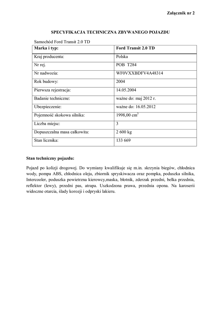 Załącznik nr 2 SPECYFIKACJA TECHNICZNA ZBYWANEGO POJAZDU Samochód Ford Transit 2.0 TD Marka i typ: Ford Transit 2.0 TD Kraj producenta: Polska Nr rej. POB T284 Nr nadwozia: WF0VXXBDFV4A48314 Rok budowy: 2004 Pierwsza rejestracja: 14.05.2004 Badanie techniczne: ważne do: maj 2012 r. Ubezpieczenie: ważne do: 16.05.2012 Pojemność skokowa silnika: 1998,00 cm3 Liczba miejsc: 3 Dopuszczalna masa całkowita: 2 600 kg Stan licznika: 133 669 Stan techniczny pojazdu: Pojazd po kolizji drogowej. Do wymiany kwalifikuje się m.in. skrzynia biegów, chłodnica wody, pompa ABS, chłodnica oleju, zbiornik spryskiwacza oraz pompka, poduszka silnika, Intercooler, poduszka powietrzna kierowcy,maska, błotnik, zderzak przedni, belka przednia, reflektor (lewy), przedni pas, atrapa. Uszkodzona prawa, przednia opona. Na karoserii widoczne otarcia, ślady korozji i odpryski lakieru.