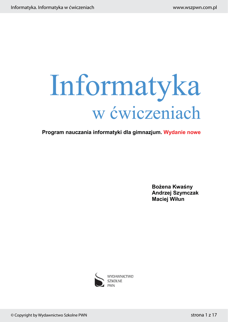 Informatyka. Informatyka w ćwiczeniach www.wszpwn.com.pl Informatyka w üwiczeniach Program nauczania informatyki dla gimnazjum. Wydanie nowe BoĪena KwaĞny Andrzej Szymczak Maciej Wiłun © Copyright by Wydawnictwo Szkolne PWN strona 1 z 17 Informatyka. Informatyka w ćwiczeniach www.wszpwn.com.pl Spis treĞci 1. Informacja o programie . . . . . . . . . . . . . . . . . . . . . . . . . . . . . . . . . . . . . . . . . . . . . . . . . . . . . . . 1.1. ZałoĪenia programu 3 ......................................................... 3 ....................................................... 3 ........................................................... 4 2. Szczegółowe cele edukacyjne kształcenia i wychowania . . . . . . . . . . . . . . . . . . . . . . . . . . 5 2.1. Szczegółowe cele kształcenia . . . . . . . . . . . . . . . . . . . . . . . . . . . . . . . . . . . . . . . . . . . . . . . . . . 5 2.2. Szczegółowe cele wychowania 7 1.2. Konstrukcja programu 1.3. Organizacja zajĊü ................................................ 3. Materiał nauczania związany ze szczegółowymi celami edukacyjnymi, uwzglĊdniający treĞci nauczania okreĞlone w Podstawie programowej kształcenia ogólnego . . . . . . . . . 8 3.1. Na dobry początek 8 .......................................................... 3.2. Internet i gromadzenie danych ................................................. 8 ................................................................ 9 3.4. Edytory tekstu i grafiki . . . . . . . . . . . . . . . . . . . . . . . . . . . . . . . . . . . . . . . . . . . . . . . . . . . . . . . 10 3.5. Arkusz kalkulacyjny . . . . . . . . . . . . . . . . . . . . . . . . . . . . . . . . . . . . . . . . . . . . . . . . . . . . . . . . . 11 3.6. Algorytmika i modelowanie . . . . . . . . . . . . . . . . . . . . . . . . . . . . . . . . . . . . . . . . . . . . . . . . . . . 12 3.7. Zarządzanie informacją . . . . . . . . . . . . . . . . . . . . . . . . . . . . . . . . . . . . . . . . . . . . . . . . . . . . . . . 13 4. Procedury osiągania szczegółowych celów edukacyjnych . . . . . . . . . . . . . . . . . . . . . . . . . 14 5. Opis osiągniĊü ucznia i propozycje metod ich oceny . . . . . . . . . . . . . . . . . . . . . . . . . . . . . 16 6. Omówienie załoĪeĔ dydaktycznych i wychowawczych . . . . . . . . . . . . . . . . . . . . . . . . . . . 17 3.3. Multimedia Informatyka w üwiczeniach Program nauczania informatyki w gimnazjum BoĪena KwaĞny, Andrzej Szymczak, Maciej Wiłun Copyright © by Wydawnictwo Szkolne PWN Sp. z o.o. 2 © Copyright by Wydawnictwo Szkolne PWN strona 2 z 17 Informatyka. Informatyka w ćwiczeniach www.wszpwn.com.pl 1. Informacja o programie Program niniejszy jest autorską propozycją nauczania informatyki w gimnazjum. Program jest zgodny z Podstawą programową nauczania informatyki obowiązującą w gimnazjum od roku szkolnego 2009/2010. 1.1. ZałoĪenia programu WiĊkszoĞü uczniów ma w domu komputer ze stałym dostĊpem do Internetu i na co dzieĔ z niego korzysta. Z rozmów z uczniami wynika, Īe najczĊstszym sposobem wykorzystania go jest rozrywka, np. gry i nieuporządkowane korzystanie z zasobów Internetu, a szczególnie z komunikatorów. Są jednak teĪ tacy uczniowie, którzy korzystają z komputera przy opracowywaniu zadaĔ domowych, wykorzystują dostĊpne encyklopedie multimedialne, kursy jĊzykowe czy wiadomoĞci wyszukane w Internecie. Uczniowie gimnazjum to młodzi ludzie, którzy po ukoĔczeniu tego etapu kształcenia staną przed wyborem dalszej drogi edukacyjnej. Wybór ten bĊdzie miał wpływ na wykonywany przez nich w przyszłoĞci zawód. W dobie globalizacji i informatyzacji społeczeĔstwa zadaniem szkoły jest przygotowanie ucznia do korzystania z komputera w celu rozwiązywania problemów oraz uzyskiwania, gromadzenia, porządkowania i przetwarzania informacji. Kształcenie w gimnazjum powinno sprzyjaü rozwojowi samodzielnego myĞlenia oraz uczyü odpowiedzialnoĞci za podejmowane działania zarówno w kwestii bezpiecznego korzystania z oprogramowania, jak równieĪ wykorzystania ogólnodostĊpnej sieci Internet. Szczególnie na lekcjach informatyki, naleĪy zwróciü uwagĊ na üwiczenia praktyczne, które sprzyjają samodzielnemu zdobywaniu wiedzy teoretycznej, takĪe jej utrwalaniu i zdobywaniu nowych umiejĊtnoĞci pod kierunkiem nauczyciela. Dobór zadaĔ oraz problemów powinien zachĊcaü uczniów do samodzielnej pracy, a takĪe rodziü potrzebĊ uĪywania narzĊdzi informatycznych. WaĪne jest teĪ, aby uczniowie mogli na informatyce wykorzystywaü wiadomoĞci zdobyte na innych przedmiotach i we wczeĞniejszych etapach edukacyjnych, a takĪe mogli analizowaü zjawiska, sytuacje, zadania i problemy z Īycia codziennego. 1.2. Konstrukcja programu Podczas konstruowania programu przyjĊliĞmy załoĪenie, Īe naleĪy uczniów na początku nauki zachĊciü do korzystania z komputera w celu zdobywania umiejĊtnoĞci prawidłowego posługiwania siĊ jego oprogramowaniem. TreĞci Podstawy programowej zostały rozwiniĊte w nastĊpującej kolejnoĞci: 1. Na dobry początek – zapoznanie uczniów z podstawowymi elementami budowy i obsługi komputera, systemem operacyjnym i jego elementami oraz okreĞlenie, jakie umiejĊtnoĞci i wiadomoĞci uczniowie mają po szkole podstawowej. 2. Internet i gromadzenie danych – zapoznanie uczniów z zasadami wyszukiwania informacji w Internecie, jej gromadzenia i wykorzystywania, zasadami etykiety podczas korzystania z komunikatorów oraz poczty elektronicznej. 3. Multimedia – wykonywanie prezentacji multimedialnych zawierających tekst, grafikĊ i dĨwiĊk z wykorzystaniem własnych materiałów uczniów, informacji uzyskanych w Internecie, a takĪe materiałów wypracowanych na innych lekcjach. Informatyka w üwiczeniach Program nauczania informatyki w gimnazjum BoĪena KwaĞny, Andrzej Szymczak, Maciej Wiłun Copyright © by Wydawnictwo Szkolne PWN Sp. z o.o. 3 © Copyright by Wydawnictwo Szkolne PW