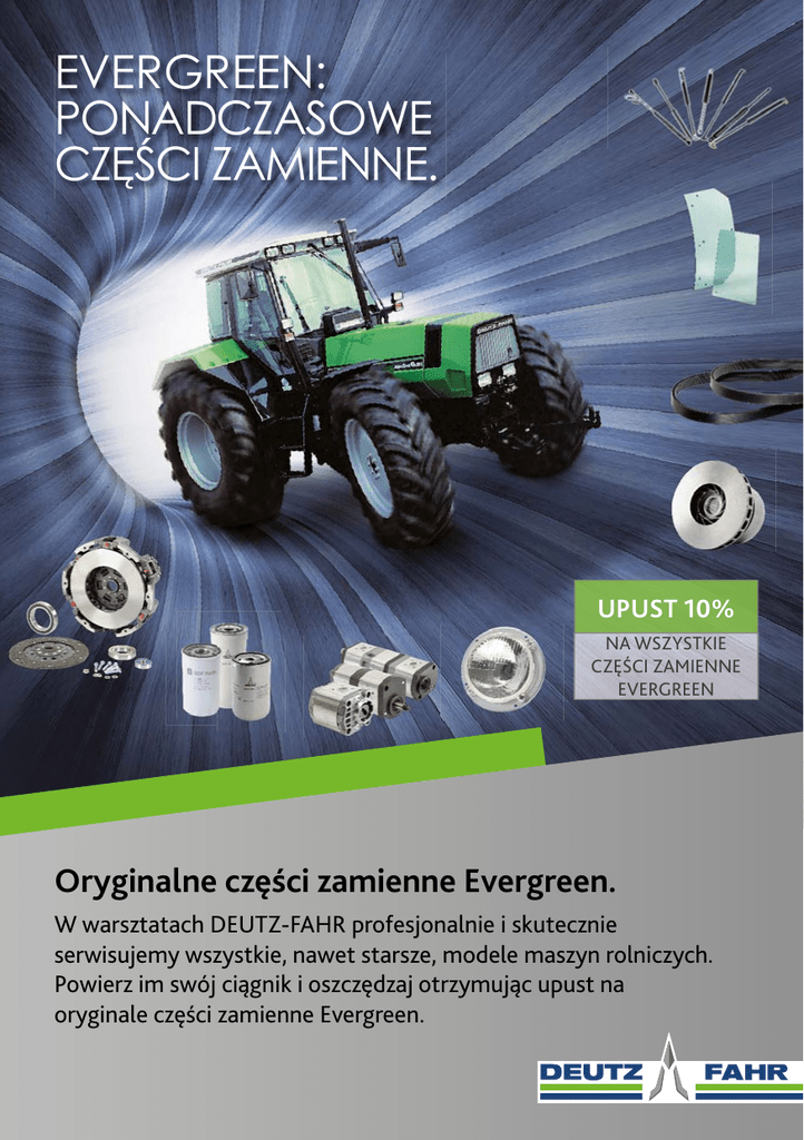 EVERGREEN: PONADCZASOWE CZĘŚCI ZAMIENNE. UPUST 10% NA WSZYSTKIE CZĘŚCI ZAMIENNE EVERGREEN Oryginalne części zamienne Evergreen. W warsztatach DEUTZ-FAHR profesjonalnie i skutecznie serwisujemy wszystkie, nawet starsze, modele maszyn rolniczych. Powierz im swój ciągnik i oszczędzaj otrzymując upust na oryginale części zamienne Evergreen. PROMOCJA EVERGREEN Oto, dlaczego warto wybrać części zamienne Evergreen: EVERGREEN TO GAMA ORYGINALNYCH, OBJĘTYCH GWARANCJĄ CZĘŚCI ZAMIENNYCH, KTÓRE ZAPEWNIAJĄ NAWET DZIESIĘCIOLETNIM MASZYNOM PEŁNĄ WYDAJNOŚĆ. Firma DEUTZ-FAHR dedykuje linię produktów EVERGREEN starszym modelom, które w pracach polowych w dalszym ciągu pokazują swój potencjał. Zachęcamy, aby powierzyć przegląd swojego ciągnika dealerowi DEUTZ-FAHR: otrzymasz upust w wysokości 10% na produkty z linii EVERGREEN oraz na wszystkie inne oryginalne części zamienne użyte w trakcie serwisowania*. -10% • W 100% oryginalne części zamienne, w pełni kompatybilne i niezawodne • Jakość certyfikowana przez DEUTZ-FAHR • Gwarancja 12-miesięczna • Korzystne ceny Maszyny objęte programem EVERGREEN: • • • • • • • • • D06 D07 D07C DX DX 3 SC DX 3 V/F/S DX 3 VC DX 4 DX 6 • • • • • • DX 7 DX 8 INTRAC AGROPRIMA AGROSTAR AGROSTAR FREISICHT • AGROSTAR TG SKORZYSTAJ Z OFERTY WAŻNA DO 31 MARCA Aby uzyskać więcej informacji, skontaktuj się ze swoim dealerem DEUTZ-FAHR lub odwiedź stronę deutz-fahr.com. Obserwuj nas na facebook.com/deutzfahr DEUTZ-FAHR jest marką grupy * Oferta obowiązuje od 13 lutego do 31 marca 2017 roku i jest ważna tylko w przypadku zakupu produktu u autoryzowanych dealerów biorących udział w akcji. Oferta dotyczy wyłącznie modeli ciągników objętych programem Evergreen. Nie łączy się z innymi aktualnymi promocjami.