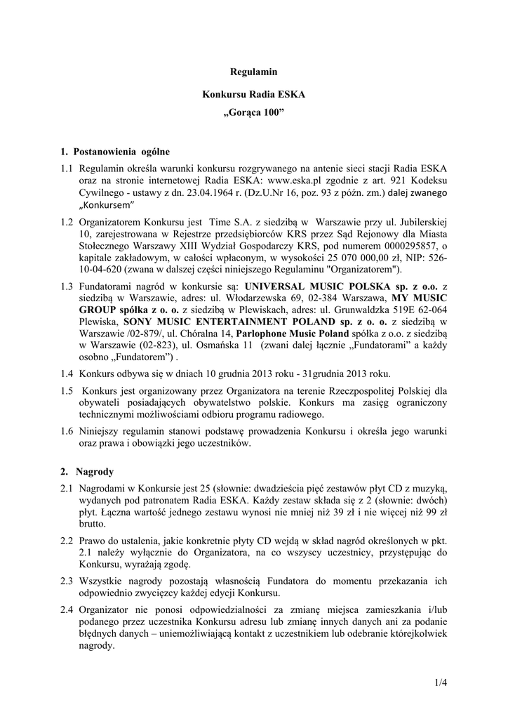 Regulamin Konkursu Radia ESKA „Gorąca 100” 1. Postanowienia ogólne 1.1 Regulamin określa warunki konkursu rozgrywanego na antenie sieci stacji Radia ESKA oraz na stronie internetowej Radia ESKA: www.eska.pl zgodnie z art. 921 Kodeksu Cywilnego - ustawy z dn. 23.04.1964 r. (Dz.U.Nr 16, poz. 93 z późn. zm.) dalej zwanego „Konkursem” 1.2 Organizatorem Konkursu jest Time S.A. z siedzibą w Warszawie przy ul. Jubilerskiej 10, zarejestrowana w Rejestrze przedsiębiorców KRS przez Sąd Rejonowy dla Miasta Stołecznego Warszawy XIII Wydział Gospodarczy KRS, pod numerem 0000295857, o kapitale zakładowym, w całości wpłaconym, w wysokości 25 070 000,00 zł, NIP: 52610-04-620 (zwana w dalszej części niniejszego Regulaminu "Organizatorem"). 1.3 Fundatorami nagród w konkursie są: UNIVERSAL MUSIC POLSKA sp. z o.o. z siedzibą w Warszawie, adres: ul. Włodarzewska 69, 02-384 Warszawa, MY MUSIC GROUP spółka z o. o. z siedzibą w Plewiskach, adres: ul. Grunwaldzka 519E 62-064 Plewiska, SONY MUSIC ENTERTAINMENT POLAND sp. z o. o. z siedzibą w Warszawie /02-879/, ul. Chóralna 14, Parlophone Music Poland spółka z o.o. z siedzibą w Warszawie (02-823), ul. Osmańska 11 (zwani dalej łącznie „Fundatorami” a każdy osobno „Fundatorem”) . 1.4 Konkurs odbywa się w dniach 10 grudnia 2013 roku - 31grudnia 2013 roku. 1.5 Konkurs jest organizowany przez Organizatora na terenie Rzeczpospolitej Polskiej dla obywateli posiadających obywatelstwo polskie. Konkurs ma zasięg ograniczony technicznymi możliwościami odbioru programu radiowego. 1.6 Niniejszy regulamin stanowi podstawę prowadzenia Konkursu i określa jego warunki oraz prawa i obowiązki jego uczestników. 2. Nagrody 2.1 Nagrodami w Konkursie jest 25 (słownie: dwadzieścia pięć zestawów płyt CD z muzyką, wydanych pod patronatem Radia ESKA. Każdy zestaw składa się z 2 (słownie: dwóch) płyt. Łączna wartość jednego zestawu wynosi nie mniej niż 39 zł i nie więcej niż 99 zł brutto. 2.2 Prawo do ustalenia, jakie konkretnie płyty CD wejdą w skład nagród określonych w pkt. 2.1 należy wyłącznie do Organizatora, na co wszyscy uczestnicy, przystępując do Konkursu, wyrażają zgodę. 2.3 Wszystkie nagrody pozostają własnością Fundatora do momentu przekazania ich odpowiednio zwycięzcy każdej edycji Konkursu. 2.4 Organizator nie ponosi odpowiedzialności za zmianę miejsca zamieszkania i/lub podanego przez uczestnika Konkursu adresu lub zmianę innych danych ani za podanie błędnych danych – uniemożliwiającą kontakt z uczestnikiem lub odebranie którejkolwiek nagrody. 1/4 2.5 Organizator nie ponosi odpowiedzialności za niemożność odbioru lub nieodebranie którejkolwiek nagrody, z jakiejkolwiek przyczyny leżącej po stronie nagrodzonego uczestnika. 2.6 Nagrody zostaną wydane zgodnie z niniejszym regulaminem oraz z obowiązującymi przepisami prawa podatkowego. 2.7 Nagrody według decyzji Organizatora będą dostarczone zwycięzcy każdej edycji Konkursu do miejsca ich zamieszkania lub będą do odbioru we wskazanych przez Organizatora oddziałach Radia Eska. 2.8 Zwycięzcy każdej edycji Konkursu zobowiązani są odebrać wygrane nagrody w terminie do dnia 31 stycznia 2014 r. W przypadku ich nieodebrania w tym terminie, zwycięzca odpowiednio każdej edycji Konkursu traci do niej prawo (w tym również prawo domagania się jej wydania przez Organizatora lub Fundatorów). 3 Zasady Konkursu 3.1 W Konkursie mogą brać udział osoby zarejestrowane w klubie Radia ESKA. 3.2 Konkurs trwa od 10 grudnia 2013 roku do 31 grudnia 2013 roku W tym czasie odbędzie się 25 edycji Konkursu organizowanych wg harmonogramu: - w dniach od 10 grudnia 2013 roku do 30 grudnia 2013 r. codziennie z wyjątkiem wszystkich niedziel oraz wtorku 24. grudnia - po jednej edycji Konkursu w programie „Gorąca 20”, emitowanym między 18:00 a 20:00 - dnia 31 grudnia 2013 r. 8 (osiem) edycji Konkursu między godziną 12:00 a 20:00 w programie „Gorąca 100” 3.3 Zgłoszenie do Konkursu następuje przez kompletne wypełnienie a następnie nadesłanie do Organizatora formularza konkursowego przeznaczonego do niniejszego Konkursu, dostępnego na stronie www.eska.pl/goraca100, w terminie od początku trwania Konkursu do dnia 30 grudnia 2013 r. do północy. 3.4 Kompletne wypełnienie formularza konkursowego polega na podaniu co najmniej jednego wykonawcy i tytułu utworu, który zdaniem uczestnika jest najlepszym hitem 2013 spośród listy hitów dostępnych na stronie www.eska.pl/goraca100_2013 oraz ciekawe uzasadnienie wyboru tego hitu (czyli oddaniu w ten sposób głosu na dany hit). 3.5 Uczestnik Konkursu na każdy z hitów może oddać tylko jeden głos dziennie. 3.6 Uczestnik Konkursu jest zwycięzcą edycji Konkursu i zdobywcą nagrody, o której mowa w pkt. 2.1 jeśli– w ocenie powołanej przez Organizatora komisji konkursowej - w zgłoszeniu do Konkursu najciekawiej uzasadnił swój wybór hitu 2013 roku, odebrał połączenie telefoniczne od Organizatora - zgodnie z pkt. 3.7 i wziął udział w wejściu finałowym danej edycji Konkursu. Komisja konkursowa przy ocenie najciekawszego zgłoszenia będzie brać pod uwagę pomysłowość, oryginalność i trafność formułowania wypowiedzi. 3.7 Po wyborze najciekawszego zgłoszenia każdej edycji Konkursu Organizator łączy się telefonicznie z uczestnikiem, który je nadesłał. Uczestnik ten zobowiązany jest odebrać połączenie telefoniczne od Organizatora. Próba uzyskania połączenia z każdym uczestnikiem podejmowana jest maksymalnie dwukrotnie (każda próba trwa do 5 sygnałów) a w przypadku rozłączenia w trakcie rozmowy przed wejściem na antenę 2/4 Radia Eska, próba ponownego połączenia podejmowana jest tylko raz (próba taka trwa do 5 sygnałów). Jeżeli pomimo podjęcia prób połączenia lub ponownego połączenia nie zostanie nawiązane połączenie z danym uczestnikiem, to uczestnik ten traci szansę na pojawienie się na antenie w od