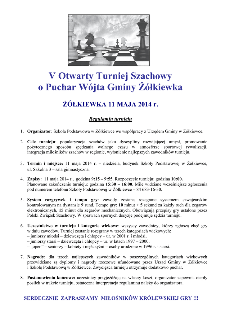 V Otwarty Turniej Szachowy o Puchar Wójta Gminy Żółkiewka ŻÓŁKIEWKA 11 MAJA 2014 r. Regulamin turnieju 1. Organizator: Szkoła Podstawowa w Żółkiewce we współpracy z Urzędem Gminy w Żółkiewce. 2. Cele turnieju: popularyzacja szachów jako dyscypliny rozwijającej umysł, promowanie pożytecznego sposobu spędzania wolnego czasu w atmosferze sportowej rywalizacji, integracja miłośników szachów w regionie, wyłonienie najlepszych zawodników turnieju. 3. Termin i miejsce: 11 maja 2014 r. – niedziela, budynek Szkoły Podstawowej w Żółkiewce, ul. Szkolna 3 – sala gimnastyczna. 4. Zapisy: 11 maja 2014 r., godzina 9:15 – 9:55. Rozpoczęcie turnieju: godzina 10:00. Planowane zakończenie turnieju: godzina 15:30 – 16:00. Mile widziane wcześniejsze zgłoszenia pod numerem telefonu Szkoły Podstawowej w Żółkiewce – 84 683-16-30. 5. System rozgrywek i tempo gry: zawody zostaną rozegrane systemem szwajcarskim kontrolowanym na dystansie 9 rund. Tempo gry: 10 minut + 5 sekund za każdy ruch dla zegarów elektronicznych, 15 minut dla zegarów mechanicznych. Obowiązują przepisy gry ustalone przez Polski Związek Szachowy. W sprawach spornych decyzje podejmuje sędzia turnieju. 6. Uczestnictwo w turnieju i kategorie wiekowe: wszyscy zawodnicy, którzy zgłoszą chęć gry w dniu zawodów. Turniej zostanie rozegrany w trzech kategoriach wiekowych: – juniorzy młodsi – dziewczęta i chłopcy – ur. w 2001 r. i młodsi, – juniorzy starsi – dziewczęta i chłopcy – ur. w latach 1997 – 2000, – „open” – seniorzy – kobiety i mężczyźni – osoby urodzone w 1996 r. i starsi. 7. Nagrody: dla trzech najlepszych zawodników w poszczególnych kategoriach wiekowych przewidziane są dyplomy i nagrody rzeczowe ufundowane przez Urząd Gminy w Żółkiewce i Szkołę Podstawową w Żółkiewce. Zwycięzca turnieju otrzymuje dodatkowo puchar. 8. Postanowienia końcowe: uczestnicy przyjeżdżają na własny koszt, organizator zapewnia ciepły posiłek w trakcie turnieju, ostateczna interpretacja regulaminu należy do organizatora. SERDECZNIE ZAPRASZAMY MIŁOŚNIKÓW KRÓLEWSKIEJ GRY !!!