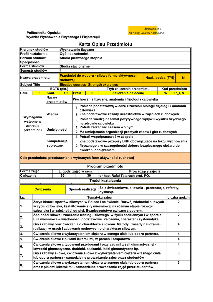 Załącznik nr 1 Politechnika Opolska Wydział Wychowania Fizycznego i Fizjoterapii do Księgi Jakości Kształcenia Karta Opisu Przedmiotu Kierunek studiów Profil kształcenia Poziom studiów Specjalność Forma studiów Semestr studiów Wychowanie fizyczne Ogólnoakademicki Studia pierwszego stopnia Studia stacjonarne I Przedmiot do wyboru - siłowe formy aktywności Nauki podst. (T/N) N ruchowej Elective courses -Strength exercises ECTS (pkt.) Tryb zaliczenia przedmiotu Kod przedmiotu Kont. 1,2 Prakt. 0 Zaliczenie na ocenę WFL027_I, N Nazwy Wychowania fizyczne, anatomia i fizjologia człowieka przedmiotów Posiada podstawową wiedzę z zakresu biologii fizjologii i anatomii 1. człowieka Wiedza 2. Zna podstawowe zasady uczestnictwa w zajeciach ruchowych Nazwa przedmiotu Subject Title Całk. 3 Wymagania wstępne w zakresie przedmiotu 3. Umiejętności Kompetencje społeczne 1. 2. 1. 2. Posiada wiedzę na temat pozytywnego wpływu wysiłku fizycznego na zdrowie człowieka Potrafi zarządzać czasem wolnym Ma umiejętność organizacji prostych zabaw i gier ruchowych Potrafi współpracować w zespole Zna podstawowe przepisy BHP obowiązujące na lekcji wychowania fizycznego a w szczególności doboru bezpiecznego ciężaru do ćwiczeń obciążeniem Cele przedmiotu: przedstawienie wybranych form aktywności ruchowej Program przedmiotu Forma zajęć Ćwiczenia Wykład Ćwiczenia Lp. 1. 2. 3. 4. 5. 6. 7. 8. L. godz. zajęć w sem. Prowadzący zajęcia 65 30 | dr hab. Rafał Tataruch prof. PO, | Treści kształcenia Sposób realizacji Sposób realizacji Sale ćwiczeniowe, siłownia - prezentacje, referaty, dyskusja Tematyka zajęć Zarys historii sportów siłowych w Polsce i na świecie. Rozwój zdolności siłowych w życiu człowieka, kształtowanie siły mięśniowej na różnym etapie rozwoju człowieka i w zależności od płci. Bezpieczeństwo ćwiczeń z oporem. Zdolności siłowe i znaczenie treningu siłowego w życiu codziennym i w sporcie. Siła mięśniowa – wiadomości podstawowe. Założenia, charakter i systematyka ćwiczeń siłowych. Metody kształtowania siły mięśniowej u dzieci i młodzieży. Gry i zabawy oraz ćwiczenia o charakterze siłowym. Metody i zasady nauczania i realizacji w grach i zabawach ruchowych o charakterze siłowym. Liczba godzin 2 2 4 Ćwiczenia siłowe z wykorzystaniem ciężaru własnego ciała lub oporu partnera, ćwiczenia parach i trójkach. Ćwiczenia w siłowe z piłkami lekarskimi, w parach i zespołowo 4 Ćwiczenia siłowe z typowymi przyborami i przyrządami z sali gimnastycznej ławeczki gimnastyczne, drabinki, skakanki, laski gimnastyczne itp. Gry i zabawy siłowe, ćwiczenia siłowe z wykorzystaniem ciężaru własnego ciała lub oporu partnera - samodzielne prowadzenie zajęć przez studentów Ćwiczenia siłowe z wykorzystaniem ciężaru własnego ciała lub oporu partnera oraz z piłkami lekarskimi - samodzielne prowadzenie zajęć przez studentów 4 4 3 3 9. 10. Ćwiczenia siłowe piłkami lekarskimi, ćwiczenia siłowe z typowymi przyborami i przyrządami z sali gimnastycznej- samodzielne prowadzenie zajęć przez studentów Ćwiczenia siłowe z taśmami gumowymi. Sprawdzian teoretyczny z przerobionego materiału. Zaliczenie przedmiotu 2 2 11. L. godz. pracy własnej studenta 35 L. godz. kontaktowych w sem. 30 Sposoby sprawdzenia zamierzonych Aktywność na zajęciach, sprawdziany, wypowiedzi ustne efektów kształcenia Wiedza K_W12 Definiuje cele i funkcje edukacji w procesie zrównoważonego rozwoju dziecka. Określa uwarunkowania 1. zdrowia i znaczenie rozwoju siły mięśniowej w profilaktyce patologii 4. K_U01 Posiada umiejętności techniczne wykonywania 1. podstawowych ćwiczeń siłowych K_U02 Potrafi wykorzystać podstawowy przybory 2. dydaktyczne do przeprowadzenia zajęć wf o charakterze siłowym Umiejętności K_U14 Wspiera uczestnictwo i aktywność dzieci na zajęciach ruchowych poprzez tworzenie odpowiednich warunków i 3. atmosfery. Posiada umiejętności animacji czasu wolnego K_U15 Posiada specjalistyczne umiejętności ruchowe wykorzystywane w kształtowaniu siły mięśniowej. Potrafi 4. zademonstrować technikę ruchu ćwiczeń kształtujących siłę mięśniową Efekty kształcenia dla przedmiotu - po zakończonym cyklu kształcenia K_K04 Wykazuje umiejętności empatycznego rozumienia i 1. potrafi wyrażać uczucia. Wykazuje cechy refleksyjnego praktyka K_K10 Ma świadomość konieczności prowadzenia zindywidualizowanych działań dydaktycznych i wychowawczych w stosunku do uczniów ze specjalnymi 2. potrzebami edukacyjnymi. Potrafi dobrać ćwiczenia do potrzeb i umiejętności ćwiczących Kompetencje społeczne K_K11 Jest odpowiedzialny za uczestników zajęć dydaktycznych. Wykazuje troskę o bazę dydaktyczną i 3. powierzony sprzęt. Jest świadomy znaczenia systematycznego przeglądu K_K13 Aktywnie uczestniczy w różnych formach aktywności fizycznej. Jest świadomy znaczenia doskonalenia sprawności fizycznej i umiejętności ruchowych oraz samokreacji w 4. zakresie kształcenia i rozwoju pożądanych postaw zdrowego stylu życia Metody dydaktyczne: Wykład informacyjny, prezentacje multimedialne, dyskusje, warsztaty grupowe, konsultacje, zajęcia praktyczne (ruchowe) aktywizujące uczestników zajęć Forma i warunki zaliczenia przedmiotu: • Uzyskanie co najmniej 80% frekwencji na ćwiczeniach • Opanowanie materiału, którego potwierdzeniem będzie zaliczenie na ocenę pozytywną kolokwium semestralnego. SZCZEGÓŁOWE WARUNKI ZALICZENIA PRZEDMIOTU Uzyskanie łącznie minimum 36 punktów za elementy składowe oceny: - 24 pkt. za obecność na zajęciach 1 – 2 pkt za zajęcia - Zaliczenie sprawdzianu teoretycznego 6 - 10 pkt. - Samodzielne prowadzenie zajęć lub w grupie (pedagogizacja) 6 –10 pkt. SKALA OCEN • bdb 48 i więcej • db + 45 - 47 • db 42 - 44 • dost + 39 - 41 • dost 36 - 38 • Opanowanie materiału, którego potwierdzeniem będzie zaliczenie na ocenę pozytywn