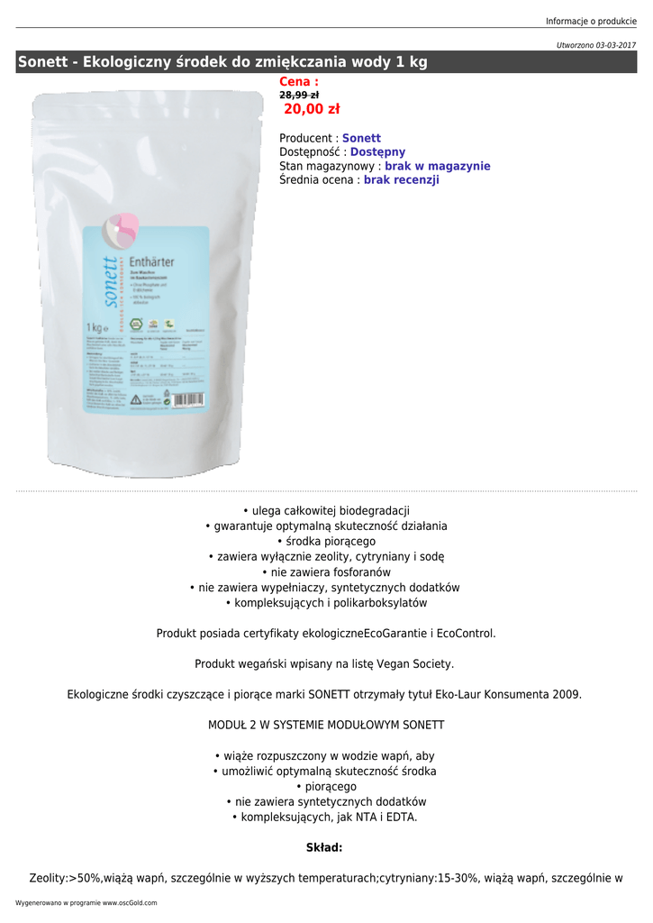 Informacje o produkcie Utworzono 03-03-2017 Sonett - Ekologiczny środek do zmiękczania wody 1 kg Cena : 28,99 zł 20,00 zł Producent : Sonett Dostępność : Dostępny Stan magazynowy : brak w magazynie Średnia ocena : brak recenzji • ulega całkowitej biodegradacji • gwarantuje optymalną skuteczność działania • środka piorącego • zawiera wyłącznie zeolity, cytryniany i sodę • nie zawiera fosforanów • nie zawiera wypełniaczy, syntetycznych dodatków • kompleksujących i polikarboksylatów Produkt posiada certyfikaty ekologiczneEcoGarantie i EcoControl. Produkt wegański wpisany na listę Vegan Society. Ekologiczne środki czyszczące i piorące marki SONETT otrzymały tytuł Eko-Laur Konsumenta 2009. MODUŁ 2 W SYSTEMIE MODUŁOWYM SONETT • wiąże rozpuszczony w wodzie wapń, aby • umożliwić optymalną skuteczność środka • piorącego • nie zawiera syntetycznych dodatków • kompleksujących, jak NTA i EDTA. Skład: Zeolity:>50%,wiążą wapń, szczególnie w wyższych temperaturach;cytryniany:15-30%, wiążą wapń, szczególnie w Wygenerowano w programie www.oscGold.com niższych temperaturach; soda:15-30%, wspomaga proces wytrącania wapnia. Produkt nie zawiera: • surowców petrochemicznych • syntetycznych środków zapachowych • syntetycznych barwników • syntetycznych konserwantów • surowców modyfikowanych genetycznie • enzymów • składników alergizujących • fosforanów • wybielaczy optycznych • zwierzęcych tłuszczy i innych surowców • z martwych zwierząt