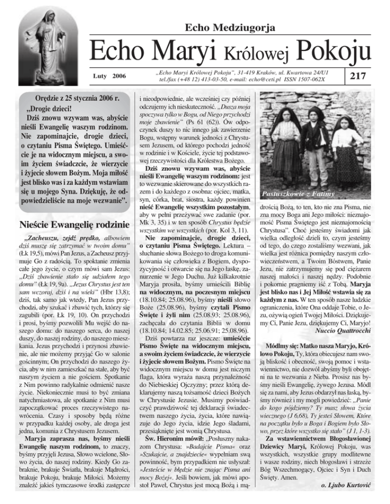 Echo Medziugorja Echo Maryi Królowej Pokoju Luty 2006 Or´dzie z 25 stycznia 2006 r. „Drogie dzieci! DziÊ znowu wzywam was, abyÊcie nieÊli Ewangeli´ waszym rodzinom. Nie zapominajcie, drogie dzieci, o czytaniu Pisma Âwi´tego. UmieÊçcie je na widocznym miejscu, a swoim ˚yciem Êwiadczcie, ˚e wierzycie i ˚yjecie s∏owem Bo˚ym. Moja mi∏oÊç jest blisko was i za ka˚dym wstawiam si´ u mojego Syna. Dzi´kuj´, ˚e odpowiedzieliÊcie na moje wezwanie”. NieÊcie Ewangeli´ rodzinie „Zacheuszu, zejd˝ pr´dko, albowiem dziÊ musz´ si´ zatrzymaç w twoim domu” (∑k 19,5), mówi Pan Jezus, a Zacheusz przyjmuje Go z radoÊcià. To spoktanie zmienia ca∏e jego ˚ycie, o czym mówi sam Jezus: „DziÊ zbawienie sta∏o si´ udzia∏em tego domu” (∑k 19, 9a). „Jezus Chrystus jest ten sam wczoraj, dziÊ i na wieki” (Hbr 13,8); dziÊ, tak samo jak wtedy, Pan Jezus przychodzi, aby szukaç i zbawiç tych, którzy si´ zagubili (por. ∑k 19, 10). On przychodzi i prosi, byÊmy pozwolili Mu wejÊç do naszego domu: do naszego serca, do naszej duszy, do naszej rodziny, do naszego mieszkania. Jezus przychodzi i przynosi zbawienie, ale nie mo˚emy przyjàç Go w salonie goÊcinnym; On przychodzi do naszego ˚ycia, aby w nim zamieszkaç na sta∏e, aby byç naszym ˚yciem a nie goÊciem. Spotkanie z Nim powinno radykalnie odmieniç nasze ˚ycie. Niekoniecznie musi to byç zmiana natychmiastowa, ale spotkanie z Nim musi zapoczàtkowaç proces rzeczywistego nawrócenia. Czasy i sposoby b´dà ró˚ne w przypadku ka˚dej osoby, ale droga jest jedna, komunia z Chrystusem Jezusem. Maryja zaprasza nas, byÊmy nieÊli Ewangeli´ naszym rodzinom, to znaczy, byÊmy przyj´li Jezusa, S∏owo wcielone, S∏owo ˚ycia, do naszej rodziny. Kiedy Go zabraknie, brakuje Âwiat∏a, brakuje MàdroÊci, brakuje Pokoju, brakuje Mi∏oÊci. Mo˚emy znale˝ç jakieÊ tymczasowe Êrodki zast´pcze „Echo Maryi Królowej Pokoju”, 31-419 Kraków, ul. Kwartowa 24/U1 tel./fax (+48 12) 413-03-50, e-mail: [email protected] ISSN 1507-062X i nieodpowiednie, ale wczeÊniej czy pó˝niej odczujemy ich nieskutecznoÊç. „Dusza moja spoczywa tylko w Bogu, od Niego przychodzi moje zbawienie” (Ps 61 (62)). Ów odpoczynek duszy to nic innego jak zawierzenie Bogu, wst´pny warunek jednoÊci z Chrystusem Jezusem, od którego pochodzi jednoÊç w rodzinie i w KoÊciele, ˚ycie tej podstawowej rzeczywistoÊci dla Królestwa Bo˚ego. DziÊ znowu wzywam was, abyÊcie nieÊli Ewangeli´ waszym rodzinom: jest to wezwanie skierowane do wszystkich razem i do ka˚dego z osobna: ojciec, matka, syn, córka, brat, siostra, ka˚dy powinien nieÊç Ewangeli´ wszystkim pozosta∏ym, aby w pe∏ni prze˚ywaç swe zadanie (por. Mk 3, 35) i w ten sposób Chrystus b´dzie wszystkim we wszystkich (por. Kol 3, 11). Nie zapominajcie, drogie dzieci, o czytaniu Pisma Âwi´tego. Lektura – s∏uchanie s∏owa Bo˚ego to droga komunikowania si´ cz∏owieka z Bogiem, dyspozycyjnoÊç i otwarcie si´ na Jego ∏ask´, zanurzenie w Jego Duchu. Ju˚ kilkakrotnie Maryja prosi∏a, byÊmy umieÊcili Bibli´ na widocznym, na poczesnym miejscu (18.10.84; 25.08.96), byÊmy nieÊli s∏owo Bo˚e (25.08.96), byÊmy czytali Pismo Âwi´te i ˚yli nim (25.08.93; 25.08.96), zach´ca∏a do czytania Biblii w domu (18.10.84; 14.02.85; 25.06.91; 25.08.96). DziÊ powtarza raz jeszcze: umieÊçcie Pismo Âwi´te na widocznym miejscu, a swoim ˚yciem Êwiadczcie, ˚e wierzycie i ˚yjecie s∏owem Bo˚ym. Pismo Âwi´te na widocznym miejscu w domu jest niczym flaga, która wyra˚a naszà przynale˚noÊç do Niebieskiej Ojczyzny; przez którà deklarujemy naszà to˚samoÊç dzieci Bo˚ych w Chrystusie Jezusie. Musimy poÊwiadczyç prawdziwoÊç tej deklaracji Êwiadectwem naszego ˚ycia, ˚ycia, które nawiàzuje do Jego ˚ycia, idzie Jego Êladami, przesiàkni´te jest wonià Chrystusa. Âw. Hieronim mówi∏: „Pos∏uszny nakazom Chrystusa: »Badajcie Pisma« oraz »Szukajcie, a znajdziecie« wype∏niam swà powinnoÊç, bym przypadkiem nie us∏ysza∏: »JesteÊcie w b∏´dzie nie znajàc Pisma ani mocy Bo˚ej«. JeÊli bowiem, jak mówi aposto∏ Pawe∏, Chrystus jest mocà Bo˚à i mà- 217 Pastuszkowie z Fatimy droÊcià Bo˚à, to ten, kto nie zna Pisma, nie zna mocy Boga ani Jego mi∏oÊci: nieznajomoÊç Pisma Âwi´tego jest nieznajomoÊcià Chrystusa”. Choç jesteÊmy Êwiadomi jak wielka odleg∏oÊç dzieli to, czym jesteÊmy od tego, do czego zostaliÊmy wezwani, jak wielka jest ró˚nica pomi´dzy naszym cz∏owieczeƒstwem, a Twoim Bóstwem, Panie Jezu, nie zatrzymujemy si´ pod ci´˚arem naszej ma∏oÊci i naszej n´dzy. Podobnie i pokornie pragniemy iÊç z Tobà. Maryja jest blisko nas i Jej Mi∏oÊç wstawia si´ za ka˚dym z nas. W ten sposób nasze ludzkie ograniczenia, które Ona oddaje Tobie, o Jezu, o˚ywià ogieƒ Twojej Mi∏oÊci. Dzi´kujemy Ci, Panie Jezu, dzi´kujemy Ci, Maryjo! Nuccio Quattrocchi Módlmy si´: Matko nasza Maryjo, Królowo Pokoju, Ty, która obiecujesz nam swojà bliskoÊç i obecnoÊç, swojà pomoc i wstawiennictwo, nie dozwól abyÊmy byli oboj´tni na te wezwania z Nieba. Prosisz nas byÊmy nieÊli Ewangeli´, ˚ywego Jezusa. Módl si´ za nami, aby Jezus obdarzy∏ nas ∏askà, byÊmy równie˚ i my mogli powiedzieç: „Panie do kogo pójdziemy? Ty masz s∏owa ˚ycia wiecznego (J 6,68), Ty jesteÊ S∏owem, Które na poczàtku by∏o u Boga i Bogiem by∏o S∏owo, przez które wszystko si´ sta∏o” (J 1, 1-3). Za wstawiennictwem B∏ogos∏awionej Dziewicy Maryi, Królowej Pokoju, was wszystkich, wszystkie grupy modlitewne i wasze rodziny, niech b∏ogos∏awi i strze˚e Bóg Wszechmogàcy, Ojciec i Syn i Duch Âwi´ty. Amen. o. Ljubo Kurtoviç ~2~ Z ˚ycia KoÊcio∏a Âwi´to Êwiat∏a Âwi´to Ofiarowania Pana Jezusa w Âwiàtyni, obchodzone 2 lutego, a wi´c czterdzieÊci dni po Bo˚ym Narodzeniu, ma bardzo stare korzenie, choç do naszych czasów przesz∏o wiele zmian. S