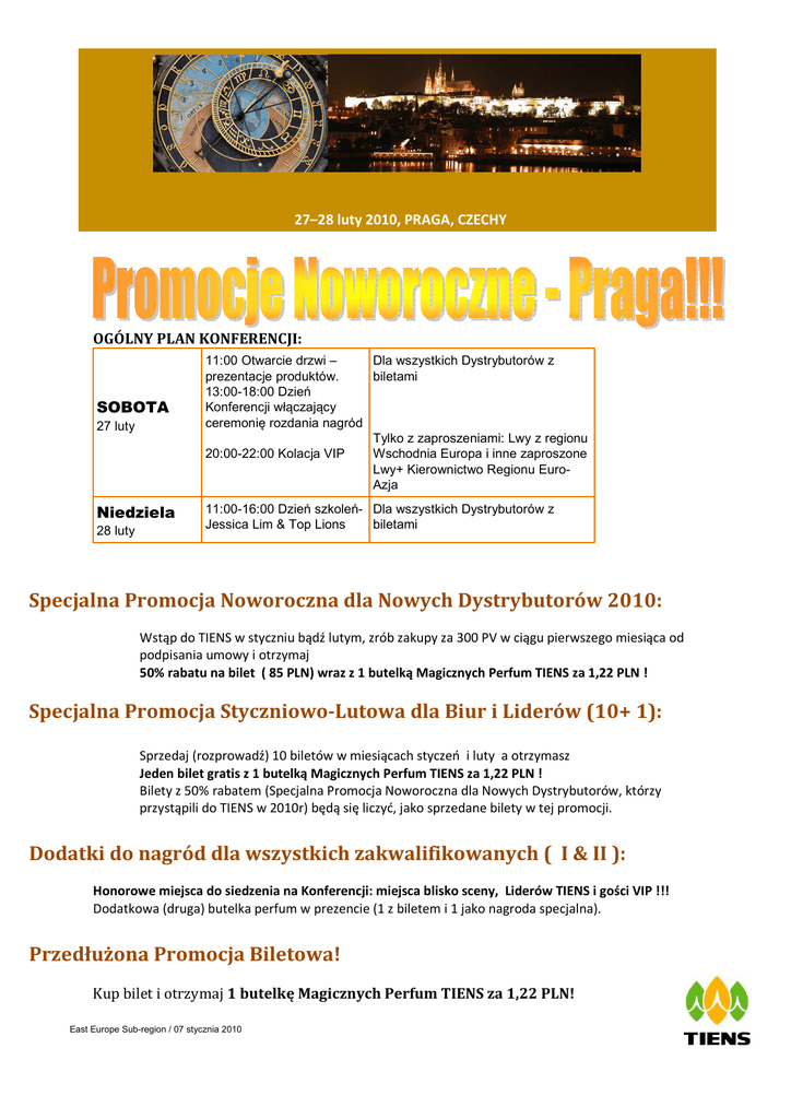 27–28 luty 2010, PRAGA, CZECHY OGÓLNY PLAN KONFERENCJI: 27 luty 11:00 Otwarcie drzwi – Dla wszystkich Dystrybutorów z prezentacje produktów. biletami 13:00-18:00 Dzień Konferencji włączający ceremonię rozdania nagród Tylko z zaproszeniami: Lwy z regionu 20:00-22:00 Kolacja VIP Wschodnia Europa i inne zaproszone Lwy+ Kierownictwo Regionu EuroAzja Niedziela 11:00-16:00 Dzień szkoleń- Dla wszystkich Dystrybutorów z Jessica Lim & Top Lions biletami SOBOTA 28 luty Specjalna Promocja Noworoczna dla Nowych Dystrybutorów 2010: Wstąp do TIENS w styczniu bądź lutym, zrób zakupy za 300 PV w ciągu pierwszego miesiąca od podpisania umowy i otrzymaj 50% rabatu na bilet ( 85 PLN) wraz z 1 butelką Magicznych Perfum TIENS za 1,22 PLN ! Specjalna Promocja Styczniowo-Lutowa dla Biur i Liderów (10+ 1): Sprzedaj (rozprowadź) 10 biletów w miesiącach styczeń i luty a otrzymasz Jeden bilet gratis z 1 butelką Magicznych Perfum TIENS za 1,22 PLN ! Bilety z 50% rabatem (Specjalna Promocja Noworoczna dla Nowych Dystrybutorów, którzy przystąpili do TIENS w 2010r) będą się liczyć, jako sprzedane bilety w tej promocji. Dodatki do nagród dla wszystkich zakwalifikowanych ( I & II ): Honorowe miejsca do siedzenia na Konferencji: miejsca blisko sceny, Liderów TIENS i gości VIP !!! Dodatkowa (druga) butelka perfum w prezencie (1 z biletem i 1 jako nagroda specjalna). Przedłużona Promocja Biletowa! Kup bilet i otrzymaj 1 butelkę Magicznych Perfum TIENS za 1,22 PLN! East Europe Sub-region / 07 stycznia 2010
