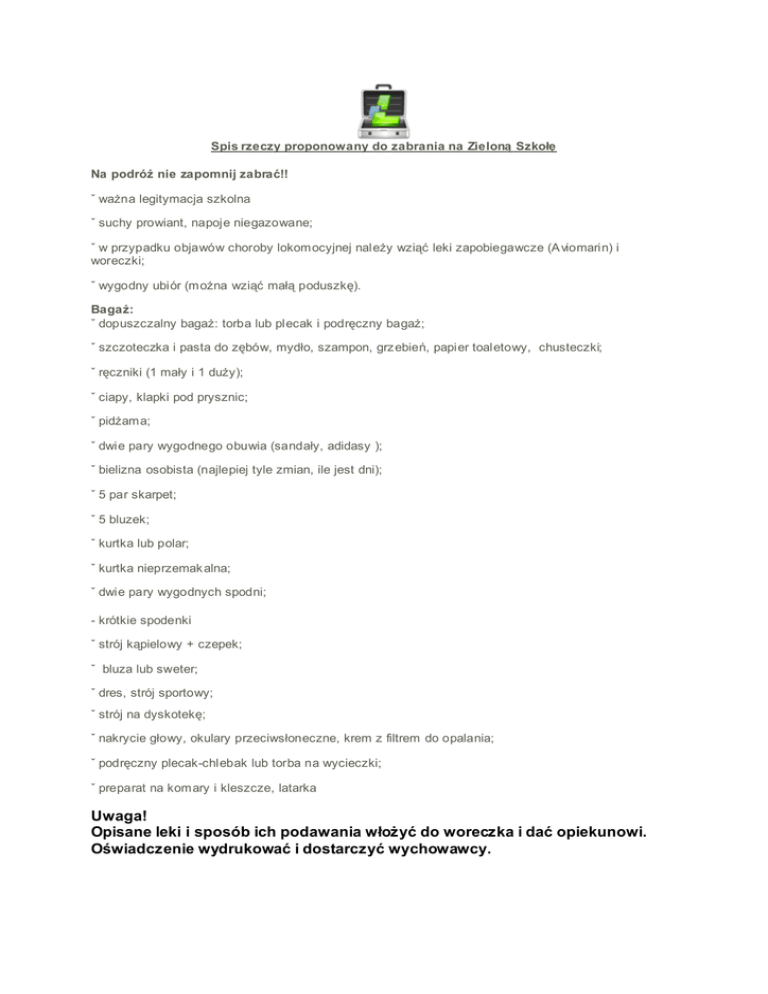 Spis rzeczy proponowany do zabrania na Zieloną Szkołę Na podróż nie zapomnij zabrać!! ˇ ważna legitymacja szkolna ˇ suchy prowiant, napoje niegazowane; ˇ w przypadku objawów choroby lokomocyjnej należy wziąć leki zapobiegawcze (A viomarin) i woreczki; ˇ wygodny ubiór (można wziąć małą poduszkę). Bagaż: ˇ dopuszczalny bagaż: torba lub plecak i podręczny bagaż; ˇ szczoteczka i pasta do zębów, mydło, szampon, grz ebień, papier toaletowy, chusteczki; ˇ ręczniki (1 mały i 1 duży); ˇ ciapy, klapki pod prysznic; ˇ pidżama; ˇ dwie pary wygodnego obuwia (sandały, adidasy ); ˇ bielizna osobista (najlepiej tyle zmian, ile jest dni); ˇ 5 par skarpet; ˇ 5 bluzek; ˇ kurtka lub polar; ˇ kurtka nieprzemak alna; ˇ dwie pary wygodnych spodni; - krótkie spodenki ˇ strój kąpielowy + czepek; ˇ bluza lub sweter; ˇ dres, strój sportowy; ˇ strój na dyskotekę; ˇ nakrycie głowy, okulary przeciwsłoneczne, krem z filtrem do opalania; ˇ podręczny plecak-chlebak lub torba na wycieczki; ˇ preparat na komary i kleszcze, latarka Uwaga! Opisane leki i sposób ich podawania włożyć do woreczka i dać opiekunowi. Oświadczenie wydrukować i dostarczyć wychowawcy. RADY NI E OD P ARADY Kochani Rodzice Wyjazd na zieloną szkołę jest zawsze dużym wydarzeniem i warto się do niego porządnie przygotować. Poniżej prezentujemy zestaw porad, które poz wolą Wam łatwiej przeżyć okres rozłąki z dzieckiem, a dzieciom łatwiej odnaleźć się w nowej sytuacji. Przygotowania Wypełnij dokładnie oś wiadczenie rodzica, wpisz wszystko co może okazać się ważne podczas wycieczki: chorobę lokomocyjną, lęk wysokości, klaustrofobia, alergie pokarmowe, jakie leki dziecko przyjmuje i w jakich dawkach, prz eciwwskazania dotycz ące leków, specyficzna dieta, inne problemy zdrowot ne itp. Porozmawiaj z wychowawcą, dowiedz się jak najwięc ej o miejscu wyjazdu, programie itp. dzięki temu będziesz wiedzieć jak czas spędza Twoje dziecko. Porozmawiaj z dzieckiem o jego oczekiwaniach, obawach, miejscu gdzie jedzie, jak ma się zachować w różnych sytuacjach. Omówcie regulamin program wycieczki, tak by dziecko nie było zaskoczone przebiegiem wycieczki. Pakowanie Niech dziecko bierze udział w pakowaniu, dzięki temu będzie wiedziało co ze sobą ma na wycieczce, jak wygląda jego kosmetyczka czy ręcznik. Weź pod uwagę zdanie dziecka, niech wybierze sobie ubranie na dyskotekę, zabierze ulubioną maskotkę. Podpisz ubrania, szczególnie jeśli są nowe (często zdarza się, że dzieci wypierają się swoich rzeczy znalezionych w szafie wśród ubrań koleżanek czy kolegów, bo nie zdążyły się do nich przyzwyczaić) Dopasuj wielkość bagaż u do ilości dni na wycieczce, spak uj tylko niezbędne rzeczy. Dziecku będzie łat wiej odnaleźć potrzebne rzeczy, gdy nie będzie ich zbyt dużo. Bagażu powinno być tyle, by dziecko samo mogło go przenieść. Najmłodszym dzieciom warto spakować podstawową odzież (bieliznę, koszulkę)w podpisane woreczki osobno na każdy dzień tygodnia, dzięki czemu nie będzie kłopotu z porannym ubieraniem się. Warto też od razu naszykować worek na brudne ubrania, żeby nie mieszały się z czystymi. Pamiętaj, że dziecko jedzie na zieloną szkołę a nie na wystawne przy jęcie. Weź pod uwagę że dzieci na naszych wycieczkach dużo czasu spędzają w lesie, na łące, na plaży i na pieszych wędrówkach. Ważne żeby ubrania i buty były wygodne i żeby się dziecko nie musiało mart wic że pobrudziło czy zniszczyło nową różową sukienkę czy białe spodnie. Sprawdź prognozę pogody i dopasuj do niej ubrania. Pamięt aj o kurtce przeciwdeszczowej i nakryciu głowy chroniącym przed słońcem i kremie z filtrem. Dziecko powinno mieć podręczny plecak, w którym weźmie prowiant na drogę, a na wyciecz kę picie i kurtkę. Jeśli dziecko przyjmuje leki zapakuj odpowiednią ilość i szczegółowo opisz sposób podawania. Kieszonkowe i cenne przedmioty Dziecko (nawet to starsze) nie powinno zabierać ze sobą cennych przedmiotów. Wychowawc a ani organizator nie bierze za nie odpowiedzialności. Nie dawaj dziecku zbyt dużej ilości gotówki. Porozmawiaj z innymi rodzicami podczas zebrania i razem ustalcie wysokość kieszonkowego (lub chociaż zakres od - do), dzięki czemu żadne dziecko nie będzie czuło się pokrzywdz one. Pamiętaj, że dzieci wszystko co potrzebne dostają, więc kieszonkowe potrzebne jest ewentualnie na loda czy gofra i pamiątkę. Wspólnie z wychowawc ą i innymi rodzicami zastanówcie się nad klasowymi słodyczami (albo składacie się po kilka złotych i kupujecie słodycze, albo dzieci biorą je ze sobą i wrzucają do wspólnego kosza), nad którymi kontrolę ma nauczyciel. Dzięki temu wiadomo, że dzieci nie będą jadły słodyczy przed posiłkami, że będą się sprawiedliwe nimi dzielić, mogą sobie przygotowy wać poczęstunek na dyskotekę czy ognisko i nie okaże się, że w pierwszych dwóc h dniac h dzieci obżerają się słodkościami i nie chcą jeść obiadu, a trzeciego dnia nie mają już kieszonkowego. Podróż Przed wyjazdem nie dawaj dziecku do jedzenia ciężkostrawnych potraw. Jeśli dziecko cierpi na chorobę lokomocyjną odpowiednio wcześniej podaj mu lek oraz zaopatrz w chusteczki higieniczne oraz worek foliowy na wszelki wypadek. Nie dawaj dziecku w nadmiernej ilości jedzenia na drogę. Dowiedz się jak długo będzie trwała podróż i o której będzie obiad i dostosuj ilość prowiantu. Lepiej naszykuj kanapkę, jabłko i wodę mineralną niż chipsy, czekoladki, żelki i słodzone, gazowane napoje. Przypomnij dziecku, że podczas podróży ma nie wstawać z miejsca a tym bardziej chodzić po aut okarze. Gdy poczuje się źle powinno natychmiast zawiadomić o tym Kontakt z dzieckiem i nauczycielem W przypadku jeśli dziecko zabiera telefon komórk owy prosimy o telefonowanie w ustalonych godzinach, które dziecko poda Państwu w pierwszym 