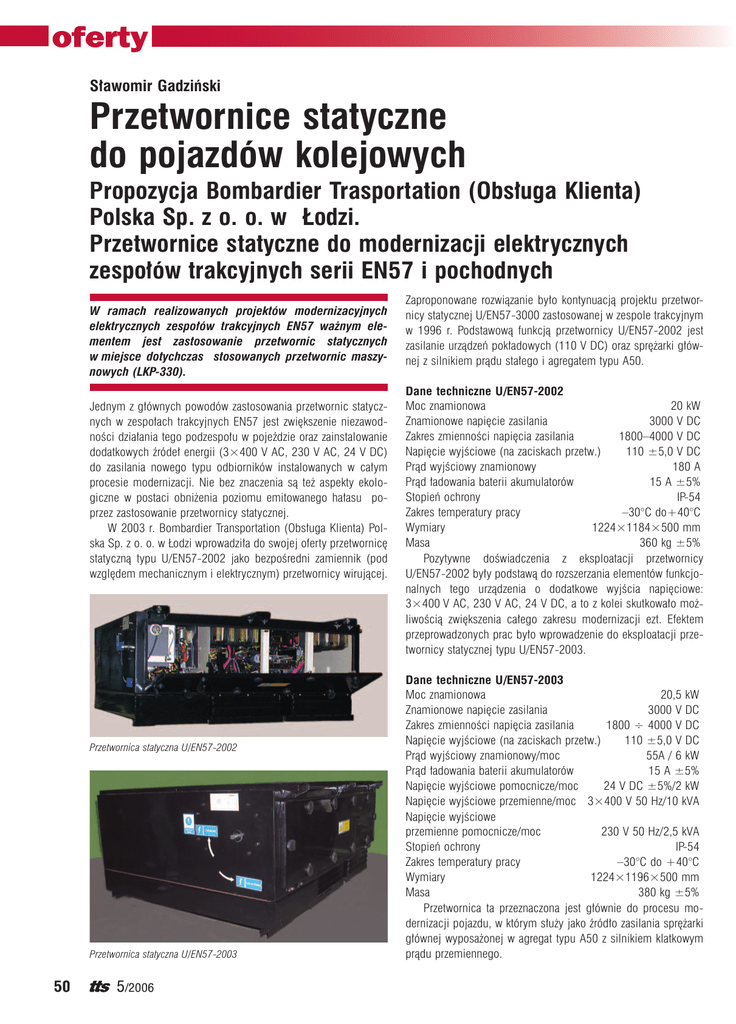 Sławomir Gadziński Przetwornice statyczne do pojazdów kolejowych Propozycja Bombardier Trasportation (Obsługa Klienta) Polska Sp. z o. o. w Łodzi. Przetwornice statyczne do modernizacji elektrycznych zespołów trakcyjnych serii EN57 i pochodnych W ramach realizowanych projektów modernizacyjnych elektrycznych zespołów trakcyjnych EN57 ważnym elementem jest zastosowanie przetwornic statycznych w miejsce dotychczas stosowanych przetwornic maszynowych (LKP-330). Jednym z głównych powodów zastosowania przetwornic statycznych w zespołach trakcyjnych EN57 jest zwiększenie niezawodności działania tego podzespołu w pojeździe oraz zainstalowanie dodatkowych źródeł energii (3×400 V AC, 230 V AC, 24 V DC) do zasilania nowego typu odbiorników instalowanych w całym procesie modernizacji. Nie bez znaczenia są też aspekty ekologiczne w postaci obniżenia poziomu emitowanego hałasu poprzez zastosowanie przetwornicy statycznej. W 2003 r. Bombardier Transportation (Obsługa Klienta) Polska Sp. z o. o. w Łodzi wprowadziła do swojej oferty przetwornicę statyczną typu U/EN57-2002 jako bezpośredni zamiennik (pod względem mechanicznym i elektrycznym) przetwornicy wirującej. Przetwornica statyczna U/EN57-2002 Przetwornica statyczna U/EN57-2003 50 5/2006 Zaproponowane rozwiązanie było kontynuacją projektu przetwornicy statycznej U/EN57-3000 zastosowanej w zespole trakcyjnym w 1996 r. Podstawową funkcją przetwornicy U/EN57-2002 jest zasilanie urządzeń pokładowych (110 V DC) oraz sprężarki głównej z silnikiem prądu stałego i agregatem typu A50. Dane techniczne U/EN57-2002 Moc znamionowa 20 kW Znamionowe napięcie zasilania 3000 V DC Zakres zmienności napięcia zasilania 1800–4000 V DC Napięcie wyjściowe (na zaciskach przetw.) 110 ±5,0 V DC Prąd wyjściowy znamionowy 180 A Prąd ładowania baterii akumulatorów 15 A ±5% Stopień ochrony IP-54 Zakres temperatury pracy –30°C do+40°C Wymiary 1224×1184×500 mm Masa 360 kg ±5% Pozytywne doświadczenia z eksploatacji przetwornicy U/EN57-2002 były podstawą do rozszerzania elementów funkcjonalnych tego urządzenia o dodatkowe wyjścia napięciowe: 3×400 V AC, 230 V AC, 24 V DC, a to z kolei skutkowało możliwością zwiększenia całego zakresu modernizacji ezt. Efektem przeprowadzonych prac było wprowadzenie do eksploatacji przetwornicy statycznej typu U/EN57-2003. Dane techniczne U/EN57-2003 Moc znamionowa 20,5 kW Znamionowe napięcie zasilania 3000 V DC Zakres zmienności napięcia zasilania 1800 ÷ 4000 V DC Napięcie wyjściowe (na zaciskach przetw.) 110 ±5,0 V DC Prąd wyjściowy znamionowy/moc 55A / 6 kW Prąd ładowania baterii akumulatorów 15 A ±5% Napięcie wyjściowe pomocnicze/moc 24 V DC ±5%/2 kW Napięcie wyjściowe przemienne/moc 3×400 V 50 Hz/10 kVA Napięcie wyjściowe przemienne pomocnicze/moc 230 V 50 Hz/2,5 kVA Stopień ochrony IP-54 Zakres temperatury pracy –30°C do +40°C Wymiary 1224×1196×500 mm Masa 380 kg ±5% Przetwornica ta przeznaczona jest głównie do procesu modernizacji pojazdu, w którym służy jako źródło zasilania sprężarki głównej wyposażonej w agregat typu A50 z silnikiem klatkowym prądu przemiennego. Równolegle z pracami związanymi z rozwojem przetwornic statycznych do modernizacji ezt realizowane były projekty związane z opracowaniem nowego typu sprężarki głównej (śrubowej), zastępującej przestarzałe rozwiązanie agregatu tłokowego typu A50. Wraz z wprowadzeniem sprężarek śrubowych do procesu modernizacji, Bombardier Transportation (Obsługa Klienta) Polska Sp. z o. o. w Łodzi rozszerzyła swoją ofertę o przetwornicę typu U/EN57-2004, która w pełnym zakresie zaspokaja wymagania stawiane obecnie modernizowanym elektrycznym zespołom trakcyjnym. Dane techniczne U/EN57-2004 Moc znamionowa 23 kVA Znamionowe napięcie zasilania 3000 V DC Zakres zmienności napięcia zasilania 1800 ÷ 4000 V DC Sprawność przetwornicy >85% Stopień ochrony IP-54 Zakres temperatury pracy –30°C do +40°C Wymiary gabarytowe L x B x H 1140×1200×515 mm Masa 350 kg ±5% Parametry wyjścia 110 V DC Moc wyjścia 9 kW Stabilność napięcia ±5% Prąd wyjściowy znamionowy 82 A Prąd ładowania baterii akumulatorów 15 A ±5% Pulsacje napięcia 5 VPP Elektroniczne zabezpieczenie przeciążeniowe i zwarciowe tak Parametry wyjścia 24 V DC Moc wyjścia 2 kW Stabilność napięcia ±5% Prąd wyjściowy znamionowy 84 A Pulsacje napięcia 2 VPP Elektroniczne zabezpieczenie przeciążeniowe i zwarciowe tak Parametry wyjścia 3×400 V 50 Hz Moc 12 kVA, w tym zasilanie silnika sprężarki Stabilność napięcia ±5% Zmienność częstotliwości ±1 Hz Elektroniczne zabezpieczenie przeciążeniowe i zwarciowe tak Dopuszczalna asymetria obciążenia max. 62,5% Parametry wyjścia 230 V 50 Hz Moc 2,5k VA (zasilanie z jednej fazy sieci 3×400 V, przy łącznym obciążeniu każdej fazy do 4 kVA) Stabilność napięcia ±5% Zmienność częstotliwości ±1 Hz Wszystkie zaprezentowane przetwornice statyczne do modernizacji ezt serii EN57 i pochodnych mają: n zabezpieczenia przeciążeniowe i zwarciowe, n kontrolę prądu ładowania, n napięcia wyjściowe AC – sinusoidalne THD <5%, n sterowanie mikroprocesorowe wszystkich obwodów, n program diagnostyczny (zdalna kontrola i monitorowanie za pomocą laptopa). Autor mgr inż. Sławomir Gadziński Bombardier Transportation (Obsługa Klienta) Polska Sp. z o.o. 91-205 Łódź, ul. Aleksandrowska 67/93, tel. 042 613 26 06 Przetwornica statyczna U/EN57-2004 Przetwornica statyczna U/EN57-2004 zamontowana pod wagonem Sterownik SMP-04 Laptop z programem diagnostycznym 5/2006 51