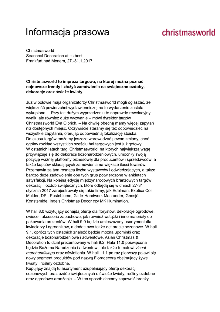 Informacja prasowa Christmasworld Seasonal Decoration at its best Frankfurt nad Menem, 27.-31.1.2017 Christmasworld to impreza targowa, na której można poznać najnowsze trendy i złożyć zamówienia na świąteczne ozdoby, dekoracje oraz świeże kwiaty. Już w połowie maja organizatorzy Christmasworld mogli ogłaszać, że większość powierzchni wystawienniczej na to wydarzenie została wykupiona. – Przy tak dużym wyprzedzeniu to naprawdę rewelacyjny wynik, ale również duże wyzwanie – mówi dyrektor targów Christmasworld Eva Olbrich. – Na chwilę obecną mamy więcej zapytań niż dostępnych miejsc. Oczywiście staramy się też odpowiedzieć na wszystkie zapytania, oferując odpowiednią lokalizację stoiska. Do czasu targów możemy jeszcze wprowadzać pewne zmiany, choć ogólny rozkład wszystkich sześciu hal targowych jest już gotowy. W ostatnich latach targi Christmasworld, na których największą wagę przywiązuje się do dekoracji bożonarodzeniowych, umocniły swoją pozycję ważnej platformy biznesowej dla producentów i sprzedawców, a także kupców składających zamówienia na większe ilości towarów. Przemawia za tym rosnąca liczba wystawców i odwiedzających, a także bardzo duże zadowolenie obu tych grup potwierdzone w ankietach satysfakcji. Na kolejną edycję międzynarodowych branżowych targów dekoracji i ozdób świątecznych, które odbędą się w dniach 27-31 stycznia 2017 zarejestrowały się takie firmy, jak Edelman, Exotica Cor Mulder, DPI, Pusteblume, Gilde-Handwerk Macrander, Gnosjö Konstsmide, Inge's Christmas Decor czy MK Illumination. W hali 8.0 wizytujący odnajdą ofertę dla florystów, dekoracje ogrodowe, świece i akcesoria zapachowe, jak również wstążki i inne materiały do pakowania prezentów. W hali 9.0 będzie umieszczony asortyment dla kwiaciarzy i ogrodników, a dodatkowo także dekoracje sezonowe. W hali 9.1. oprócz tych ostatnich znaleźć będzie można upominki oraz dekoracje bożonarodzeniowe i adwentowe. Asian Christmas & Decoration to dział prezentowany w hali 9.2. Hala 11.0 poświęcona będzie Bożemu Narodzeniu i adwentowi, ale także tematowi visual merchandisingu oraz oświetlenia. W hali 11.1 po raz pierwszy pojawi się nowy segment produktów pod nazwą Floradecora obejmujący żywe kwiaty i rośliny ozdobne. Kupujący znajdą tu asortyment uzupełniający ofertę dekoracji sezonowych oraz ozdób świątecznych o świeże kwiaty, rośliny ozdobne oraz ogrodowe aranżacje. – W ten sposób chcemy zapewnić branży dekoratorskiej kolejne źródło przychodu dzięki nowej ofercie, która może znaleźć się w asortymencie stałym lub dodatkowym – mówi Olbrich. Innowacyjna i dostępna od ręki oferta produktowa zaprezentowana zostanie poprzez specjalnie przygotowane aranżacje nowych wystawców, do których zaliczać będą się hodowcy i producenci kwiatów i roślin ozdobnych, sprzedawcy hurtowi kwiatów, importerzy i eksporterzy, zrzeszenia dystrybutorów, spółdzielnie, dostawcy ceramiki oraz kwiatów, firmy logistyczne oraz zakłady produkcji opakowań. Wśród 30 firm, które już zarejestrowały się na tych nowych targach branżowych, znajdą się między innymi Barendsen, FleuraMetz, Your Lily, Lisianthus, MM Flowers Europe, PT-Creations, Royal Flora Holland, Smithers-Oasis oraz Van der Lugt Lisianthus. Oferta odpowiadajaca zapotrzebowaniu W trakcie ostatniej edycji pod hasłem „Seasonal Decoration at its best” 953 wystawców z 45 krajów prezentowało swą ofertę 39 398 kupującym ze 114 krajów (w 2015 roku było to 911 wystawców z 42 krajów oraz 36 148 odwiedzających ze 106 krajów1). Od nastrojowych dekoracji adwentowych i bożonarodzeniowych przez sezonowe dekoracje do domu i ogrodu czy balkonu na przeróżne okazje aż po imponujące wystawy sklepowe oraz dekoracje dużych powierzchni w miastach, centrach handlowych i hotelach – we Frankfurcie nad Menem każdego roku można zobaczyć wszystkie nowinki oraz trendy nadchodzącego sezonu. Do odwiedzających targi branżystów należą zarówno kupcy hurtowi, jak i detaliczni, w tym na przykład centra ogrodnicze, markety budowlane, floryści, sklepy meblarskie i wnętrzarskie, butiki z upominkami, sklepy z naczyniami szklanymi, porcelaną i ceramiką, drogerie i perfumerie, sklepy spożywcze, ale także profesjonalni kupcy odpowiedzialni za zaopatrzenie centrów handlowych, miast i gmin, obiektów gastronomicznych i hoteli, jak również agencje eventowe, eksperci od aranżacji wystaw sklepowych, dekoratorzy wnętrz, projektanci oraz firmy dekoratorskie. Cztery imprezy i jeszcze większa wartość Dla odwiedzających Christmasworld i Floradecora dodatkową wartość stanowić będą odbywające się w tym samym czasie targi Paperworld, czyli międzynarodowe targi artykułów papierniczych, piśmienniczych i biurowych, oraz Creativeworld – międzynarodowe targi artykułów dla plastyków i hobbystów (28 - 31.1.2017). Ten nowy kwartet targowy to zatem dodatkowe możliwości i kontakty biznesowe, na przykład poprzez odpowiednie rozszerzenie swojego asortymentu. W trakcie tych czterech imprez targowych będzie więc można w tym samym czasie, zaraz na początku sezonu sprzedażowego, zapoznać się z jedyną taką na świecie ofertą nowości, produktów, usług i trendów. Już odwiedzenie jednej z tych imprez to gwarancja korzyści: dzięki obszernej i innowacyjnej ofercie wystawców oraz inspirującemu programowi ramowemu, które pozwolą na zapoznanie się z najnowszymi trendami 1 Źródło: Dane za rok 2015 według FKM (niemieckiego stowarzyszenia na rzecz dobrowolnej kontroli danych liczbowych imprez targowych z siedzibą w Berlinie) oraz kierunkami rozwoju tej branży w przyszłości. Podróż do Frankfurtu opłaca się więc z wielu powodów. Wskazówka dla dziennikarzy: Więcej informacji oraz zdjęcia w wysokiej rozdzielczości na stronie: www.christmasworld.messefrankfurt.com. Targi Frankfurt Przedstawiciel