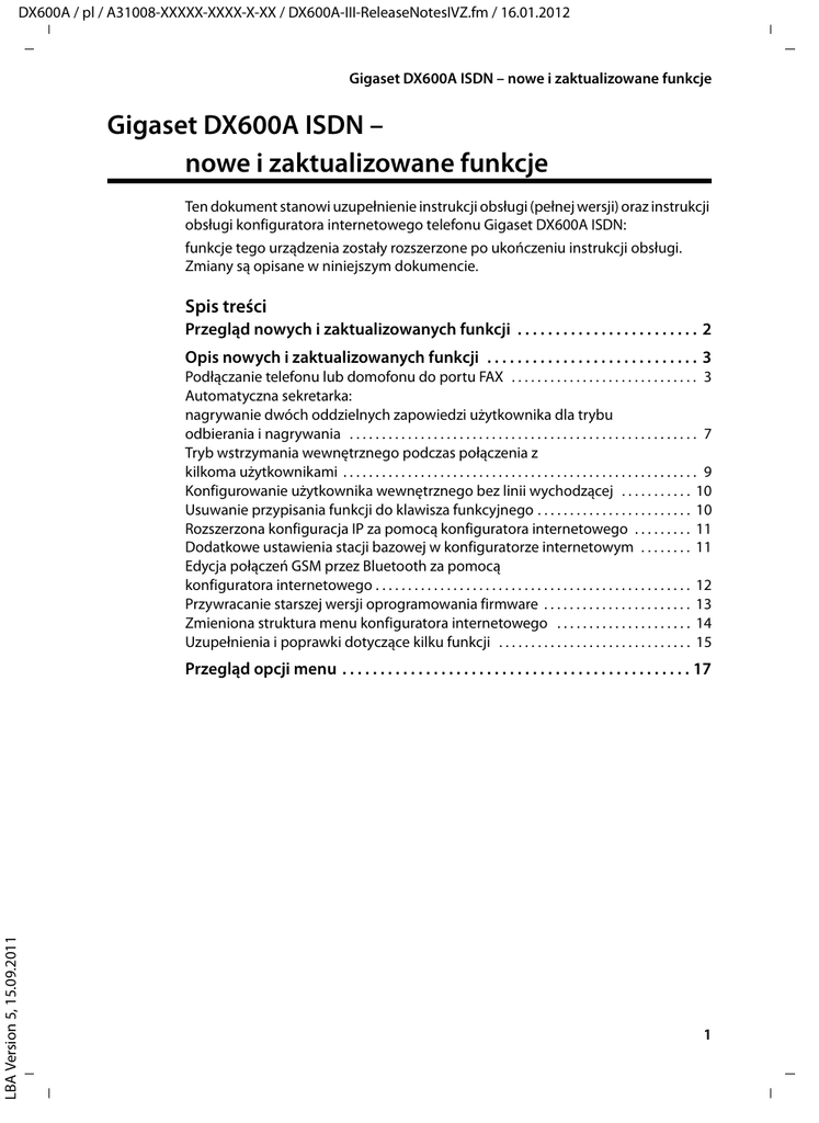 DX600A / pl / A31008-XXXXX-XXXX-X-XX / DX600A-III-ReleaseNotesIVZ.fm / 16.01.2012 Gigaset DX600A ISDN – nowe i zaktualizowane funkcje Gigaset DX600A ISDN – nowe i zaktualizowane funkcje Ten dokument stanowi uzupełnienie instrukcji obsługi (pełnej wersji) oraz instrukcji obsługi konfiguratora internetowego telefonu Gigaset DX600A ISDN: funkcje tego urządzenia zostały rozszerzone po ukończeniu instrukcji obsługi. Zmiany są opisane w niniejszym dokumencie. Spis treści Przegląd nowych i zaktualizowanych funkcji . . . . . . . . . . . . . . . . . . . . . . . . 2 Opis nowych i zaktualizowanych funkcji . . . . . . . . . . . . . . . . . . . . . . . . . . . . 3 Podłączanie telefonu lub domofonu do portu FAX . . . . . . . . . . . . . . . . . . . . . . . . . . . . . 3 Automatyczna sekretarka: nagrywanie dwóch oddzielnych zapowiedzi użytkownika dla trybu odbierania i nagrywania . . . . . . . . . . . . . . . . . . . . . . . . . . . . . . . . . . . . . . . . . . . . . . . . . . . . . . 7 Tryb wstrzymania wewnętrznego podczas połączenia z kilkoma użytkownikami . . . . . . . . . . . . . . . . . . . . . . . . . . . . . . . . . . . . . . . . . . . . . . . . . . . . . . . 9 Konfigurowanie użytkownika wewnętrznego bez linii wychodzącej . . . . . . . . . . . 10 Usuwanie przypisania funkcji do klawisza funkcyjnego . . . . . . . . . . . . . . . . . . . . . . . . 10 Rozszerzona konfiguracja IP za pomocą konfiguratora internetowego . . . . . . . . . 11 Dodatkowe ustawienia stacji bazowej w konfiguratorze internetowym . . . . . . . . 11 Edycja połączeń GSM przez Bluetooth za pomocą konfiguratora internetowego . . . . . . . . . . . . . . . . . . . . . . . . . . . . . . . . . . . . . . . . . . . . . . . . . 12 Przywracanie starszej wersji oprogramowania firmware . . . . . . . . . . . . . . . . . . . . . . . 13 Zmieniona struktura menu konfiguratora internetowego . . . . . . . . . . . . . . . . . . . . . 14 Uzupełnienia i poprawki dotyczące kilku funkcji . . . . . . . . . . . . . . . . . . . . . . . . . . . . . . 15 LBA Version 5, 15.09.2011 Przegląd opcji menu . . . . . . . . . . . . . . . . . . . . . . . . . . . . . . . . . . . . . . . . . . . . . . 17 1 Gigaset XXX / pl / A31008-XXXXX-XXXX-X-XX / Rel3_Saturn.fm / 16.01.2012 Przegląd nowych i zaktualizowanych funkcji Przegląd nowych i zaktualizowanych funkcji Nowe i rozszerzone funkcje u Umożliwiono podłączenie dodatkowych urządzeń do portu FAX: u u u u u u u LBA Version 5, 15.09.2011 u 2 Zamiast urządzenia faksującego, do złącza faksu telefonu Gigaset można podłączyć przewodowy domofon analogowy. ¢ str. 3 Dla każdej automatycznej sekretarki można zapisać dwa komunikaty osobiste. Teraz można nagrać dla każdej lokalnej automatycznej sekretarki dwie zapowiedzi trybu pomocniczego. Podczas włączania automatycznej sekretarki można wybrać żądaną zapowiedź. ¢ str. 7 Połączenie zewnętrze wstrzymywane wewnętrznie na urządzeniu w zależności od ustawień telefonu (podczas przełączania lub zewnętrznego połączenia konsultacyjnego) połączenia zewnętrzne są wstrzymywane wewnętrznie na telefonie lub centrali telefonicznej operatora. Podczas wstrzymania wewnętrznego linie ISDN są zajęte. ¢ str. 9 Konfigurowanie użytkownika wewnętrznego bez linii wychodzącej. Telefon lub poszczególne zarejestrowane słuchawki można skonfigurować w sposób uniemożliwiający wykonywanie połączeń zewnętrznych. Można jednak przyjmować połączenia zewnętrzne i wykonywać połączenia wewnętrzne. ¢ str. 10 Konfigurator internetowy umożliwia skonfigurowanie dodatkowych ustawień protokołu IP stacji bazowej. Dzięki temu można określić nazwę urządzenia stosowaną w celu adresowania stacji bazowej w sieci lokalnej. ¢ str. 11 Za pomocą konfiguratora internetowego można skonfigurować dodatkowe ustawienia stacji bazowej: włączyć tryb rejestracji, zmienić systemowy kod PIN. ¢ str. 11 Za pomocą konfiguratora internetowego można zmienić nazwy połączeń GSM przez Bluetooth na liście Znane urzadzenia i usunąć połączenia GSM z listy. ¢ str. 12 Po pierwszej aktualizacji oprogramowania firmware można przywrócić poprzednią wersję oprogramowania firmware. ¢ str. 13 Struktura menu konfiguratora internetowego została zmieniona. ¢ str. 14 Gigaset XXX / pl / A31008-XXXXX-XXXX-X-XX / Rel3_Saturn.fm / 16.01.2012 Opis nowych i zaktualizowanych funkcji Opis nowych i zaktualizowanych funkcji Podłączanie telefonu lub domofonu do portu FAX Ta sekcja stanowi przedłużenie sekcji „Podłączanie/używanie innych urządzeń – podłączanie faksu (ISDN)” w instrukcji obsługi telefonu Gigaset. Zamiast urządzenia faksującego, do portu FAX stacji bazowej można podłączyć przewodowy domofon analogowy (typu 2). 3 Urządzenie faksujące lub Domofon 1 2 1. Włóż wtyk kabla połączeniowego (6-stykowego z 2 wtykami Mini Western 6/6) w gniazdo we wgłębieniu z tyłu obudowy telefonu. 2. Włóż wtyk kabla połączeniowego do portu faksu stacji bazowej (oznaczenie: FAX). 3. Następnie podłącz kabel połączeniowy faksu do portu interkomu domofonu. Nie trzeba ręcznie rejestrować urządzenia w stacji bazowej. Jest ono automatycznie „rejestrowane” po włączeniu portu FAX stacji bazowej. Urządzenie jest dodawane do listy numerów wewnętrznych pod nazwą wewnętrzną WEWN 8. Nazwę tę można zmienić (np. „drzwi”). Numeru wewnętrznego 8 nie można jednak zmienić. LBA Version 5, 15.09.2011 Podczas włączania portu FXS należy określić typ urządzenia, które ma zostać podłączone do portu. 3 Gigaset XXX / pl / A31008-XXXXX-XXXX-X-XX / Rel3_Saturn.fm / 16.01.2012 Opis nowych i zaktualizowanych funkcji Włączanie/wyłączanie portu FAX Ta sekcja zastępuje sekcję „Konfigurowanie ustawień systemowych – włączanie/wyłączanie portu faksu (ISDN)” w instrukcji obsługi telefonu Gigaset. LBA Version 5, 15.09.2011 W celu zarejestrowania faksu lub domofonu w stacji bazowej n