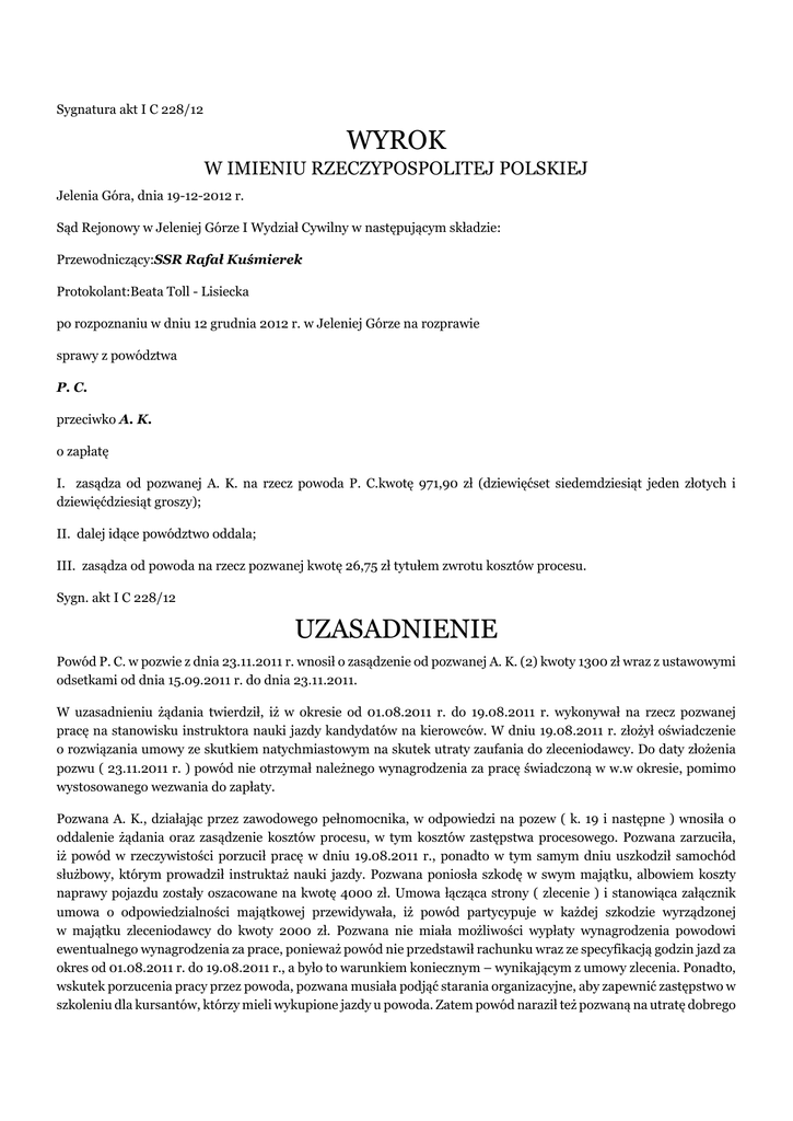 Sygnatura akt I C 228/12 WYROK W IMIENIU RZECZYPOSPOLITEJ POLSKIEJ Jelenia Góra, dnia 19-12-2012 r. Sąd Rejonowy w Jeleniej Górze I Wydział Cywilny w następującym składzie: Przewodniczący:SSR Rafał Kuśmierek Protokolant:Beata Toll - Lisiecka po rozpoznaniu w dniu 12 grudnia 2012 r. w Jeleniej Górze na rozprawie sprawy z powództwa P. C. przeciwko A. K. o zapłatę I. zasądza od pozwanej A. K. na rzecz powoda P. C.kwotę 971,90 zł (dziewięćset siedemdziesiąt jeden złotych i dziewięćdziesiąt groszy); II. dalej idące powództwo oddala; III. zasądza od powoda na rzecz pozwanej kwotę 26,75 zł tytułem zwrotu kosztów procesu. Sygn. akt I C 228/12 UZASADNIENIE Powód P. C. w pozwie z dnia 23.11.2011 r. wnosił o zasądzenie od pozwanej A. K. (2) kwoty 1300 zł wraz z ustawowymi odsetkami od dnia 15.09.2011 r. do dnia 23.11.2011. W uzasadnieniu żądania twierdził, iż w okresie od 01.08.2011 r. do 19.08.2011 r. wykonywał na rzecz pozwanej pracę na stanowisku instruktora nauki jazdy kandydatów na kierowców. W dniu 19.08.2011 r. złożył oświadczenie o rozwiązania umowy ze skutkiem natychmiastowym na skutek utraty zaufania do zleceniodawcy. Do daty złożenia pozwu ( 23.11.2011 r. ) powód nie otrzymał należnego wynagrodzenia za pracę świadczoną w w.w okresie, pomimo wystosowanego wezwania do zapłaty. Pozwana A. K., działając przez zawodowego pełnomocnika, w odpowiedzi na pozew ( k. 19 i następne ) wnosiła o oddalenie żądania oraz zasądzenie kosztów procesu, w tym kosztów zastępstwa procesowego. Pozwana zarzuciła, iż powód w rzeczywistości porzucił pracę w dniu 19.08.2011 r., ponadto w tym samym dniu uszkodził samochód służbowy, którym prowadził instruktaż nauki jazdy. Pozwana poniosła szkodę w swym majątku, albowiem koszty naprawy pojazdu zostały oszacowane na kwotę 4000 zł. Umowa łącząca strony ( zlecenie ) i stanowiąca załącznik umowa o odpowiedzialności majątkowej przewidywała, iż powód partycypuje w każdej szkodzie wyrządzonej w majątku zleceniodawcy do kwoty 2000 zł. Pozwana nie miała możliwości wypłaty wynagrodzenia powodowi ewentualnego wynagrodzenia za prace, ponieważ powód nie przedstawił rachunku wraz ze specyfikacją godzin jazd za okres od 01.08.2011 r. do 19.08.2011 r., a było to warunkiem koniecznym – wynikającym z umowy zlecenia. Ponadto, wskutek porzucenia pracy przez powoda, pozwana musiała podjąć starania organizacyjne, aby zapewnić zastępstwo w szkoleniu dla kursantów, którzy mieli wykupione jazdy u powoda. Zatem powód naraził też pozwaną na utratę dobrego imienia oraz wymierną szkodę finansową. Pozwana A. K.zarzuciła również, iż powód w żaden sposób nie wykazał wysokości dochodzonej kwoty pieniężnej. Sąd Rejonowy ustalił następujący stan faktyczny : Pozwana A. K.prowadziła szkołę nauki jazdy pod firmą (...)z siedzibą w J.. W dniu 01.01.2011 r. pozwana A. K.oraz powód P. C.zawarli umowę zlecenia numer (...)na podstawie której powód zobowiązał się do wykonywania czynności z zakresu szkolenia teoretycznego i praktycznego kandydatów na kierowców kategorii B w terminie od 01.01.2011 r. do 31.12.2011 r., zaś pozwana do wypłaty wynagrodzenia w kwocie 9 zł brutto za 1 godzinę przeprowadzonych zajęć. Wypłata wynagrodzenia miała nastąpić na podstawie rachunku wystawionego przez zleceniobiorcę i karty przeprowadzonych zajęć. Strony w dniu 01.01.2011 r. zawarły również umowę odpowiedzialności majątkowej, na mocy której powód przyjął odpowiedzialność za szkody majątkowe powstałe w czasie gdy pojazd został powierzony zleceniobiorcy, zaś udział w każdej szkodzie powstałej w pojeździe wynosi 2000 zł. / dowód : umowa zlecenia k. 10 umowa odpowiedzialności majątkowej k. 26 – 27 / Zgodnie z zasadami pracy obowiązującymi w szkole pozwanej, instruktor nauki jazdy, co tydzień powinien był składać karty drogowe gdzie była wpisywana ilość godzina zajęć pokwitowana podpisem kursanta, zaś do dnia 10 każdego miesiąca – za miesiąc poprzedni – rachunek wraz ze specyfikacją. Kursanci zaś winni posiadać karty kursantów. Dokumenty powyższe należało składać w biurze szkoły. W biurze szkoły pracowała pozwana A. K., jak również do końca października 2011 r. E. W.do obowiązków której należało : ustalanie grafików zajęć dla kursantów, odbiór od instruktorów nauki jazdy kart drogowych i dokumentacji rozliczenia za paliwo. Po godzinie 15.30 E. W.prowadziła teoretyczne zajęcia z kursantami. W rzeczywistości karty drogowe były oddawane przez instruktorów nauki jazdy z różną częstotliwością tj, raz na tydzień, raz na miesiąc. Najczęściej oddawano je do rąk E. W.. Gdy w biurze nie było E. W.karty drogowe przekazywano pozwanej A. K.. Również wprowadzono odstępstwo od procedury wystawienia rachunku przez instruktora nauki. Niektórzy instruktorzy nie wystawiali rachunku, tylko po oddaniu kart drogowych i ich weryfikacji przez pozwaną otrzymywali od pozwanej przygotowany rachunek obciążający pozwaną, który kwitowali podpisem i na tej podstawie otrzymywali wynagrodzenie. Z takiej formy rozliczenia korzystali min. A. J., M. H., powód P. C.. Powód samodzielnie wystawił tylko pierwszy rachunek – w okresie umowy zlecenia. Powód P. C. oddawał karty drogowe każdego tygodnia, w piątek. / dowód: rachunek k. 39 karta drogowa k. 48 zeznania świadka E. W. k. 58 – 59 zeznania świadka A. J. k. 59 – 60 zeznania świadka P. F. k. 59 v – 60 zeznania świadka M. H. k. 86 – 87 zeznania powoda P. C. k. 34, 86 v – 87 częściowo zeznania pozwanej A. K.k. 35, 87 oświadczenie k. 46 / W lipcu 2011 r. powód P. C. otrzymał wynagrodzenie w kwocie 1579 zł netto. Średnio tygodniowo powód prowadził 50 godzin instruktażu nauki jazdy. / dowód: rachunek k. 28, 49 zeznania świadka E. W. k. 58 – 59 zeznania powoda P. C. k. 34, 86 v – 87 / W dniu 19.08.2011 r. ( czwartek ) p