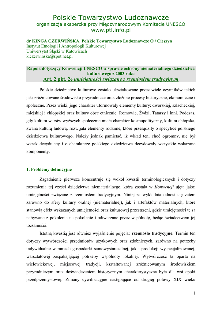 Polskie Towarzystwo Ludoznawcze organizacja ekspercka przy Międzynarodowym Komitecie UNESCO www.ptl.info.pl dr KINGA CZERWIŃSKA, Polskie Towarzystwo Ludoznawcze O / Cieszyn Instytut Etnologii i Antropologii Kulturowej Uniwersytet Śląski w Katowicach [email protected] Raport dotyczący Konwencji UNESCO w sprawie ochrony niematerialnego dziedzictwa kulturowego z 2003 roku Art. 2 pkt. 2e umiejętności związane z rzemiosłem tradycyjnym Polskie dziedzictwo kulturowe zostało ukształtowane przez wiele czynników takich jak: zróżnicowane środowisko przyrodnicze oraz złożone procesy historyczne, ekonomiczne i społeczne. Przez wieki, jego charakter uformowały elementy kultury: dworskiej, szlacheckiej, miejskiej i chłopskiej oraz kultury obce etnicznie: Romowie, Żydzi, Tatarzy i inni. Podczas, gdy kultura warstw wyższych społecznie miała charakter kosmopolityczny, kultura chłopska, zwana kulturą ludową, rozwijała elementy rodzime, które przesądziły o specyfice polskiego dziedzictwa kulturowego. Należy jednak pamiętać, iż wkład ten, choć ogromny, nie był wszak decydujący i o charakterze polskiego dziedzictwa decydowały wszystkie wskazane komponenty. 1. Problemy definicyjne Zagadnienie pierwsze koncentruje się wokół kwestii terminologicznych i dotyczy rozumienia tej części dziedzictwa niematerialnego, która została w Konwencji ujęta jako: umiejętności związane z rzemiosłem tradycyjnym. Niniejsza wykładnia odnosi się zatem zarówno do sfery kultury oralnej (niematerialnej), jak i artefaktów materialnych, które stanowią efekt wskazanych umiejętności oraz kulturowej przestrzeni, gdzie umiejętności te są nabywane z pokolenia na pokolenie i odtwarzane przez wspólnotę, będąc świadectwem jej tożsamości. Istotną kwestią jest również wyjaśnienie pojęcia: rzemiosło tradycyjne. Termin ten dotyczy wytwórczości przedmiotów użytkowych oraz zdobniczych, zarówno na potrzeby indywidualne w ramach gospodarki samowystarczalnej, jak i produkcji wyspecjalizowanej, warsztatowej zaspakajającej potrzeby wspólnoty lokalnej. Wytwórczość ta oparta na wielowiekowej, miejscowej tradycji, kształtowanej zróżnicowanym środowiskiem przyrodniczym oraz doświadczeniem historycznym charakterystyczna była dla wsi epoki przedprzemysłowej. Zmiany cywilizacyjne następujące od drugiej połowy XIX wieku 1 Polskie Towarzystwo Ludoznawcze organizacja ekspercka przy Międzynarodowym Komitecie UNESCO www.ptl.info.pl przyniosły przeobrażenia pierwotnego charakteru wielu rzemieślniczych specjalizacji, a nierzadko całkowity ich zanik. W dyskursie akademickim, a nierzadko i potocznym, termin rzemiosło tradycyjne używany jest wymiennie, semantycznie równoważnie z innymi, tj.: rękodzieło lub przemysł ludowy. W szerszej perspektywie definicyjnej – umiejętności związane z rzemiosłem tradycyjnym wchodzą w zakres pojęć: twórczość ludowa lub sztuka ludowa, które należy rozumieć jako aktywność plastyczną, w ramach której powstawały przedmioty wykonywane: - w gospodarstwie chłopskim, w rodzinie, na własne potrzeby, np. tkaniny, proste meble i sprzęty, dekoracje domów (malowanie ścian, wycinanki, pająki, sypanie wzorów piaskiem), przystrajanie kapliczek, ołtarzy, świętych obrazów, itd.; - przez szczególnie uzdolnione osoby, dla najbliższego otoczenia, zwykle jako forma „rewanżu”. Mowa tu o takich przedmiotach jak: wycinanki, pająki, pisanki, pieczywo obrzędowe, maski, wyróżniające się wysokim poziomem artyzmu; - w ramach tzw. przemysłu domowego, produkowane na sprzedaż, np. dla odbiorców miejskich (wikliniarstwo, zabawkarstwo, hafciarstwo, tkactwo użytkowe i dekoracyjne); - wyroby i usługi wiejskich specjalistów: krawców, kowali, cieśli, garncarzy; - wyroby ośrodków rzemieślniczych i warsztatów w małych miasteczkach wytwarzane dla odbiorców wiejskich, sprzedawane na targach, odpustach czy w handlu domokrążnym (np. ceramika, malowane meble, rzeźba w drewnie i nagrobna, pierniki, dewocjonalia, biżuteria). Powyższe ujęcia terminologiczne, prowadzą do konkluzji, iż w kategorii umiejętności związanych z rzemiosłem tradycyjnym najbardziej widoczna jest głęboka współzależność między niematerialnym dziedzictwem kulturowym, a jego materialnym obliczem. Co w konsekwencji rodzi niebezpieczeństwo ochrony materialnych artefaktów, a nie twórców – dysponariuszy umiejętności opanowanych drogą bezpośredniego przekazu, tzn. wyuczonych u starych mistrzów w danej wsi lub w rodzinnym domu. 2. Stan zachowania opisywanych elementów na uwzględnieniem zjawisk ogólnopolskich, jak i regionalnych). terytorium Polski (z Po II wojnie światowej pod wpływem silnej urbanizacji, industrializacji i zmian ustrojowych kultura ludowa, a więc rdzeń dziedzictwa kulturowego ulega rozpadowi. Równocześnie staje się elementem propagandy politycznej PRL, a skonstruowany wówczas jej obraz, do dziś wpływa na sposób jej postrzegania, nierzadko pejoratywny. Pomimo tego, 2 Polskie Towarzystwo Ludoznawcze organizacja ekspercka przy Międzynarodowym Komitecie UNESCO www.ptl.info.pl dzięki scentralizowanej opiece państwa wiele elementów kultury tradycyjnej, w tym umiejętności rzemieślnicze i rękodzielnicze, przetrwało do dziś. Decydujące znaczenie w tej kwestii odegrała Cepelia, od 1968 roku Stowarzyszenie Twórców Ludowych. Duże zmiany w postrzeganiu i ochronie dziedzictwa kulturowego w Polsce miały wydarzenia końca XX i początku XXI wieku: przemiany ustrojowe oraz przystąpienie do Unii Europejskiej. Zmiany te oznaczały przede wszystkim ograniczenie, a w wielu przypadkach zlikwidowanie centralnej opieki państwa nad dziedzictwem kulturowym, głównie wsparcia finansowego, rozbudziły obawę i lęki przed utratą kultury polskiej, zanikiem jej narodowej odrębności i ujednoliceniem z kulturą europejska czy światową. Wszystkie te obawy okazały się przedwczesne, i jak obserwujemy błędne