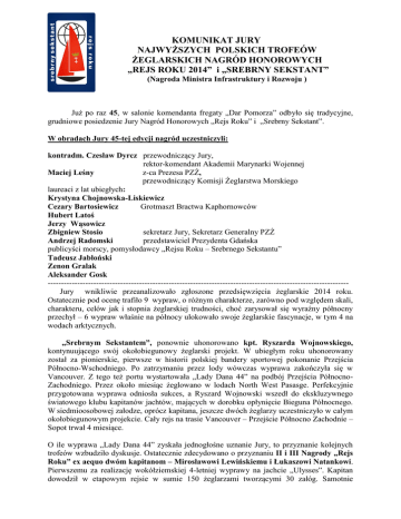 KOMUNIKAT JURY NAJWYŻSZYCH POLSKICH TROFEÓW ŻEGLARSKICH NAGRÓD HONOROWYCH „REJS ROKU 2014” i „SREBRNY SEKSTANT” (Nagroda Ministra Infrastruktury i Rozwoju ) Już po raz 45, w salonie komendanta fregaty „Dar Pomorza” odbyło się tradycyjne, grudniowe posiedzenie Jury Nagród Honorowych „Rejs Roku” i „Srebrny Sekstant”. W obradach Jury 45-tej edycji nagród uczestniczyli: kontradm. Czesław Dyrcz przewodniczący Jury, rektor-komendant Akademii Marynarki Wojennej Maciej Leśny z-ca Prezesa PZŻ, przewodniczący Komisji Żeglarstwa Morskiego laureaci z lat ubiegłych: Krystyna Chojnowska-Liskiewicz Cezary Bartosiewicz Grotmaszt Bractwa Kaphornowców Hubert Latoś Jerzy Wąsowicz Zbigniew Stosio sekretarz Jury, Sekretarz Generalny PZŻ Andrzej Radomski przedstawiciel Prezydenta Gdańska publicyści morscy, pomysłodawcy „Rejsu Roku – Srebrnego Sekstantu” Tadeusz Jabłoński Zenon Gralak Aleksander Gosk ---------------------------------------------------------------------------------------------------------------Jury wnikliwie przeanalizowało zgłoszone przedsięwzięcia żeglarskie 2014 roku. Ostatecznie pod ocenę trafiło 9 wypraw, o różnym charakterze, zarówno pod względem skali, charakteru, celów jak i stopnia żeglarskiej trudności, choć zarysował się wyraźny północny przechył – 6 wypraw właśnie na północy ulokowało swoje żeglarskie fascynacje, w tym 4 na wodach arktycznych. „Srebrnym Sekstantem”, ponownie uhonorowano kpt. Ryszarda Wojnowskiego, kontynuującego swój okołobiegunowy żeglarski projekt. W ubiegłym roku uhonorowany został za pionierskie, pierwsze w historii polskiej bandery sportowej pokonanie Przejścia Północno-Wschodniego. Po zatrzymaniu przez lody wówczas wyprawa zakończyła się w Vancouver. Z tego też portu wystartowała „Lady Dana 44” na podbój Przejścia PółnocnoZachodniego. Przez około miesiąc żeglowano w lodach North West Pasasge. Perfekcyjnie przygotowana wyprawa odniosła sukces, a Ryszard Wojnowski wszedł do ekskluzywnego światowego klubu kapitanów jachtów, mających w dorobku opłynięcie Bieguna Północnego. W siedmioosobowej załodze, oprócz kapitana, jeszcze dwóch żeglarzy uczestniczyło w całym okołobiegunowym projekcie. Cały rejs na trasie Vancouver – Przejście Północno Zachodnie – Sopot trwał 4 miesiące. O ile wyprawa „Lady Dana 44” zyskała jednogłośne uznanie Jury, to przyznanie kolejnych trofeów wzbudziło dyskusje. Ostatecznie zdecydowano o przyznaniu II i III Nagrody „Rejs Roku” ex aequo dwóm kapitanom – Mirosławowi Lewińskiemu i Łukaszowi Natankowi. Pierwszemu za realizację wokółziemskiej 4-letniej wyprawy na jachcie „Ulysses”. Kapitan dowodził w etapowym rejsie w sumie 150 żeglarzami tworzącymi 30 załóg. Samotnie przepłynął 10 tysięcy Mm. Zbudował jacht, opłynął świat upamiętniając wyczyn Władysława Wagnera, spełnił marzenia. Wagnerowski charakter miała też wyprawa Łukasza Natanka, który, jak sam napisał, zrealizował „rejs Nektonem prawie dookoła świata”. Rejs rodzinnym jachtem, za własne pieniądze, łączący pasję poznawania świata z żeglarską przygodą i trwającą prawie 4 lata szkołą życia. Obok „kapitana” (nota bene bez jakichkolwiek żeglarskich patentów) przez pokład „Nektona” przewinęło się 21 żeglarzy, a w dorobku żeglarskim Łukasza Natanka odnotować należy opłynięcie Hornu. ---------------------------------------------------------------------------------------------------------------Jury postanowiło także wyróżnić trzy kolejne żeglarskie rejsy - dwa na północ i jeden na południe. > „Dziewczyny na pokłąd” pod takim hasłem Dobrochna Nowak i Katarzyna Sałaban poprowadziły niewielki jacht „Atlantic Puffin” na Islandię. To najmniejszy polski jacht który przepłynął tę trasę. > Horn 26 lat później – tak można by nazwać tę wyprawę którą zorganizowali członkowie załogi „Asteriasa” z 1988 roku (II Nagroda Rejsu Roku). Marek Sobieski poprowadził nostalgiczny rejs na Horn z tą samą załogą, tym razem na jachcie „Tarka”. > „Magnus Zaremba” to jacht wyjątkowy tak jak jego twórca i kapitan Eugeniusz Moczydłowski. Specjalna jednostka badawczo-eskploracyjna odbyła swój dziewiczy rejs polarny na wody Islandii, Grenlandii i Spitsbergenu. To najambitniejszy polarny projekt badawczy polskiej bandery sportowej. Nagrody specjalne przyznano w bieżącym roku kluczem rocznicowym: Nagrodę specjalną prezydenta miasta Gdańska „Bursztynową Różę Wiatrów” uhonorowano Polski Związek Żeglarski w uznaniu 90 lat działalności na rzecz polskiego żeglarstwa. Natomiast Polski Związek Żeglarski swoją nagrodę specjalną przyznał Bractwu Kaphornowców w 40-tą rocznicę powstania. Tradycyjną nagrodą za dobrą robotę żeglarską Grotmaszt Bractwa Kaphornowców uhonorował Łukasza Natanka. Także za istotny wkład w misję morskiego wychowania młodzieży oraz udowodnienie, że realizacja marzeń może być podstawowym impulsem w podejmowaniu żeglarskich wyzwań. ----------------------------------------------------------------------------------------------------------------- W e r d y k t J u r y: „Srebrny Sekstant” i I Nagroda Honorowa „Rejs Roku 2014” Ryszard Wojnowski za pokonanie Przejścia Północno - Zachodniego na jachcie „Lady Dana 44” – równoznaczne z zamknięciem pętli wokół Bieguna Północnego; termin 31.05.2014 – 28.09.2014, dystans 10 411 Mm II - III Nagroda Honorowa „Rejs Roku 2014” Mirosław Lewiński za wokółziemski rejs ze zmieniającymi się załogami na s/y „Ulysses”; termin 29.05.2010 – 25.11.2014, dystans 44 186 Mm Łukasz Natanek za rejs na s/y „Nekton”, prawie dookoła świata, z opłynięciem Przylądka Horn; Termin 11.05.2010 – 25.08.2014, dystans ok. 40 000 Mm Honorowe wyróżnienia „Rejs Roku 2014” Dobrochna Nowak i Katarzyna Sałaban za wyprawę