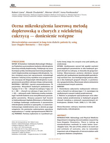 PRACA ORYGINALNA ISSN 1640–8497 Robert Liana1, Marek Chudański1, Werner Ulrich2, Irena Ponikowska1 1Katedra 2Instytut i Zakład Balneologii i Medycyny Fizykalnej Collegium Medicum Uniwersytetu im. Mikołaja Kopernika w Toruniu Ekologii i Ochrony Środowiska Collegium Medicum Uniwersytetu im. Mikołaja Kopernika w Toruniu Ocena mikrokrążenia laserową metodą doplerowską u chorych z wieloletnią cukrzycą — doniesienie wstępne Microcirculation assessment in long-term diabetic patients by using laser-Doppler flowmetry — first report STRESZCZENIE lucha lewej stopy (na szczycie oraz pod płytką pa- WSTĘP. W Katedrze i Zakładzie Balneologii i Medycy- znokciową). ny Fizykalnej są prowadzone badania mikrokrążenia WYNIKI. Analizowano wzrost lub spadek wartości laserową metodą doplerowską. Podejmuje się coraz poszczególnych parametrów w obu badanych gru- liczniejsze próby standaryzacji laserowej przepływo- pach chorych na cukrzycę, w stosunku do grupy kon- metrii doplerowskiej oceniającej mikrokrążenie. Ce- trolnej. Obserwowano zarówno obniżone (szczyt lem niniejszej pracy jest opracowanie metodologii palucha), jak i podwyższone (poniżej płytki paznokcio- badania i własnej oceny wyników oraz przypomnie- wej) wartości tzw. zera biologicznego podczas oklu- nie znaczącej roli diagnostyki mikrokrążenia w pro- zji w obu badanych grupach chorych, w porówna- gnozowaniu powikłań cukrzycy (stopy cukrzycowej). niu z grupą kontrolną. Obserwacje własne zestawiono MATERIAŁ I METODY. Łącznie przeanalizowano 74 z doniesieniami innych autorów. pacjentów. Wszystkich badanych podzielono na WNIOSKI 3 grupy: C1 (n = 16) — chorych na cukrzycę 1 typu, C2 1. Stwierdzono zaburzenia reaktywności mikrona- (n = 38) — chorych na cukrzycę 2 typu oraz K (n = czyń u chorych na cukrzycę typu 1 i 2, wyrażające się = 20) — zdrowych osób. Dokonano analizy metodo- wydłużonymi czasami reakcji przekrwiennej. logii i techniki badania oraz zweryfikowano poszcze- 2. Różnice w przepływie spoczynkowym oraz zabu- gólne parametry. Wszyscy pacjenci byli leczeni rzonej reakcji przekrwiennej w badanych grupach w Uzdrowiskowym Szpitalu Klinicznym w Ciechocinku. chorych świadczą o zmianach czynnościowych mi- U każdego badanego analizowano 9 parametrów krokrążenia. (Diabet. Prakt. 2008, 9, 5: 195–200) mikrokrążenia zarówno w spoczynku, w czasie kontrolowanego niedokrwienia oraz w okresie po jego Słowa kluczowe: cukrzyca, laserowa metoda ustąpieniu. Do pomiarów wykorzystano aparaturę doplerowska, mikrokrążenie wyposażoną w 1 sondę i oprogramowanie PIM II firmy PERIMED. Pomiary wykonano w 2 punktach pa- ABSTRACT INTRODUCTION. Balneology and Physical Medicine Department is keeping microcirculation research by Adres do korespondencji: lek. Robert Liana Katedra i Zakład Balneologii i Medycyny Fizykalnej Collegium Medicum UMK w Toruniu ul. Leśna 3, 87–720 Ciechocinek tel.: (054) 283 39 15; faks: (054) 283 39 45 Diabetologia Praktyczna 2008, tom 9, 5, 195–200 Copyright © 2008 Via Medica Nadesłano: 29.09.2008 Przyjęto do druku:13.10.2008 laser-Doppler flowmetry. There is taking up standardization methods to make better laser-Doppler tests. The aim of this article is to work out and estimate of outcome, also to remember important role of diagnostic of microcirculation with prognosis diabetes compilation. www.dp.viamedica.pl 195 Diabetologia Praktyczna 2008, tom 9, nr 5 MATERIAL AND METHOD. There were analyzed 74 patients at all. The patients were divided into 3 groups; C1 (n = 16) — diabetic type 1, C2 (n = 38) — diabetic type 2, K (n= 20) — control group. There was made methodology and technique of research and was verified individual parameters. All researches derived from Balneology Hospital in Ciechocinek. All patients were analyzed 9 parameters also in rest, during occlusion test and during hyperemia test. To our measurement used one pointed laser and PIM II Program made Perimed Company. The measurements was made in two points of a big toe on the left foot (the top of a big toe and beneath nail). RESULTS. There was analyzed increase or decrease vales of individual parameters in both group of diabetic patients relative of the control group. There was observed also lower (top of the toe) and higher (beneath the nail) values of biological zero during occlusion test in both diabetic groups relative of the control group. Our observation was compared with outcome others. CONCLUSION 1. There was observed worse reaction hyperemia of microcirculation in both diabetic groups which have niem tej choroby jest zespół stopy cukrzycowej. Oszacowano, że ryzyko wystąpienia zgorzeli stopy i amputacji kończyny dolnej jest około 20-krotnie większe wśród chorych na cukrzycę niż w populacji ogólnej [1]. Wielu autorów nadmienia, że zmiany na poziomie mikrokrążenia, obok zmian makronaczyniowych, determinują wykonywanie zabiegów amputacyjnych kończyn dolnych [1–5]. Zaburzona reaktywność naczyń kapilarnych łączy się ściśle z cukrzycą, a zmiany patologiczne przebiegają szybciej u osób, u których choroba nie jest dobrze wyrównana metabolicznie. Nieprawidłowości zaczynają się od zaburzeń czynnościowych, a w dalszej kolejności następują zmiany strukturalne, zmiany reologiczne krwi, a także upośledzenie autoregulacji naczyń [4, 6]. Istotą laserowego badania doplerowskiego jest rejestracja parametrów fali świetlnej odbitej od elementów morfotycznych w naczyniach. Odbita fala od erytrocytów (jest ich ilościowo najwięcej) ma zmienioną częstotliwość, uzależnioną od prędkości krwinek i kąta, jaki tworzą kierunki ruchu krwinek z fotonem światła laserowego. Możliwość przetworzenia parametrów fali i ich analiza stwarzają pośrednią szansę oceny liczby krwinek, wraz z ich prędkością [7–9]. had longer time of hyperemia reaction. 2. Differences in rest flow and worse hyperemia Materiał i metody reaction in 