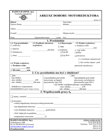 RADIUS-RADPOL sp.j. Technika napędowa ARKUSZ DOBORU MOTOREDUKTORA strona 1/2 Klient : Nazwisko Nazwa firmy: ____________________________________ klienta:_____________________________ Adres: _________________________________________ ___________________________________ E-mail: ________________________________________ Miejscowość: ________________________ Data___________________Zapotrzebowanie: _____ sztuk Tel:________________________________ 1. Przekładnia 1.1 Typ przekładni: walcowa kątowa 1.3 Prędkość obrotowa wyjściowa: 1.4 Mocowanie: ______________obr/min ślimakowa inna: ____________ łapy kołnierz Typ B5 Typ B14 1.5 Wałek wyjściowy: • średnica wału: ______________mm • Typ wału: pełny otworowy z rowkiem wpustowym bez rowka wpust.- pod 1.2 Wałek wejściowy • Średnica wału: _______________mm • Dł.wału:______mm pierścień zaciskowy) 2. Czy przekładnia ma być z silnikiem? tak - typ silnika: - moc silnika: ____________kW - obr. silnika:___________obr/min - dodatkowe wyposaŜenie niestandardowe (patrz druga strona) nie przekładnia pod silnik przekładnia pod silnik mocowany na łapach mocowany na kołnierzu (przystawka typu W): (przystawka typu IEC): - typ silnika współpracującego z przekładnią: - moc silnika:___________kW - obr. silnika:_________obr/min 3. Współczynnik pracy fB znany, wartość: ______________________________ nieznany: - rodzaj napędzanej maszyny/rodzaj przemysłu:____________________________________________ - typ napędzanej maszyny: ____________________________________________________________ - czas działania maszyny: _________godz/dzień - ilość załączeń na godzinę:________ - temperatura otoczenia: __________ºC RADIUS-RADPOL Sp.j. ul.Kolejowa 16B 60 185 SKÓRZEWO k/Poznania [email protected] Przedstawiciel: Arkusz wysłać na fax: 0- 61 814 38 43 Telefony: 0-61 814 39 28 894 61 58 894 65 03 RADIUS-RADPOL sp.j. Technika napędowa ARKUSZ DOBORU MOTOREDUKTORA strona 2/2 Dodatkowe wyposaŜenie niestandardowe silnika: • napięcie zasilania: ____________________ • rodzaj pracy (np. ciągła): _______________ • częstotliwość: ________________________ • klasa izolacji:_________________________ • stopień ochrony:_______________________ V Hz hamulec elektromagnetyczny - wielkość momentu hamowania:_________ Nm - napięcie zasilania hamulca:_____________ V moŜliwość ręcznego odblokowania blokada ruchu powrotnego zabezpieczenia termiczne przed przegrzaniem dodatkowy, niezaleŜnie zasilany wentylator zabezpieczenie przeciwwybuchowe Inne: RADIUS-RADPOL Sp.j. ul.Kolejowa 16B 60 185 SKÓRZEWO k/Poznania [email protected] Przedstawiciel: Arkusz wysłać na fax: 0- 61 814 38 43 Telefony: 0-61 814 39 28 894 61 58 894 65 03