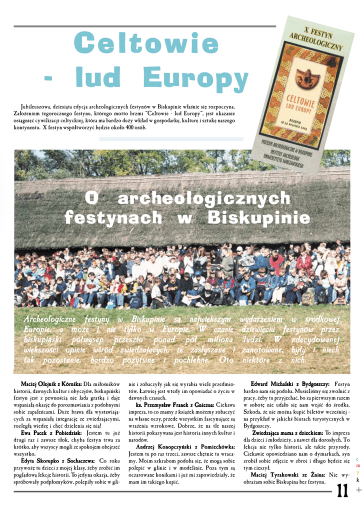 Celtowie − lud Europy Jubileuszowa, dziesiąta edycja archeologicznych festynów w Biskupinie właśnie się rozpoczyna. Założeniem tegorocznego festynu, którego motto brzmi “Celtowie − lud Europy”, jest ukazanie osiągnięć cywilizacji celtyckiej, która ma bardzo duży wkład w gospodarkę, kulturę i sztukę naszego kontynentu. X festyn współtworzyć będzie około 400 osób. O archeologicznych festynach w Biskupinie Archeologiczne festyny w Biskupinie są największym Europie, a może i nie tylko w Europie. W czasie biskupiński półwysep przeszło ponad pół miliona większości opinie wśród zwiedzających, te zasłyszane i tak pozostanie, bardzo pozytwne i pochlebne. Oto Maciej Olejnik z Kórnika: Dla miłośników historii, dawnych kultur i obyczjów, biskupiński festyn jest z pewnością nie lada gratką i daje wspaniałą okazję do porozmawiania z podobnymi sobie zapaleńcami. Duże brawa dla wystawiają− cych za wspaniałą integrację ze zwiedzającymi, rozległą wiedzę i chęć dzielenia się nią! Ewa Pacek z Pobiedzisk: Jestem tu już drugi raz i zawsze tłok, chyba festyn trwa za krótko, aby wszyscy mogli ze spokojem obejrzeć wszystko. Edyta Skorupko z Sochaczewa: Co roku przywożę tu dzieci z mojej klasy, żeby zrobić im poglądową lekcję historii. To jedyna okazja, żeby spróbowały podpłomyków, polepiły sobie w gli− nie i zobaczyły jak się wyrabia wiele przedmio− tów. Łatwiej jest wtedy im opowiadać o życiu w dawnych czasach. ks. Przemysła w Franek z Gniezna: Ciekawa Przemysław impreza, to co znamy z książek możemy zobaczyć na własne oczy, przede wszystkim fascynujące są wrażenia wzrokowe. Dobrze, że na tle naszej historii pokazywana jest historia innych kultur i narodów. Andrzej Konopczyński z Pomiechówka: Jestem tu po raz trzeci, zawsze chętnie tu wraca− my. Moim szkrabom podoba się, że mogą sobie polepić w glinie i w modelinie. Poza tym są oczarowane konikami i już mi zapowiedziały, że mam im takiego kupić. wydarzeniem w środkowej dziewięciu festynów przez ludzi. W zdecydowanej zanotowane, były i niech niektóre z nich. Edward Michalski z Bydgoszczy: Festyn bardzo nam się podoba. Musieliśmy się zwolnić z pracy, żeby tu przyjechać, bo za pierwszym razem w sobotę nie udało się nam wejść do środka. Szkoda, że nie można kupić biletów wcześniej − na przykład w jakichś biurach turystycznych w Bydgoszczy. Zw iedzająca mama z dzieckiem: To impreza Zwiedzająca dla dzieci i młodzieży, a nawet dla dorosłych. To lekcja nie tylko historii, ale także przyrody. Ciekawie opowiedziano nam o dymarkach, syn zrobił sobie zdjęcie w zbroi i długo będzie się tym cieszył. Maciej Tyrakowski ze Żnina: Nie wy− obrażam sobie Biskupina bez festynu. 11 c m y k