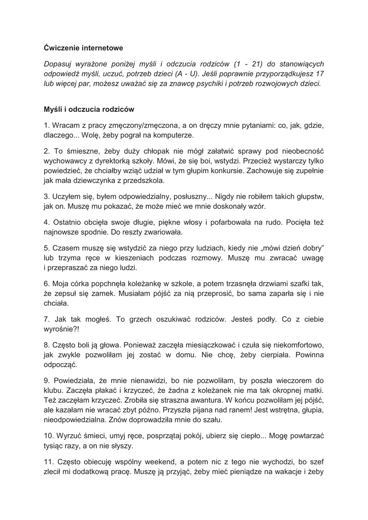 Ćwiczenie internetowe Dopasuj wyrażone poniżej myśli i odczucia rodziców (1 - 21) do stanowiących odpowiedź myśli, uczuć, potrzeb dzieci (A - U). Jeśli poprawnie przyporządkujesz 17 lub więcej par, możesz uważać się za znawcę psychiki i potrzeb rozwojowych dzieci. Myśli i odczucia rodziców 1. Wracam z pracy zmęczony/zmęczona, a on dręczy mnie pytaniami: co, jak, gdzie, dlaczego... Wolę, żeby pograł na komputerze. 2. To śmieszne, żeby duży chłopak nie mógł załatwić sprawy pod nieobecność wychowawcy z dyrektorką szkoły. Mówi, że się boi, wstydzi. Przecież wystarczy tylko powiedzieć, że chciałby wziąć udział w tym głupim konkursie. Zachowuje się zupełnie jak mała dziewczynka z przedszkola. 3. Uczyłem się, byłem odpowiedzialny, posłuszny... Nigdy nie robiłem takich głupstw, jak on. Muszę mu pokazać, że może mieć we mnie doskonały wzór. 4. Ostatnio obcięła swoje długie, piękne włosy i pofarbowała na rudo. Pocięła też najnowsze spodnie. Do reszty zwariowała. 5. Czasem muszę się wstydzić za niego przy ludziach, kiedy nie „mówi dzień dobry” lub trzyma ręce w kieszeniach podczas rozmowy. Muszę mu zwracać uwagę i przepraszać za niego ludzi. 6. Moja córka popchnęła koleżankę w szkole, a potem trzasnęła drzwiami szafki tak, że zepsuł się zamek. Musiałam pójść za nią przeprosić, bo sama zaparła się i nie chciała. 7. Jak tak mogłeś. To grzech oszukiwać rodziców. Jesteś podły. Co z ciebie wyrośnie?! 8. Często boli ją głowa. Ponieważ zaczęła miesiączkować i czuła się niekomfortowo, jak zwykle pozwoliłam jej zostać w domu. Nie chcę, żeby cierpiała. Powinna odpocząć. 9. Powiedziała, że mnie nienawidzi, bo nie pozwoliłam, by poszła wieczorem do klubu. Zaczęła płakać i krzyczeć, że żadna z koleżanek nie ma tak okropnej matki. Też zaczęłam krzyczeć. Zrobiła się straszna awantura. W końcu pozwoliłam jej pójść, ale kazałam nie wracać zbyt późno. Przyszła pijana nad ranem! Jest wstrętna, głupia, nieodpowiedzialna. Znów doprowadziła mnie do szału. 10. Wyrzuć śmieci, umyj ręce, posprzątaj pokój, ubierz się ciepło... Mogę powtarzać tysiąc razy, a on nie słyszy. 11. Często obiecuję wspólny weekend, a potem nic z tego nie wychodzi, bo szef zlecił mi dodatkową pracę. Muszę ją przyjąć, żeby mieć pieniądze na wakacje i żeby zapewnić synowi dobry start. On jednak nie chce tego zrozumieć, obraża się, a ja chodzę rozdrażniony. 12. Nie rozumie podstawowych norm. Nie chce robić tego, o co proszę, chociaż wielokrotnie mu powtarzam. Traktuje mnie niepoważnie, nie szanuje zasad. Doprowadza mnie do złości, aż nie wytrzymuję - wrzeszczę, wyłączam tę piekielną muzykę i odcinam Internet na parę dni. 13. Tyle dzieciaków sięga po narkotyki, kradnie i zadaje się z łobuzami, że muszę wszystko sprawdzać. Dzwonię do jego kolegów, chodzę za nim do szkoły, przeglądam jego szuflady. Nie chcę, żeby wpadł w złe towarzystwo, a on i tak chodzi na wagary i popala papierosy. 14. Ustępuję jej dla świętego spokoju. Ale zaczyna mnie wykorzystywać, za dobra jestem dla niej. Zaczyna sobie wyobrażać, że to ona tu rządzi. 15. Jak mogę odmówić własnej córce? To tylko drobna przyjemność, na którą moich rodziców nigdy nie było stać. Żebym miała suchy chleb jeść, kupię jej ten ciuch. Przecież moje dziecko nie może chodzić w niemodnych ubraniach. 16. Nie mogę wytrzymać, gdy chodzi smutny, ze spuszczoną głową i zmniejszam mu karę, albo w ogóle odwołuję. To w końcu tylko dziecko. 17. Kiedy po przyjściu z pracy poczułem zapach dymu i piwa, przestraszyłam się i zdenerwowałam. Nie wiedziałam, co zrobić. Kiedyś też czułam zapach tytoniu, ale nie chciałam robić awantury. To pewnie któryś z jego kolegów. Mój syn przecież nie pali i nie pije. 18. Chyba za daleko się posunęłam, obrażając ją, ale nie mogę się już wycofać. Trudno, trzeba być silnym, konsekwentnym. 19. Patrzę na niego, ten wzrost, wąsy pod nosem... Dla mnie zawsze będzie małym chłopcem. 20. Naprawdę nie wiem, czemu się tak złości, gdy mówię do niego „dziecko” lub „synku”, albo poprawiam mu kołnierzyk. Przecież to dla jego dobra przypominam: „Załóż czapkę”, „Umyj uszy”, „Nie biegnij do szkoły, bo się zgrzejesz”. 21. Brakuje mi czasu, a ona niczego nie umie porządnie zrobić, zawsze muszę ją poprawiać. A to nie ułoży szklanek jak trzeba, a to ubrań... Poza tym tak się guzdrze, że musze ją wyręczać, a ona ma jeszcze humory i pretensje. Myśli, uczucia, potrzeby dzieci A. Gdy atakuję, ty w końcu ulegasz i pozwalasz bym decydowała, a to dla mnie zbyt wielki ciężar. To ty go musisz unieść. Potrzebuję jasno określonych zasad. Bądź stanowcza, konsekwentna. Nie dawaj mi odpowiedzialności, na którą nie jestem gotowa. B. Czuję się osaczony i dlatego uciekam ze szkoły, palę. Zaufaj mi, pozwól być odpowiedzialnym nastolatkiem. Nie sprawdzaj mnie na każdym kroku. C. Mówisz, że moje lęki są nieistotne. Wyśmiewasz je. One po prostu są i oczekuję od ciebie wsparcia, pomocy. D. Bądź stanowcza. Kiedy mi ustępujesz, jeszcze bardziej wykorzystuję sytuację i tracę do ciebie zaufanie, jestem zdezorientowana. To ty powinnaś ustalać granice, być szefem. E. Odtrącasz mnie, kiedy chcę porozmawiać. Jeśli tak będzie dalej, odpowiedzi poszukam gdzie indziej i przestaniemy rozmawiać. F. Rozpieszczasz mnie. Nie muszę mieć tylu ciuchów. Chcę cię wypróbować, sprawdzić jak daleko mogę się posunąć. Gdy zwyciężę, będę nieszczęśliwa, bo jestem jeszcze zbyt młoda, żeby ponosić za siebie pełną odpowiedzialność. G. Oczekujesz czegoś, ale nie na poważnie, bo pozwalasz bym zajmował się nadal swoimi sprawami. Prosisz, mówisz o zasadach, lecz ich nie egzekwujesz, a potem się wściekasz. Nie wiem, o co ci chodzi! Jeśli mam coś zrobić,
