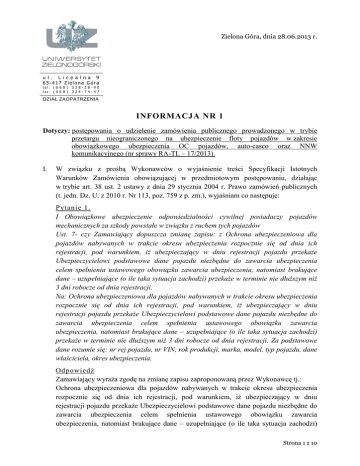 Zielona Góra, dnia 28.06.2013 r. u l . L i c e a l n a 9 65-417 Zielona Góra tel. ( 0 6 8 ) fax. ( 0 6 8 ) 328-28-90 324-74-47 DZIAŁ ZAOPATRZENIA INFORMACJA NR 1 Dotyczy: postępowania o udzielenie zamówienia publicznego prowadzonego w trybie przetargu nieograniczonego na ubezpieczenie floty pojazdów w zakresie obowiązkowego ubezpieczenia OC pojazdów, auto-casco oraz NNW komunikacyjnego (nr sprawy RA-TL – 17/2013). I. W związku z prośbą Wykonawców o wyjaśnienie treści Specyfikacji Istotnych Warunków Zamówienia obowiązującej w przedmiotowym postępowaniu, działając w trybie art. 38 ust. 2 ustawy z dnia 29 stycznia 2004 r. Prawo zamówień publicznych (t. jedn. Dz. U. z 2010 r. Nr 113, poz. 759 z p. zm.), wyjaśniam co następuje: Pytanie 1. I Obowiązkowe ubezpieczenie odpowiedzialności cywilnej posiadaczy pojazdów mechanicznych za szkody powstałe w związku z ruchem tych pojazdów Ust. 7- czy Zamawiający dopuszcza zmianę zapisu: z Ochrona ubezpieczeniowa dla pojazdów nabywanych w trakcie okresu ubezpieczenia rozpocznie się od dnia ich rejestracji, pod warunkiem, iŜ ubezpieczający w dniu rejestracji pojazdu przekaŜe Ubezpieczycielowi podstawowe dane pojazdu niezbędne do zawarcia ubezpieczenia celem spełnienia ustawowego obowiązku zawarcia ubezpieczenia, natomiast brakujące dane – uzupełniające (o ile taka sytuacja zachodzi) przekaŜe w terminie nie dłuŜszym niŜ 3 dni robocze od dnia rejestracji. Na: Ochrona ubezpieczeniowa dla pojazdów nabywanych w trakcie okresu ubezpieczenia rozpocznie się od dnia ich rejestracji, pod warunkiem, iŜ ubezpieczający w dniu rejestracji pojazdu przekaŜe Ubezpieczycielowi podstawowe dane pojazdu niezbędne do zawarcia ubezpieczenia celem spełnienia ustawowego obowiązku zawarcia ubezpieczenia, natomiast brakujące dane – uzupełniające (o ile taka sytuacja zachodzi) przekaŜe w terminie nie dłuŜszym niŜ 3 dni robocze od dnia rejestracji. Za podstawowe dane rozumie się: nr rej pojazdu, nr VIN, rok produkcji, marka, model, typ pojazdu, dane właściciela, okres ubezpieczenia. Odpowiedź Zamawiający wyraŜa zgodę na zmianę zapisu zaproponowaną przez Wykonawcę tj.: Ochrona ubezpieczeniowa dla pojazdów nabywanych w trakcie okresu ubezpieczenia rozpocznie się od dnia ich rejestracji, pod warunkiem, iŜ ubezpieczający w dniu rejestracji pojazdu przekaŜe Ubezpieczycielowi podstawowe dane pojazdu niezbędne do zawarcia ubezpieczenia celem spełnienia ustawowego obowiązku zawarcia ubezpieczenia, natomiast brakujące dane – uzupełniające (o ile taka sytuacja zachodzi) Strona 1 z 10 przekaŜe w terminie nie dłuŜszym niŜ 3 dni robocze od dnia rejestracji. Za podstawowe dane rozumie się: nr rej pojazdu, nr VIN, rok produkcji, marka, model, typ pojazdu, dane właściciela, okres ubezpieczenia. Pytanie 2. III Ubezpieczenie auto- casco Ust. 6. Prosimy o wyjaśnienie Ŝe w szkodach likwidowanych z ubezpieczenia AUTOCASCO Zamawiający przewiduje brak potrącania zuŜycia części i/lub amortyzacji, nie dotyczy szkód powstałych w ogumieniu pojazdu. Odpowiedź Zamawiający wyjaśnia iŜ w szkodach likwidowanych z ubezpieczenia AUTO- CASCO przewiduje brak potrącania zuŜycia części i/lub amortyzacji, nie dotyczy szkód powstałych w ogumieniu pojazdu. Pytanie 3. Likwidacja szkód z ubezpieczenia auto- casco Pkt. 3) Czy Zamawiający dopuszcza zmianę zapisu definicji szkody całkowitej z: szkoda, której naprawy przekraczają 75% wartości rynkowej pojazdu w dniu zaistnienia szkody Na: uszkodzenie pojazdu w takim zakresie, Ŝe koszty naprawy przekraczają 70% wartości pojazdu w dniu ustalenia odszkodowania. Odpowiedź Zamawiający modyfikuje treść pkt. III.6.3) w załączniku nr 1 do SIWZ Opis przedmiotu zamówienia w następujący sposób: Dotychczasową treść: „Szkoda całkowita - szkoda dla której koszty naprawy przekraczają 75% wartości rynkowej pojazdu w dniu zaistnienia szkody”. Zastępuje się treścią: „Szkoda całkowita - szkoda której naprawy przekraczają 70% wartości rynkowej pojazdu w dniu zaistnienia szkody”. Pytanie 4. Pkt. 4) Czy Zamawiający dopuszcza zmianę zapisu poprzez wykreślenie zapisu zaczynającego się od słów: „przy jednoczesnym przeniesieniu praw własności do pozostałości na Ubezpieczyciela”? Odpowiedź Zamawiający modyfikuje treść pkt. III.6.4) w załączniku nr 1 do SIWZ Opis przedmiotu zamówienia w następujący sposób: Dotychczasową treść: „W wypadku szkód całkowitych - odszkodowanie jest kalkulowane jako róŜnica pomiędzy wartością rynkową (lub sumą ubezpieczenia) pojazdu minus wartość pozostałości lub wypłacane do wysokości wartości rynkowej (lub sumy ubezpieczenia) przy jednoczesnym przeniesieniu praw własności do pozostałości na Ubezpieczyciela”. Zastępuje się treścią: „W wypadku szkód całkowitych - odszkodowanie jest kalkulowane jako róŜnica pomiędzy wartością rynkową (lub sumą ubezpieczenia) pojazdu minus wartość pozostałości .Przy czym Ubezpieczyciel na wniosek Zamawiającego udzieli pomocy w zagospodarowaniu pozostałości po szkodzie, w szczególności poprzez wystawienie pozostałości po szkodzie na aukcji internetowej. W przypadku przejęcia na własność uszkodzonego pojazdu przez Ubezpieczyciela, odszkodowanie ustala się w Strona 2 z 10 kwocie równej wartości pojazdu bez pomniejszania o wartość pozostałości, jednak nie większej niŜ suma ubezpieczenia określona w umowie”. Pytanie 5. Pkt 6). Czy Zamawiający dopuszcza zmianę zapisu z: Szkody regresowe nie będą obciąŜały szkodowości ubezpieczającego (niezaleŜnie od tego czy regres zostanie dokonany (w całości, częściowo) czy teŜ w ogóle niezostanie dokonany przez Zakład Ubezpieczeń). Na: Szkody regresowe nie będą obciąŜały szkodowości ubezpieczającego pod warunkiem, Ŝe regres został w całości spłacony. Odpowiedź Zamawiający modyfikuje treść pkt. III.6.6) w załączniku nr 1 do SIWZ Opis p