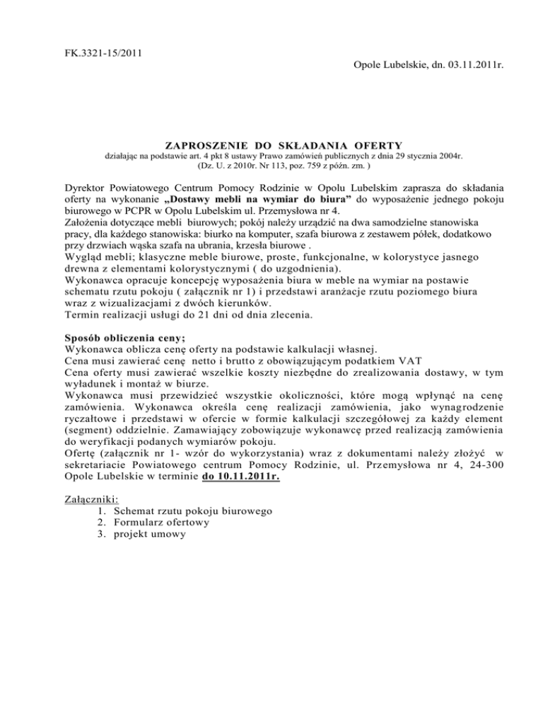 FK.3321-15/2011 Opole Lubelskie, dn. 03.11.2011r. ZAPROSZENIE DO SKŁADANIA OFERTY działając na podstawie art. 4 pkt 8 ustawy Prawo zamówień publicznych z dnia 29 stycznia 2004r. (Dz. U. z 2010r. Nr 113, poz. 759 z późn. zm. ) Dyrektor Powiatowego Centrum Pomocy Rodzinie w Opolu Lubelskim zaprasza do składania oferty na wykonanie „Dostawy mebli na wymiar do biura” do wyposażenie jednego pokoju biurowego w PCPR w Opolu Lubelskim ul. Przemysłowa nr 4. Założenia dotyczące mebli biurowych; pokój należy urządzić na dwa samodzielne stanowiska pracy, dla każdego stanowiska: biurko na komputer, szafa biurowa z zestawem półek, dodatkowo przy drzwiach wąska szafa na ubrania, krzesła biurowe . Wygląd mebli; klasyczne meble biurowe, proste, funkcjonalne, w kolorystyce jasnego drewna z elementami kolorystycznymi ( do uzgodnienia). Wykonawca opracuje koncepcję wyposażenia biura w meble na wymiar na postawie schematu rzutu pokoju ( załącznik nr 1) i przedstawi aranżacje rzutu poziomego biura wraz z wizualizacjami z dwóch kierunków. Termin realizacji usługi do 21 dni od dnia zlecenia. Sposób obliczenia ceny; Wykonawca oblicza cenę oferty na podstawie kalkulacji własnej. Cena musi zawierać cenę netto i brutto z obowiązującym podatkiem VAT Cena oferty musi zawierać wszelkie koszty niezbędne do zrealizowania dostawy, w tym wyładunek i montaż w biurze. Wykonawca musi przewidzieć wszystkie okoliczności, które mogą wpłynąć na cenę zamówienia. Wykonawca określa cenę realizacji zamówienia, jako wynag rodzenie ryczałtowe i przedstawi w ofercie w formie kalkulacji szczegółowej za każdy element (segment) oddzielnie. Zamawiający zobowiązuje wykonawcę przed realizacją zamówienia do weryfikacji podanych wymiarów pokoju. Ofertę (załącznik nr 1- wzór do wykorzystania) wraz z dokumentami należy złożyć w sekretariacie Powiatowego centrum Pomocy Rodzinie, ul. Prz emysłowa nr 4, 24-300 Opole Lubelskie w terminie do 10.11.2011r. Załączniki: 1. Schemat rzutu pokoju biurowego 2. Formularz ofertowy 3. projekt umowy Nr sprawy FK.3321-15/2011 miejscowość, data. …………………..….. (pieczęć Wykonawcy) OFERTA Zamawiający: Powiatowe Centrum Pomocy Rodzinie w Opolu Lubelskim siedziba: ul. Przemysłowa 4, 24-300 Opole Lubelskie, powiat opolski, woj. lubelskie Dane wykonawcy: Nazwa: ............................................................................. Siedziba: ............................................................................ ............................................................................. Numer tel/fax : ............................................................................. Numer REGON: ............................................................................. Numer NIP: ............................................................................. W odpowiedzi na zaproszenie do składania oferty na : „Dostawę mebli na wymiar do biura” Oferujemy wykonanie przedmiotu zamówienia określonego w zaproszeniu z godnie z warunkami określonymi przez Zamawiającego za cenę ; 1………. 2……….. 3………. 4………. 5………. Razem ……………… Oświadczam, że zapoznaliśmy się z treścią warunków realizacji zamówienia i akceptujemy 21 dniowy termin realizacji zamówienia od dnia zawarcia umowy. Do oferty załączam: 1. koncepcja, wizualizacje mebli 2. ……………………………………………………… _____________________________________ (imię i nazwisko) podpis uprawnionego przedstawiciela wykonawcy Umowa zawarta w dniu ….11.2011r. w Opolu Lubelskim pomiędzy: Powiatowym Centrum Pomocy Rodzinie w Opolu Lubelskim reprezentowanym przez Dyre ktora PCPR – Panią Krystynę Piłat, zwanym dalej „Odbiorcą”, a …………………………… …………………….., zwanym dalej „Dostawcą”; w rezultacie dokonania przez Zamawiającego wyboru oferty na podstawie art. 4 pkt 8 ustawy Prawo zamówień publicznych z dnia 29 stycznia 2004r. (Dz. U. z 2010r. Nr 113, poz. 759 z późn. zm. ) została zawarta umowa o następującej treści : §1 Dostawca zobowiązuje się do dostarczenia Odbiorcy mebli biurowych na wymiar do wyposażenia jednego pokoju biurowego w PCPR w Opolu Lubelskim ul. Przemysłowa nr 4, zgodnie z zaakceptowana ofertą z dnia …….. – załącznik nr 1 do w/w umowy. Przedmiotem dostawy jest wyposażenie biura w meble wraz z rozładunkiem, montażem i ustawieniem w pomieszczeniu budynku. §2 Odbiorca zobowiązuje się zapłacić Dostawcy za przedmiot umowy kwotę w wysokości : ………….zł (brutto) słownie: ………..na konto Dostawcy …………………………… §3 1. W / w dostawa będzie realizowana z chwilą podpisania umowy. Dostawca zobowiązany jest do sprawdzenia wymiarów pokoju biurowego. 2. Dostawa będzie realizowana w uzgodnieniu z przedstawicielem odbiorcy p. …………… 3. Po zrealizowaniu całości przedmiotu zamówienia Odbiorca ureguluje zapłatę na konto Dostawcy w terminie 7 dni od daty protokolarnego odbioru przedmiotu umowy i otrzymania faktury. §4 Termin realizacji dostawy do 21 dni od dnia zawarcia umowy. §5 1. Dostawca oświadcza, że przedmiot umowy jest wolny od wszelkich długów i obciążeń. 2. Dostawca udziela 24 miesięcy gwarancji na meble wymienione w § 1 umowy. 3. Termin gwarancji liczony jest od dnia odbioru przedmiotu dostawy. §6 W przypadku zapłaty należności z faktury przez Odbiorcę z opóźnieniem zobowiązany on będzie zapłacić Dostawcy ustawowe odsetki. §7 W razie nie wykonania umowy: 1. Dostawca zobowiązuje się zapłacić karę umowną w wysokości 0,1 % wartości umownej zamówienia za każdy dzień zwłoki terminu umownego, a w przypadku odstąpienia od umowy 10% wartości umowy. 2. Odbiorca zobowiązuje się zapłacić karę umowną w wysokości 0,1 % wartośc i umownej zamówienia w razie odstąpienia przez Dostawcę od umowy z powodu okoliczności za które ponosi