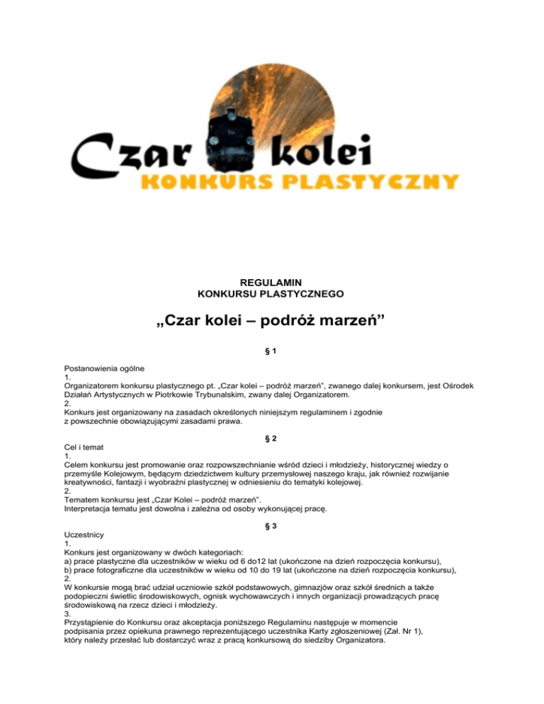 REGULAMIN KONKURSU PLASTYCZNEGO „Czar kolei – podróż marzeń” § 1 Postanowienia ogólne 1. Organizatorem konkursu plastycznego pt. „Czar kolei – podróż marzeń”, zwanego dalej konkursem, jest Ośrodek Działań Artystycznych w Piotrkowie Trybunalskim, zwany dalej Organizatorem. 2. Konkurs jest organizowany na zasadach określonych niniejszym regulaminem i zgodnie z powszechnie obowiązującymi zasadami prawa. § 2 Cel i temat 1. Celem konkursu jest promowanie oraz rozpowszechnianie wśród dzieci i młodzieży, historycznej wiedzy o przemyśle Kolejowym, będącym dziedzictwem kultury przemysłowej naszego kraju, jak również rozwijanie kreatywności, fantazji i wyobraźni plastycznej w odniesieniu do tematyki kolejowej. 2. Tematem konkursu jest „Czar Kolei – podróż marzeń”. Interpretacja tematu jest dowolna i zależna od osoby wykonującej pracę. § 3 Uczestnicy 1. Konkurs jest organizowany w dwóch kategoriach: a) prace plastyczne dla uczestników w wieku od 6 do12 lat (ukończone na dzień rozpoczęcia konkursu), b) prace fotograficzne dla uczestników w wieku od 10 do 19 lat (ukończone na dzień rozpoczęcia konkursu), 2. W konkursie mogą brać udział uczniowie szkół podstawowych, gimnazjów oraz szkół średnich a także podopieczni świetlic środowiskowych, ognisk wychowawczych i innych organizacji prowadzących pracę środowiskową na rzecz dzieci i młodzieży. 3. Przystąpienie do Konkursu oraz akceptacja poniższego Regulaminu następuje w momencie podpisania przez opiekuna prawnego reprezentującego uczestnika Karty zgłoszeniowej (Zał. Nr 1), który należy przesłać lub dostarczyć wraz z pracą konkursową do siedziby Organizatora. § 4 Warunki uczestnictwa 1. Każdy uczestnik ma prawo do zgłoszenia w konkursie trzech prac plastycznych nawiązującej do tematu konkursu, wykonaną indywidualnie i samodzielnie (nie dopuszcza się prac zbiorowych). 2. W Konkursie oceniane będą wyłącznie prace plastyczne spełniające następujące kryteria: Kategoria I Prace wykonane dowolną techniką plastyczną: rysowanie, malowanie, wyklejanie, wydzierania, itp. sporządzone w formacie A3 Kategoria II Odbitki fotograficzne o formacie 21 x 28 cm lub 21 x 30 cm. 3. Konkurs nie obejmuje prac na szkle, z plasteliny oraz przestrzennych. 4. Praca musi być o pisana. Do pracy należy dołączyć Kartę zgłoszeniową będącą załącznikiem Nr 1 do Regulaminu. Brak karty zgłoszeniowej jest równoznaczny z wyłączeniem pracy z Konkursu ze względów formalnych. 5. Prace nie podlegają zwrotowi, a zgłoszenie prac do konkursu jest równoznaczne z przejściem majątkowych praw autorskich na rzecz Organizatora bez prawa do wynagrodzenia twórcy. Dane osobowe uczestników będą wykorzystane wyłącznie w celu wyłonienia zwycięzcy i przyznania nagrody. 6. Z chwilą nadesłania prace przechodzą na własność Organizatora. Organizator zastrzega sobie prawo do nieodpłatnego ich wykorzystania (druku w dowolnej liczbie publikacji i w dowolnym nakładzie, używania ich w Internecie oraz w innych formach utrwaleń, nadających się do rozpowszechniania). 7. Organizator zastrzega sobie prawo do wyłączenia z Konkursu prac przestrzennych, a także prac zrolowanych, złożonych i pogniecionych, które nie nadają się do dalszej obróbki graficznej. W związku z tym prosimy o zadbanie o właściwy transport lub przesyłkę prac. 8. Organizator nie zwraca prac biorących udział w Konkursie, prac zdyskwalifikowanych, prac wysłanych po terminie, jak również z niego wyłączonych. 9. Nadesłanie prac oznacza akceptację warunków konkursu i regulaminu, którego ostateczna interpretacja należy do Komisji Konkursowej. Żadne odwołania nie zostaną uwzględnione. § 5 Termin i warunki dostarczenia prac. 1. Prace należy przesłać pocztą, z dopiskiem „Konkurs plastyczny” w terminie do 31 maja 2015r . na adres Organizatora: Ośrodek Działań Artystycznych Ul. Sieradzka 8 97300 Piotrków Trybunalski 2. Organizator zastrzega sobie prawo wydłużenia terminu nadsyłania prac. 3. Prace przesłane po terminie nie będą oceniane. 4. Organizatorzy nie ponoszą odpowiedzialności za uszkodzenia powstałe podczas transportu. § 6 Zasady przyznawania nagród. 1. O wyłonieniu zwycięzców konkursu decyduje powołana w tym celu Komisja Konkursowa, zwana dalej Komisją. Komisję powołuje Organizator. W skład Komisji Konkursowej nie mogą wchodzić osoby spokrewnione z uczestnikami Konkursu. 2. Organizator określa termin i miejsce obrad Komisji, lecz nie później niż do 15 czerwca 2015r. 3. Decyzja Komisji jest ostateczna i nieodwołalna. Odwołania nie zostaną uwzględnione. 4. Komisja dokona wyboru trzech najlepszych prac konkursowych w każdej z trzech grup wiekowych. Autorzy tych prac otrzymają nagrody rzeczowe. Nagrody rzeczowe nie podlegają zamianie na inne ani zamianie na ekwiwalent pieniężny. 5. Organizator zastrzega sobie prawo do przyznania dodatkowych nagród specjalnych. 6. Nagrodzeni laureaci zostaną powiadomieni o werdykcie Komisji Konkursowej telefonicznie lub mailowo. 7. Wręczenie nagród odbędzie się w Piotrkowie Trybunalskim, w trakcie „Trybunałów Modelarstwa Kolejowego”. Informacja o dokładnym terminie i miejscu wręczenia nagród zostanie podana po rozstrzygnięciu konkursu na stronie internetowej Organizatora. 9. Laureaci konkursu, którzy nie będą mogli uczestniczyć w uroczystości wręczenia nagród, będą mogli odebrać nagrody w terminie późniejszym w siedzibie Organizatora. 10. Zwycięskie prace opublikowane zostaną na stronach internetowych Organizatora i partnerów Konkursu. § 7 Postanowienia końcowe. 1. Organizator zastrzega sobie prawo zmiany postanowień niniejszego regulaminu w przypadku zmian przepisów prawnych lub innych istotnych zdarzeń mających wpływ na organizowanie Konkursu. 2. Udział w Konkursie oznacza zgodę jego uczestnika na warunki określone w niniejszym Regulaminie. 3. Regulamin konkursu