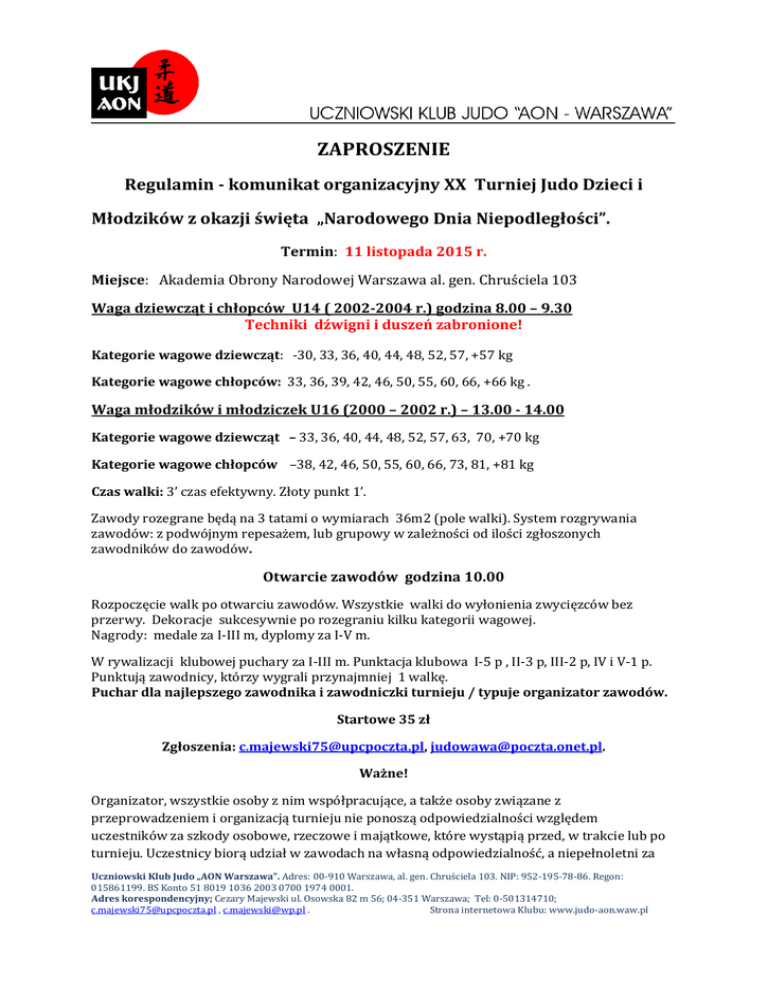 ZAPROSZENIE Regulamin - komunikat organizacyjny XX Turniej Judo Dzieci i Młodzików z okazji święta „Narodowego Dnia Niepodległości”. Termin: 11 listopada 2015 r. Miejsce: Akademia Obrony Narodowej Warszawa al. gen. Chruściela 103 Waga dziewcząt i chłopców U14 ( 2002-2004 r.) godzina 8.00 – 9.30 Techniki dźwigni i duszeń zabronione! Kategorie wagowe dziewcząt: -30, 33, 36, 40, 44, 48, 52, 57, +57 kg Kategorie wagowe chłopców: 33, 36, 39, 42, 46, 50, 55, 60, 66, +66 kg . Waga młodzików i młodziczek U16 (2000 – 2002 r.) – 13.00 - 14.00 Kategorie wagowe dziewcząt – 33, 36, 40, 44, 48, 52, 57, 63, 70, +70 kg Kategorie wagowe chłopców –38, 42, 46, 50, 55, 60, 66, 73, 81, +81 kg Czas walki: 3’ czas efektywny. Złoty punkt 1’. Zawody rozegrane będą na 3 tatami o wymiarach 36m2 (pole walki). System rozgrywania zawodów: z podwójnym repesażem, lub grupowy w zależności od ilości zgłoszonych zawodników do zawodów. Otwarcie zawodów godzina 10.00 Rozpoczęcie walk po otwarciu zawodów. Wszystkie walki do wyłonienia zwycięzców bez przerwy. Dekoracje sukcesywnie po rozegraniu kilku kategorii wagowej. Nagrody: medale za I-III m, dyplomy za I-V m. W rywalizacji klubowej puchary za I-III m. Punktacja klubowa I-5 p , II-3 p, III-2 p, IV i V-1 p. Punktują zawodnicy, którzy wygrali przynajmniej 1 walkę. Puchar dla najlepszego zawodnika i zawodniczki turnieju / typuje organizator zawodów. Startowe 35 zł Zgłoszenia: [email protected], [email protected]. Ważne! Organizator, wszystkie osoby z nim współpracujące, a także osoby związane z przeprowadzeniem i organizacją turnieju nie ponoszą odpowiedzialności względem uczestników za szkody osobowe, rzeczowe i majątkowe, które wystąpią przed, w trakcie lub po turnieju. Uczestnicy biorą udział w zawodach na własną odpowiedzialność, a niepełnoletni za Uczniowski Klub Judo „AON Warszawa”. Adres: 00-910 Warszawa, al. gen. Chruściela 103. NIP: 952-195-78-86. Regon: 015861199. BS Konto 51 8019 1036 2003 0700 1974 0001. Adres korespondencyjny; Cezary Majewski ul. Osowska 82 m 56; 04-351 Warszawa; Tel: 0-501314710; [email protected] , [email protected] . Strona internetowa Klubu: www.judo-aon.waw.pl zgodą rodziców lub prawnych opiekunów. Uczestnicy ponoszą odpowiedzialność cywilną i prawną za wszystkie szkody, jakie poczynią. Każdy z uczestników powinien być ubezpieczony od następstw nieszczęśliwych wypadków. Przez akceptację niniejszej deklaracji uczestnicy zrzekają się prawa dochodzenia prawnego lub zwrotnego od organizatora (lub osób z nim współpracujących) w razie wypadku lub szkody związanej z zawodami. Uczestnik lub zgłaszający go klub przyjmuję do wiadomości, że w razie wypadku nie może wnosić żadnych roszczeń w stosunku do organizatora. Zobowiązuje się przestrzegać zarządzeń służb porządkowych oraz warunków regulaminu. W momencie zgłoszenia do zawodów trenerzy, opiekunowie i zawodnicy zgadzają się z warunkami uczestnictwa. Prawni opiekunowie niepełnoletnich wyrażają zgodę na udostępnienie danych osobowych w zakresie niezbędnym do przeprowadzenia zawodów: nazwisko, imię, rok urodzenia i stopień. Zdjęcia, nagrania filmowe oraz wywiady z uczestnikami, a także wyniki z danymi osobowymi mogą być wykorzystane przez organizatora w środkach przekazu. Uczestnicy w chwili rejestracji do zawodów wyrażają zgodę na przetwarzanie ich danych osobowych przez Urząd m.st. Warszawy w celu realizacji imprezy zgodnie z ustawą z dnia 29 sierpnia 1997 r. o ochronie danych osobowych (Dz. U. z 2014 r. poz. 1182 z późn. zm.). Uczniowski Klub Judo „AON Warszawa”. Adres: 00-910 Warszawa, al. gen. Chruściela 103. NIP: 952-195-78-86. Regon: 015861199. BS Konto 51 8019 1036 2003 0700 1974 0001. Adres korespondencyjny; Cezary Majewski ul. Osowska 82 m 56; 04-351 Warszawa; Tel: 0-501314710; [email protected] , [email protected] . Strona internetowa Klubu: www.judo-aon.waw.pl