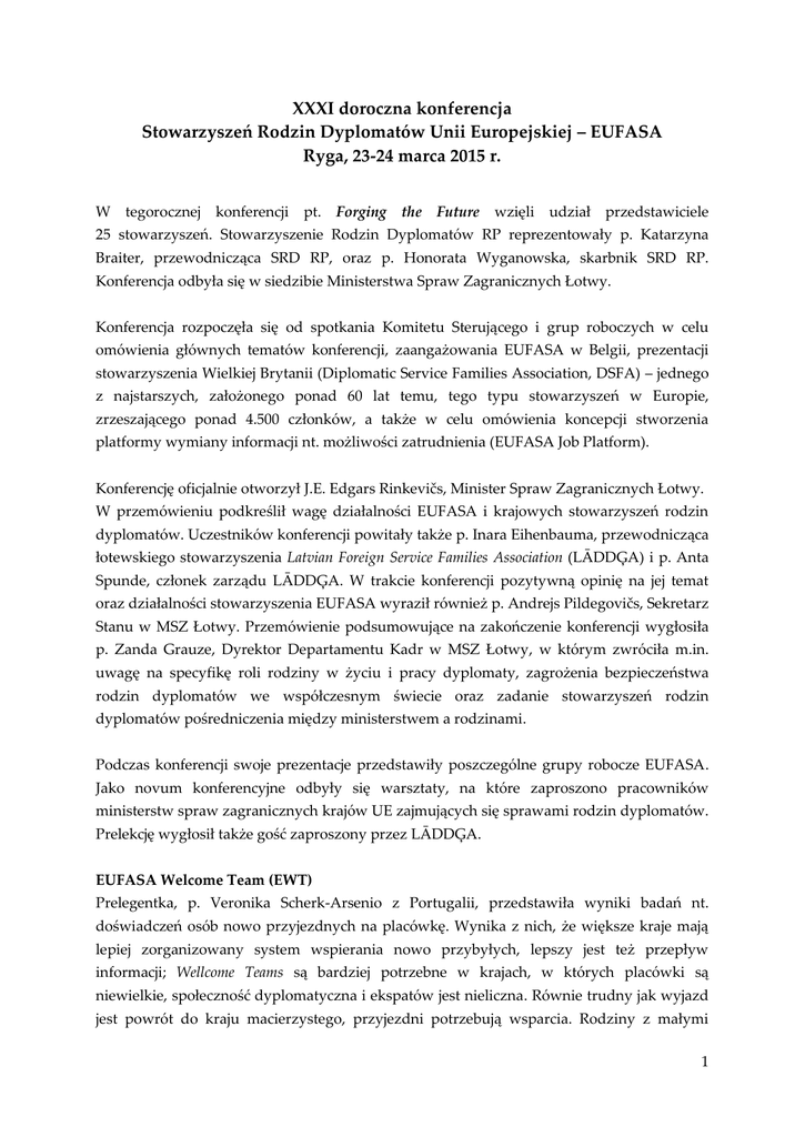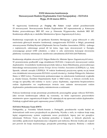 XXXI doroczna konferencja Stowarzyszeń Rodzin Dyplomatów Unii Europejskiej – EUFASA Ryga, 23-24 marca 2015 r. W tegorocznej konferencji pt. Forging the Future wzięli udział przedstawiciele 25 stowarzyszeń. Stowarzyszenie Rodzin Dyplomatów RP reprezentowały p. Katarzyna Braiter, przewodnicząca SRD RP, oraz p. Honorata Wyganowska, skarbnik SRD RP. Konferencja odbyła się w siedzibie Ministerstwa Spraw Zagranicznych Łotwy. Konferencja rozpoczęła się od spotkania Komitetu Sterującego i grup roboczych w celu omówienia głównych tematów konferencji, zaangażowania EUFASA w Belgii, prezentacji stowarzyszenia Wielkiej Brytanii (Diplomatic Service Families Association, DSFA) – jednego z najstarszych, założonego ponad 60 lat temu, tego typu stowarzyszeń w Europie, zrzeszającego ponad 4.500 członków, a także w celu omówienia koncepcji stworzenia platformy wymiany informacji nt. możliwości zatrudnienia (EUFASA Job Platform). Konferencję oficjalnie otworzył J.E. Edgars Rinkevičs, Minister Spraw Zagranicznych Łotwy. W przemówieniu podkreślił wagę działalności EUFASA i krajowych stowarzyszeń rodzin dyplomatów. Uczestników konferencji powitały także p. Inara Eihenbauma, przewodnicząca łotewskiego stowarzyszenia Latvian Foreign Service Families Association (LĀDDĢA) i p. Anta Spunde, członek zarządu LĀDDĢA. W trakcie konferencji pozytywną opinię na jej temat oraz działalności stowarzyszenia EUFASA wyraził również p. Andrejs Pildegovičs, Sekretarz Stanu w MSZ Łotwy. Przemówienie podsumowujące na zakończenie konferencji wygłosiła p. Zanda Grauze, Dyrektor Departamentu Kadr w MSZ Łotwy, w którym zwróciła m.in. uwagę na specyfikę roli rodziny w życiu i pracy dyplomaty, zagrożenia bezpieczeństwa rodzin dyplomatów we współczesnym świecie oraz zadanie stowarzyszeń rodzin dyplomatów pośredniczenia między ministerstwem a rodzinami. Podczas konferencji swoje prezentacje przedstawiły poszczególne grupy robocze EUFASA. Jako novum konferencyjne odbyły się warsztaty, na które zaproszono pracowników ministerstw spraw zagranicznych krajów UE zajmujących się sprawami rodzin dyplomatów. Prelekcję wygłosił także gość zaproszony przez LĀDDĢA. EUFASA Welcome Team (EWT) Prelegentka, p. Veronika Scherk-Arsenio z Portugalii, przedstawiła wyniki badań nt. doświadczeń osób nowo przyjezdnych na placówkę. Wynika z nich, że większe kraje mają lepiej zorganizowany system wspierania nowo przybyłych, lepszy jest też przepływ informacji; Wellcome Teams są bardziej potrzebne w krajach, w których placówki są niewielkie, społeczność dyplomatyczna i ekspatów jest nieliczna. Równie trudny jak wyjazd jest powrót do kraju macierzystego, przyjezdni potrzebują wsparcia. Rodziny z małymi 1 dziećmi często czują się izolowane, podstawową barierą integracji jest znajomość języka, zatrudnienie jest kwestią problematyczną, informacje nt. funkcjonującej społeczności międzynarodowej w danym miejscu, nt. organizacji życia w danym kraju docierają z opóźnieniem. Wśród wniosków podkreślono, że wskazane byłoby, żeby stowarzyszenia miały na każdej palcówce min. jedną osobę zajmującą się sprawami Wellcome Team oraz nawiązania współpracy w tej dziedzinie na interaktywnej platformie on-line. Cenne byłoby, gdyby stowarzyszenia, we współpracy z ministerstwami i ich pracownikami sprawującymi funkcję łączników między ministerstwem a stowarzyszeniem (familly officers, FO) przygotowały tzw. pakiety powitalne dla przyjezdnych, zawierające niezbędne aktualne informacje i kontakty. Podkreślana była także waga zapewnienia możliwości podejmowania pracy na placówkach przez małżonków dyplomatów, a także zapewnienia przez ministerstwa kursów języków obcych dla pracowników i ich małżonków. EUFASA Work and Employment (EWE) W swoich prezentacjach p. Daniela Lauer, p. Daniela Barrier, p. Susan Weiss, p. Margarethe Kögeler poruszyły kwestie związane z zatrudnieniem małżonków dyplomatów, m.in. poparły praktykę organizowania jednoczesnych wyjazdów na tą samą placówkę dla małżeństw, w których obie osoby pracują jako dyplomaci (tzw. double postings), podkreśliły potrzebę stworzenia platformy wymiany informacji nt. możliwości podjęcia pracy (EUFASA Job Platform), przedstawiły przykłady wsparcia w zdobywaniu zatrudnienia małżonków dyplomatów (np. umowa MSZ Francji z dużym przedsiębiorstwem), analizowały zagadnienia dot. systemów ubezpieczeń społecznych dla osób towarzyszących, prezentowały przykłady samozatrudnienia, unaoczniły wagę problemu, jakim we współczesnych realiach jest konieczność porzucania pracy i kariery przez małżonków dyplomatów w związku z ich wyjazdami na placówki i powrotami do kraju. Reprezentująca włoskie stowarzyszenie p. Eleonora Durante Mangoni zaprezentowała pilotażowy projekt pod nazwą Italian Pilot Project for the Diplomatic Families Virtual Community www.postitinitaly.com. W swojej prezentacji przedstawiła uruchomioną stronę internetową www.postitinitaly.com (pierwsza prezentacja projektu strony miała miejsce podczas konferencji w Rzymie w 2014 r.). Celem projektu jest zbudowanie społeczności rodzin dyplomatycznych przebywających we Włoszech. W ramach kontynuacji dyskusji podjętej w trakcie konferencji w 2000 r. w Lizbonie p. Nicki Epinay, przedstawicielka Francji, przedstawiła prezentację Social and Economic Implications of Death, Disability and Divorce, koncentrując się na kwestii kompensacji finansowej i formy pomocy ministerstw w przypadku śmierci spowodowanej wojną, aktami terrorystycznymi, innymi przypadkami przemocy. Wśród wniosków znalazł się postulat dla ministerstw spraw zagranicznych stworzenia odpowiednich, szczególnych w stosunku do powszechnie obowiązujących, regulacji prawnych dot. śmierci dyplomatów podczas pełnienia przez nich obowiązków służbowych na placówkach, z