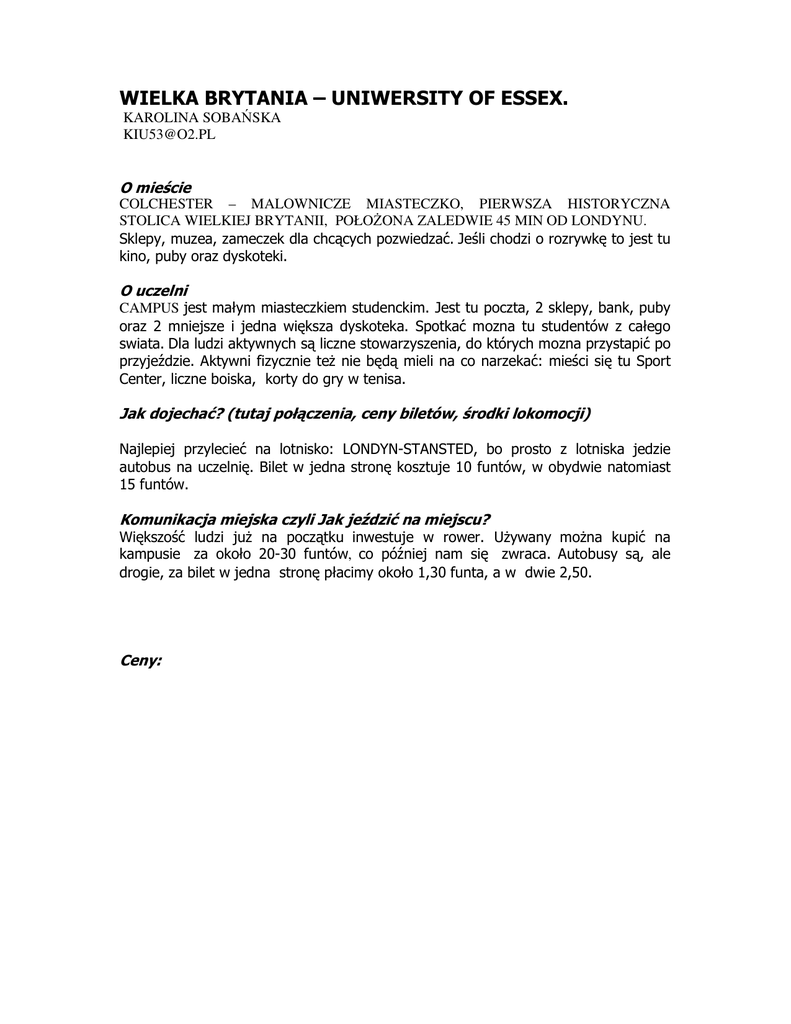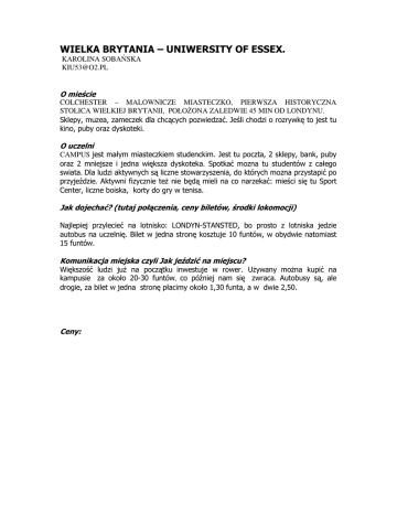 WIELKA BRYTANIA – UNIWERSITY OF ESSEX. KAROLINA SOBAŃSKA [email protected] O mieście COLCHESTER – MALOWNICZE MIASTECZKO, PIERWSZA HISTORYCZNA STOLICA WIELKIEJ BRYTANII, POŁOŻONA ZALEDWIE 45 MIN OD LONDYNU. Sklepy, muzea, zameczek dla chcących pozwiedzać. Jeśli chodzi o rozrywkę to jest tu kino, puby oraz dyskoteki. O uczelni CAMPUS jest małym miasteczkiem studenckim. Jest tu poczta, 2 sklepy, bank, puby oraz 2 mniejsze i jedna większa dyskoteka. Spotkać mozna tu studentów z całego swiata. Dla ludzi aktywnych są liczne stowarzyszenia, do których mozna przystapić po przyjeździe. Aktywni fizycznie też nie będą mieli na co narzekać: mieści się tu Sport Center, liczne boiska, korty do gry w tenisa. Jak dojechać? (tutaj połączenia, ceny biletów, środki lokomocji) Najlepiej przylecieć na lotnisko: LONDYN-STANSTED, bo prosto z lotniska jedzie autobus na uczelnię. Bilet w jedna stronę kosztuje 10 funtów, w obydwie natomiast 15 funtów. Komunikacja miejska czyli Jak jeździć na miejscu? Większość ludzi już na początku inwestuje w rower. Używany można kupić na kampusie za około 20-30 funtów, co później nam się zwraca. Autobusy są, ale drogie, za bilet w jedna stronę płacimy około 1,30 funta, a w dwie 2,50. Ceny: LP. NAZWA PRODUKTU JEDN. CENA 1. Mleko 1L 70 p 2. Sok w kartonie 1L 38 p 3. Olej 1L 1f 4. Makaron 1 kg 48 p 5. Mąka 1 kg 1f 6. Cukier 1 kg 1f 7. Ser żółty 1 kg 2f 8. Serek biały 1,50 f 9. Masło 1f 10. Margaryna 1f 11. Dżem 60 p 12. Ketchup 60 p 13. Ziemniaki 14. Ryż 1,30 p 15. Piwo 1,50 p 16. Cebula 1 kg 1f 17. Pomidory 1 kg 1f 18. Ogórki 1 kg 1f 19. Pomarańcze 1 kg 2f 20. Marchewka 1 kg 89 p 21. Chleb zwykły 1 kg 1,15 f 22. Czekolada 70 p 23. Lody 70 p 24. Jajka 25. Jogurt 26. Szynka 27. Kiełbasa 28. Jabłka 29. Gazeta ogłoszeniowa 50 p 30. Długopis 20 p 31. Znaczek pocztowy Europa 46 p 1 kg 6 szt. 1f 1,13 p 40 p 1 kg 1f 1f 1 kg 1f UWAGI Gdzie warto kupować? Tu z pewnością polecam TESCO, po pierwsze najtaniej, po drugie: najbliżej. Co wziąć ze sobą? Jeśli ktoś posiada – to na pewno przydatny będzie laptop, który znacznie ułatwi życie podczas pisania prac. Mieszkanie (gdzie i za ile, do kogo zwrócić się po przyjeździe po klucze, itp., jaki standard) Polecam akademiki. Uczelnia wysyła katalog, z którego można wybrać ten, który odpowiada naszym wymaganiom. Polecam dla osób poszukujących spokoju: „The houses”. A dla miłośników wiecznych imprez i głośnej muzyki „Towers”. Po przyjeździe należy się zgłosić do Accommodation Office. Opłaty (za prawo pobytu, bankowe, dodatkowe opłaty na uczelni) Brak jakichkolwiek opłat, chyba że za ksero czy drukowanie. Uwagi i spostrzeżenia Polecam wszystkim bardzo gorąco studia zagraniczne, bo nie ma jak ERASMUS/SOCRATES – czekają na Was niezapomniane przygody i nowe znajomości. Wlk. Brytania bywa czasem nudna, ale to tylko od Was zależy, jak wykorzystacie ten czas. POZDRAWIAM!! ☺