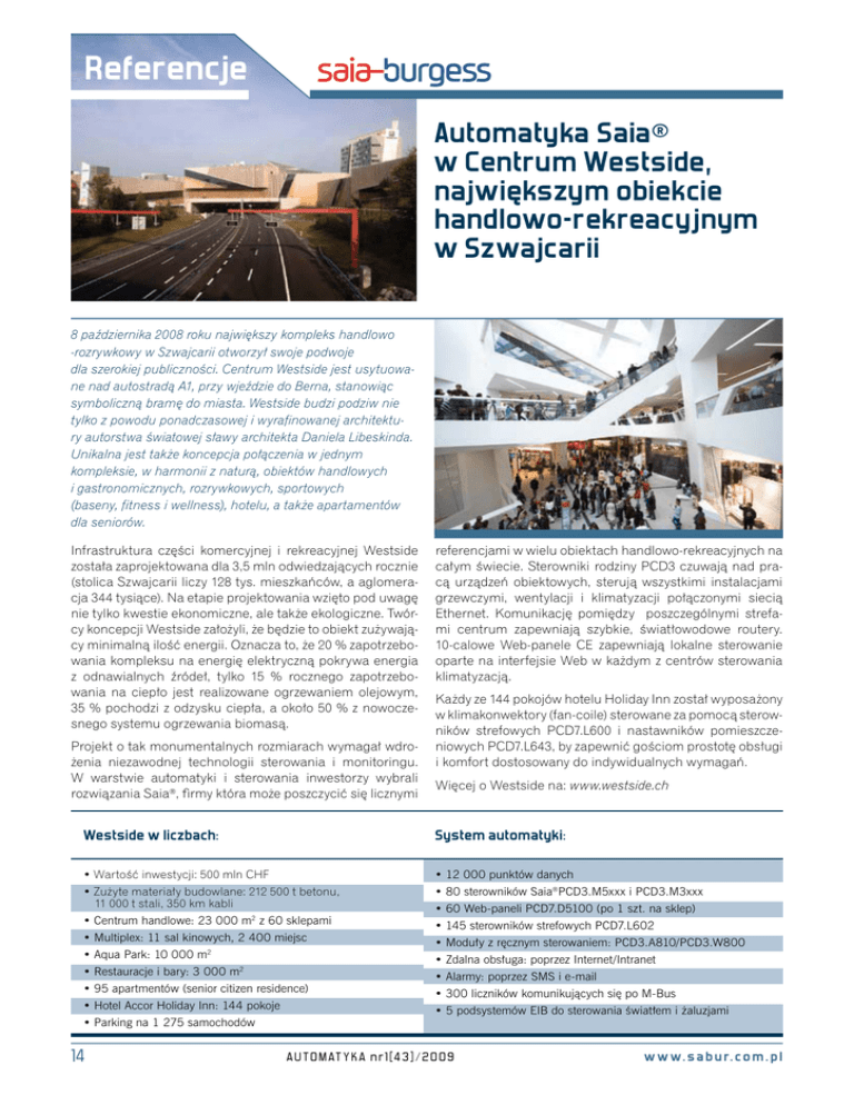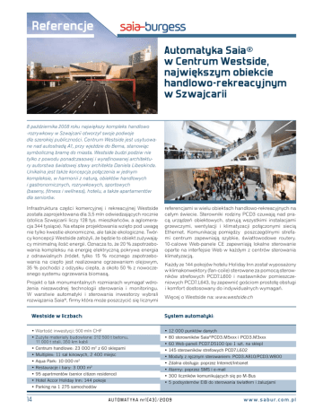 Referencje Automatyka Saia® w Centrum Westside, największym obiekcie handlowo-rekreacyjnym w Szwajcarii 8 października 2008 roku największy kompleks handlowo -rozrywkowy w Szwajcarii otworzył swoje podwoje dla szerokiej publiczności. Centrum Westside jest usytuowane nad autostradą A1, przy wjeździe do Berna, stanowiąc symboliczną bramę do miasta. Westside budzi podziw nie tylko z powodu ponadczasowej i wyrafinowanej architektury autorstwa światowej sławy architekta Daniela Libeskinda. Unikalna jest także koncepcja połączenia w jednym kompleksie, w harmonii z naturą, obiektów handlowych i gastronomicznych, rozrywkowych, sportowych (baseny, fitness i wellness), hotelu, a także apartamentów dla seniorów. Infrastruktura części komercyjnej i rekreacyjnej Westside została zaprojektowana dla 3,5 mln odwiedzających rocznie (stolica Szwajcarii liczy 128 tys. mieszkańców, a aglomeracja 344 tysiące). Na etapie projektowania wzięto pod uwagę nie tylko kwestie ekonomiczne, ale także ekologiczne. Twórcy koncepcji Westside założyli, że będzie to obiekt zużywający minimalną ilość energii. Oznacza to, że 20 % zapotrzebowania kompleksu na energię elektryczną pokrywa energia z odnawialnych źródeł, tylko 15 % rocznego zapotrzebowania na ciepło jest realizowane ogrzewaniem olejowym, 35 % pochodzi z odzysku ciepła, a około 50 % z nowoczesnego systemu ogrzewania biomasą. Projekt o tak monumentalnych rozmiarach wymagał wdrożenia niezawodnej technologii sterowania i monitoringu. W warstwie automatyki i sterowania inwestorzy wybrali rozwiązania Saia®, firmy która może poszczycić się licznymi referencjami w wielu obiektach handlowo-rekreacyjnych na całym świecie. Sterowniki rodziny PCD3 czuwają nad pracą urządzeń obiektowych, sterują wszystkimi instalacjami grzewczymi, wentylacji i klimatyzacji połączonymi siecią Ethernet. Komunikację pomiędzy poszczególnymi strefami centrum zapewniają szybkie, światłowodowe routery. 10-calowe Web-panele CE zapewniają lokalne sterowanie oparte na interfejsie Web w każdym z centrów sterowania klimatyzacją. Każdy ze 144 pokojów hotelu Holiday Inn został wyposażony w klimakonwektory (fan-coile) sterowane za pomocą sterowników strefowych PCD7.L600 i nastawników pomieszczeniowych PCD7.L643, by zapewnić gościom prostotę obsługi i komfort dostosowany do indywidualnych wymagań. Więcej o Westside na: www.westside.ch Westside w liczbach: System automatyki: • Wartość inwestycji: 500 mln CHF • 12 000 punktów danych • Zużyte materiały budowlane: 212 500 t betonu, 11 000 t stali, 350 km kabli • 60 Web-paneli PCD7.D5100 (po 1 szt. na sklep) • Centrum handlowe: 23 000 m2 z 60 sklepami • 145 sterowników strefowych PCD7.L602 • Multiplex: 11 sal kinowych, 2 400 miejsc • Moduły z ręcznym sterowaniem: PCD3.A810/PCD3.W800 • Aqua Park: 10 000 m2 • Zdalna obsługa: poprzez Internet/Intranet • Restauracje i bary: 3 000 m2 • Alarmy: poprzez SMS i e-mail • 95 apartmentów (senior citizen residence) • 300 liczników komunikujących się po M-Bus • Hotel Accor Holiday Inn: 144 pokoje • 5 podsystemów EIB do sterowania światłem i żaluzjami • 80 sterowników Saia®PCD3.M5xxx i PCD3.M3xxx • Parking na 1 275 samochodów 14 A U T O M AT Y K A n r1 [4 3] / 2 0 0 9 w w w.s a b u r. c o m . p l