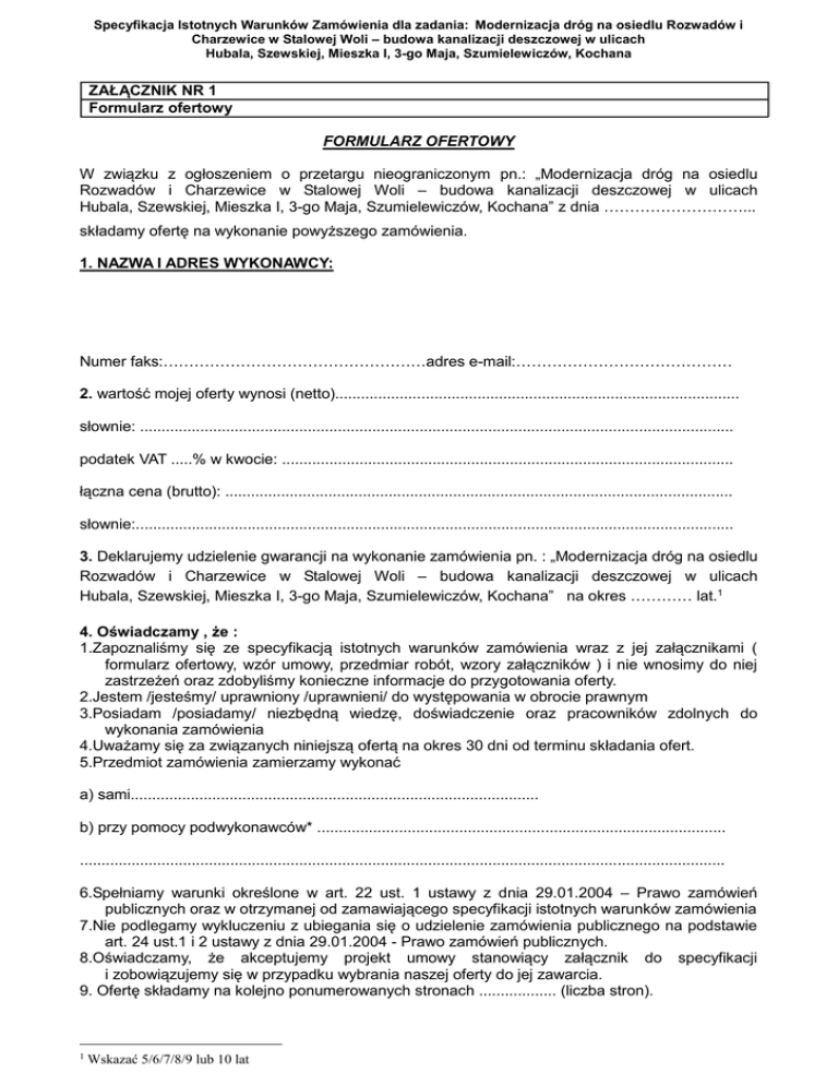 Specyfikacja Istotnych Warunków Zamówienia dla zadania: Modernizacja dróg na osiedlu Rozwadów i Charzewice w Stalowej Woli – budowa kanalizacji deszczowej w ulicach Hubala, Szewskiej, Mieszka I, 3-go Maja, Szumielewiczów, Kochana ZAŁĄCZNIK NR 1 Formularz ofertowy FORMULARZ OFERTOWY W związku z ogłoszeniem o przetargu nieograniczonym pn.: „Modernizacja dróg na osiedlu Rozwadów i Charzewice w Stalowej Woli – budowa kanalizacji deszczowej w ulicach Hubala, Szewskiej, Mieszka I, 3-go Maja, Szumielewiczów, Kochana” z dnia ………………………... składamy ofertę na wykonanie powyższego zamówienia. 1. NAZWA I ADRES WYKONAWCY: Numer faks:……………………………………………adres e-mail:…………………………………… 2. wartość mojej oferty wynosi (netto).............................................................................................. słownie: .......................................................................................................................................... podatek VAT .....% w kwocie: ......................................................................................................... łączna cena (brutto): ...................................................................................................................... słownie:........................................................................................................................................... 3. Deklarujemy udzielenie gwarancji na wykonanie zamówienia pn. : „Modernizacja dróg na osiedlu Rozwadów i Charzewice w Stalowej Woli – budowa kanalizacji deszczowej w ulicach Hubala, Szewskiej, Mieszka I, 3-go Maja, Szumielewiczów, Kochana” na okres ………… lat.1 4. Oświadczamy , że : 1.Zapoznaliśmy się ze specyfikacją istotnych warunków zamówienia wraz z jej załącznikami ( formularz ofertowy, wzór umowy, przedmiar robót, wzory załączników ) i nie wnosimy do niej zastrzeżeń oraz zdobyliśmy konieczne informacje do przygotowania oferty. 2.Jestem /jesteśmy/ uprawniony /uprawnieni/ do występowania w obrocie prawnym 3.Posiadam /posiadamy/ niezbędną wiedzę, doświadczenie oraz pracowników zdolnych do wykonania zamówienia 4.Uważamy się za związanych niniejszą ofertą na okres 30 dni od terminu składania ofert. 5.Przedmiot zamówienia zamierzamy wykonać a) sami............................................................................................... b) przy pomocy podwykonawców* ............................................................................................... ...................................................................................................................................................... 6.Spełniamy warunki określone w art. 22 ust. 1 ustawy z dnia 29.01.2004 – Prawo zamówień publicznych oraz w otrzymanej od zamawiającego specyfikacji istotnych warunków zamówienia 7.Nie podlegamy wykluczeniu z ubiegania się o udzielenie zamówienia publicznego na podstawie art. 24 ust.1 i 2 ustawy z dnia 29.01.2004 - Prawo zamówień publicznych. 8.Oświadczamy, że akceptujemy projekt umowy stanowiący załącznik do specyfikacji i zobowiązujemy się w przypadku wybrania naszej oferty do jej zawarcia. 9. Ofertę składamy na kolejno ponumerowanych stronach .................. (liczba stron). 1 Wskazać 5/6/7/8/9 lub 10 lat Specyfikacja Istotnych Warunków Zamówienia dla zadania: Modernizacja dróg na osiedlu Rozwadów i Charzewice w Stalowej Woli – budowa kanalizacji deszczowej w ulicach Hubala, Szewskiej, Mieszka I, 3-go Maja, Szumielewiczów, Kochana 5. Załącznikami do niniejszego formularza, stanowiącymi integralną część oferty są: a) .................................................................... b) .................................................................... c) .................................................................... d) .................................................................... e) .................................................................... f) ..................................................................... g) .................................................................... h) .................................................................... i) ..................................................................... j) ..................................................................... k) .................................................................... l) ..................................................................... ................................................... (własnoręczny podpis osoby upoważnionej do reprezentowania Wykonawcy) * należy określić zakres robót planowanych do realizacji przez podwykonawców Specyfikacja Istotnych Warunków Zamówienia dla zadania: Modernizacja dróg na osiedlu Rozwadów i Charzewice w Stalowej Woli – budowa kanalizacji deszczowej w ulicach Hubala, Szewskiej, Mieszka I, 3-go Maja, Szumielewiczów, Kochana ZAŁĄCZNIK NR 2 Oświadczenie o spełnianiu warunków udziału w postępowaniu ................................ (pieczęć Wykonawcy) OŚWIADCZENIE O SPEŁNIANIU WARUNKÓW UDZIAŁU W POSTĘPOWANIU Przystępując do przetargu nieograniczonego pod nazwą „Modernizacja dróg na osiedlu Rozwadów i Charzewice w Stalowej Woli – budowa kanalizacji deszczowej w ulicach Hubala, Szewskiej, Mieszka I, 3-go Maja, Szumielewiczów, Kochana”, z dnia ……………………………….. ja niżej podpisany, reprezentujący przedsiębiorstwo, którego nazwa jest wskazana w nagłówku, jako upoważniony na piśmie lub wpisany w odpowiednich dokumentach rejestrowych, w imieniu reprezentowanego przedsiębiorstwa oświadczam, że spełniam/y warunki ubiegania się o zamówienie, zgodnie z art. 22 ust 1 ustawy z dnia 29 stycznia 2004 r. – Prawo zamówień publicznych (t.j. Dz. U. z 2015 r., poz. 2164 ) dotyczące: Art. 22. 1) posiadania upraw