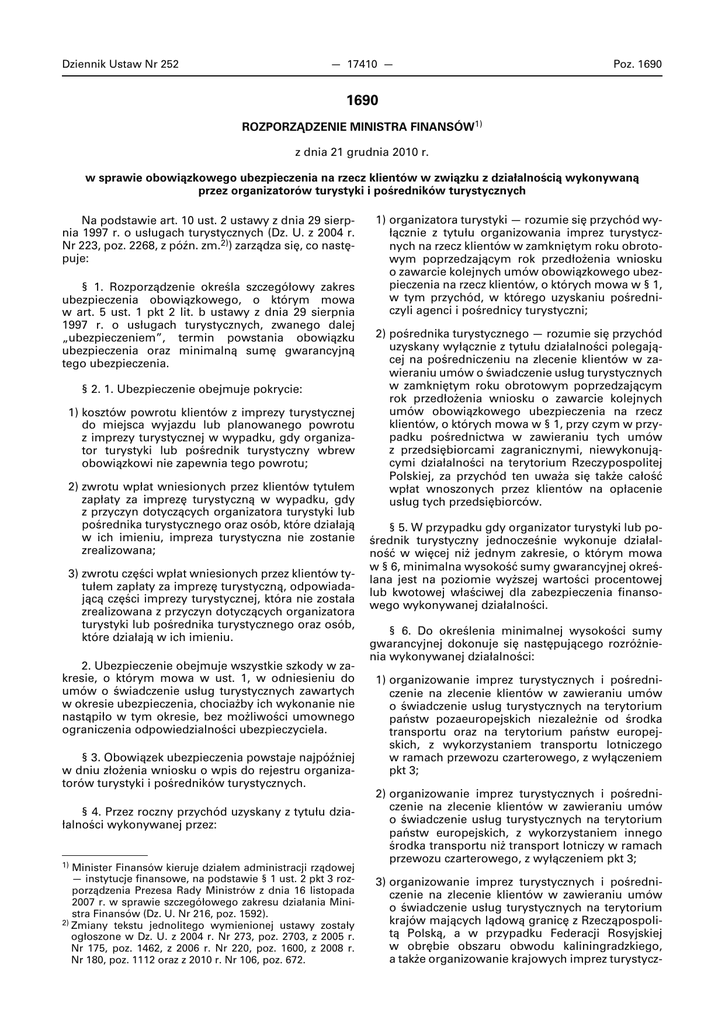 Dziennik Ustaw Nr 252 — 17410 — Poz. 1690 1690 ROZPORZĄDZENIE MINISTRA FINANSÓW1) z dnia 21 grudnia 2010 r. w sprawie obowiązkowego ubezpieczenia na rzecz klientów w związku z działalnością wykonywaną przez organizatorów turystyki i pośredników turystycznych Na podstawie art. 10 ust. 2 ustawy z dnia 29 sierpnia 1997 r. o usługach turystycznych (Dz. U. z 2004 r. Nr 223, poz. 2268, z późn. zm.2)) zarządza się, co następuje: § 1. Rozporządzenie określa szczegółowy zakres ubezpieczenia obowiązkowego, o którym mowa w art. 5 ust. 1 pkt 2 lit. b ustawy z dnia 29 sierpnia 1997 r. o usługach turystycznych, zwanego dalej „ubezpieczeniem”, termin powstania obowiązku ubezpieczenia oraz minimalną sumę gwarancyjną tego ubezpieczenia. § 2. 1. Ubezpieczenie obejmuje pokrycie: 1) kosztów powrotu klientów z imprezy turystycznej do miejsca wyjazdu lub planowanego powrotu z imprezy turystycznej w wypadku, gdy organizator turystyki lub pośrednik turystyczny wbrew obowiązkowi nie zapewnia tego powrotu; 2) zwrotu wpłat wniesionych przez klientów tytułem zapłaty za imprezę turystyczną w wypadku, gdy z przyczyn dotyczących organizatora turystyki lub pośrednika turystycznego oraz osób, które działają w ich imieniu, impreza turystyczna nie zostanie zrealizowana; 3) zwrotu części wpłat wniesionych przez klientów tytułem zapłaty za imprezę turystyczną, odpowiadającą części imprezy turystycznej, która nie została zrealizowana z przyczyn dotyczących organizatora turystyki lub pośrednika turystycznego oraz osób, które działają w ich imieniu. 2. Ubezpieczenie obejmuje wszystkie szkody w zakresie, o którym mowa w ust. 1, w odniesieniu do umów o świadczenie usług turystycznych zawartych w okresie ubezpieczenia, chociażby ich wykonanie nie nastąpiło w tym okresie, bez możliwości umownego ograniczenia odpowiedzialności ubezpieczyciela. § 3. Obowiązek ubezpieczenia powstaje najpóźniej w dniu złożenia wniosku o wpis do rejestru organizatorów turystyki i pośredników turystycznych. § 4. Przez roczny przychód uzyskany z tytułu działalności wykonywanej przez: 1) Minister Finansów kieruje działem administracji rządowej — instytucje finansowe, na podstawie § 1 ust. 2 pkt 3 rozporządzenia Prezesa Rady Ministrów z dnia 16 listopada 2007 r. w sprawie szczegółowego zakresu działania Ministra Finansów (Dz. U. Nr 216, poz. 1592). 2) Zmiany tekstu jednolitego wymienionej ustawy zostały ogłoszone w Dz. U. z 2004 r. Nr 273, poz. 2703, z 2005 r. Nr 175, poz. 1462, z 2006 r. Nr 220, poz. 1600, z 2008 r. Nr 180, poz. 1112 oraz z 2010 r. Nr 106, poz. 672. 1) organizatora turystyki — rozumie się przychód wyłącznie z tytułu organizowania imprez turystycznych na rzecz klientów w zamkniętym roku obrotowym poprzedzającym rok przedłożenia wniosku o zawarcie kolejnych umów obowiązkowego ubezpieczenia na rzecz klientów, o których mowa w § 1, w tym przychód, w którego uzyskaniu pośredniczyli agenci i pośrednicy turystyczni; 2) pośrednika turystycznego — rozumie się przychód uzyskany wyłącznie z tytułu działalności polegającej na pośredniczeniu na zlecenie klientów w zawieraniu umów o świadczenie usług turystycznych w zamkniętym roku obrotowym poprzedzającym rok przedłożenia wniosku o zawarcie kolejnych umów obowiązkowego ubezpieczenia na rzecz klientów, o których mowa w § 1, przy czym w przypadku pośrednictwa w zawieraniu tych umów z przedsiębiorcami zagranicznymi, niewykonującymi działalności na terytorium Rzeczypospolitej Polskiej, za przychód ten uważa się także całość wpłat wnoszonych przez klientów na opłacenie usług tych przedsiębiorców. § 5. W przypadku gdy organizator turystyki lub pośrednik turystyczny jednocześnie wykonuje działalność w więcej niż jednym zakresie, o którym mowa w § 6, minimalna wysokość sumy gwarancyjnej określana jest na poziomie wyższej wartości procentowej lub kwotowej właściwej dla zabezpieczenia finansowego wykonywanej działalności. § 6. Do określenia minimalnej wysokości sumy gwarancyjnej dokonuje się następującego rozróżnienia wykonywanej działalności: 1) organizowanie imprez turystycznych i pośredniczenie na zlecenie klientów w zawieraniu umów o świadczenie usług turystycznych na terytorium państw pozaeuropejskich niezależnie od środka transportu oraz na terytorium państw europejskich, z wykorzystaniem transportu lotniczego w ramach przewozu czarterowego, z wyłączeniem pkt 3; 2) organizowanie imprez turystycznych i pośredniczenie na zlecenie klientów w zawieraniu umów o świadczenie usług turystycznych na terytorium państw europejskich, z wykorzystaniem innego środka transportu niż transport lotniczy w ramach przewozu czarterowego, z wyłączeniem pkt 3; 3) organizowanie imprez turystycznych i pośredniczenie na zlecenie klientów w zawieraniu umów o świadczenie usług turystycznych na terytorium krajów mających lądową granicę z Rzecząpospolitą Polską, a w przypadku Federacji Rosyjskiej w obrębie obszaru obwodu kaliningradzkiego, a także organizowanie krajowych imprez turystycz- Dziennik Ustaw Nr 252 — 17411 — nych i pośredniczenie na zlecenie klientów w zawieraniu umów o świadczenie krajowych usług turystycznych, w tym imprez zagranicznej turystyki przyjazdowej. § 7. 1. Minimalna wysokość sumy gwarancyjnej ustalana w odniesieniu do podmiotów wykonujących działalność, o której mowa w § 6, niepobierających przedpłat, pobierających przedpłaty w terminie do 30 dni przed dniem rozpoczęcia imprezy turystycznej lub świadczenia usług turystycznych lub pobierających przedpłaty w wysokości do 10 % ceny imprezy turystycznej lub usług turystycznych, wynosi: 1) 12 % rocznych przychodów z tytułu wykonywanej działalności, o której mowa w § 6 pkt 1, nie mniej jednak niż równowartość 40 000 euro; 2) 7 % rocznych przychodów z tytułu wykonywanej działalności, o
