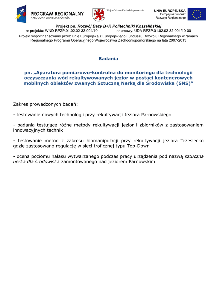 Województwo Zachodniopomorskie UNIA EUROPEJSKA Europejski Fundusz Rozwoju Regionalnego Projekt pn. Rozwój Bazy B+R Politechniki Koszalińskiej nr projektu: WND-RPZP.01.02.02-32-004/10 nr umowy: UDA-RPZP.01.02.02-32-004/10-00 Projekt współfinansowany przez Unię Europejską z Europejskiego Funduszu Rozwoju Regionalnego w ramach Regionalnego Programu Operacyjnego Województwa Zachodniopomorskiego na lata 2007-2013 Badania pn. „Aparatura pomiarowo-kontrolna do monitoringu dla technologii oczyszczania wód rekultywowanych jezior w postaci kontenerowych mobilnych obiektów zwanych Sztuczną Nerką dla Środowiska (SNS)” Zakres prowadzonych badań: - testowanie nowych technologii przy rekultywacji Jeziora Parnowskiego - badania testujące różne metody rekultywacji jezior i zbiorników z zastosowaniem innowacyjnych technik - testowanie metod z zakresu biomanipulacji przy rekultywacji jeziora Trzesiecko gdzie zastosowano regulację w sieci troficznej typu Top-Down - ocena poziomu hałasu wytwarzanego podczas pracy urządzenia pod nazwą sztuczna nerka dla środowiska zamontowanego nad jeziorem Parnowskim