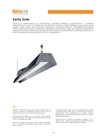 Seria Sole Oprawy są przeznaczone do całościowego oświetlenia obiektów przemysłowych o wysokości zawieszenia od 6 do 24 m. W zależności od wysokości montażu w ofercie dostępne są trzy opcje rozsyłu światła - średni, wąski i skoncentrowany. Wykonana z aluminium obudowa i poliwęglanowa pokrywa źródeł światła są odporne na uderzenia i uszkodzenia mechaniczne. Tego typu wykonanie pozwala na zastosowanie SOLE w miejscach o wysokiej wibracji i trudnych warunkach pracy, salach gimnastycznych, halach handlowych, przy produkcji żywności, w magazynach. Opis Ultralekka konstrukcja oprawy (5 kg dla Sole - 200) pozwala na montaż w miejscach o ograniczonej stabilności sufitu oraz nie obciąża konstrukcji dachu w miejscach jej zastosowania. W przypadku awarii diody LED, klucz zabezpieczający blokuje uszkodzone źródło światła, przez co pozostałe diody pracują w standardowym trybie. Umiejscowiony na zewnątrz obudowy zasilacz jest łatwy w wymianie, którą można wykonać na miejscu, bez demontażu oprawy. Duża powierzchnia korpusu (1.1 m2 dla Sole - 200) skutecznie odprowadza ciepło, stąd zwiększony zakres temperatury roboczej do 50°C oraz okresowo do 60°С. Oprawa Sole ma możliwość ściemniania w systemie1...10V w zakresie od 10... 100%, oraz współpracuje z systemem sterowania DALI po podłączeniu do odpowiedniego konwertera. Zastosowane diody LED pracują na 50% swojej maksymalnej mocy, co zwiększa niezawodność źródeł światła i żywotność oprawy do 30%. 33 Seria Sole - wytrzymałe oprawy przemysłowe, które nie wymagają obsługi w całym okresie eksploatacji. Umieszczony na zewnątrz zasilacz jest łatwy w wymianie, którą można wykonać bez demontażu oprawy. Parametry świetlne Oprawa Sole Źródło światła SSL 80 Osram Rozsył światła 86°, 57°, 30° Skuteczność świetlna 105 lm/W Temperatura barwowa 4000 / 5000 K Współczynnik oddawania barw Ra > 72...90 Parametry elektryczne Napięcie wejściowe 90...305 VAC Częstotliwość 47...63 Hz Współczynnik mocy 0,94 Sprawność zasilacza 94 % Sterowanie 1...10V Zakres sterowania 10...100 % Parametry eksploatacyjne Zakres temperatury pracy -25...+50°C Stopień ochrony IP65 Odporność na uderzenia IK08 Żywotność (ta=30°C) 50 000 godz. Gwarancja 5 lat Parametry konstrukcyjne Obudowa aluminiowa Plafon poliwęglan Kolor szary Specyfikacje Model Moc (W) Strumień św. (lm) Długość (mm) Waga (kg) Sole-140 135 14 200 800 3,8 Sole-200 202 21 200 1200 4,6 Sole-270 270 28 300 1580 6,5 * - Dane podano dla opraw o temperaturze barwowej 5000K, Ra>72 i temperaturze otoczenia 25°C. 34 Charakterystyki fotometryczne 90 90 80 80 70 70 60 60 50 50 40 40 30 20 10 0 10 20 30 Oprawa serii Sole -XXX-S dedykowana jest do montażu na wysokości 4-9m jako oświetlenie otwartych powierzchni. Akcesoria Zestaw wsporników do montażu oprawy bezpośrednio do stropu. Zestaw uchwytów do montażu na linkach stalowych lub łańcuszkach. Zestaw obrotowych uchwytów do montażu oprawy pod kątem. Zestaw do podłączenia oprawy z możliwością kontroli zasilania i oświetlenia. Zestaw do podłączenia oprawy z możliwością kontroli zasilania i oświetlenia. Urządzenia do sterowania oświetleniem z czujnikami ruchu i oświetlenia. Serwis Płytki LED produkcji NowaLed oraz zasilacz Mean Well zastosowane w oprawach z serii Sole są wymienne bez użycia specjalistycznych narzędzi. 35 Rysunki techniczne 36