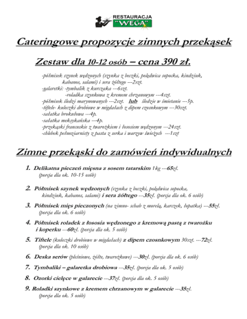Cateringowe propozycje zimnych przekąsek Zestaw dla 10-12 osób – cena 390 zł. -półmisek szynek wędzonych (szynka z beczki, polędwica sopocka, kindziuk, kabanos, salami) i sera żółtego ---2szt. -galaretki: -tymbalik z kurczaka ---6szt. -roladka szynkowa z kremem chrzanowym ---4szt. -półmisek śledzi marynowanych ---2szt. lub śledzie w śmietanie ---5p. -tiftele- kuleczki drobiowe w migdałach z dipem czosnkowym ---30szt. -sałatka brokułowa ---4p. -sałatka meksykańska ---4p. -przekąski francuskie z twarożkiem i łososiem wędzonym ---24szt. -chlebek pełnoziarnisty z pasta z serka i warzyw świeżych ---1szt Zimne przekąski do zamówień indywidualnych 1. Delikatna pieczeń mięsna z sosem tatarskim 1kg ---65zł. (porcja dla ok. 10-15 osób) 2. Półmisek szynek wędzonych (szynka z beczki, polędwica sopocka, kindziuk, kabanos, salami) i sera żółtego ---35zł. (porcja dla ok. 6 osób) 3. Półmisek mięs pieczonych (na zimno- schab z morelą, karczek, łopatka) ---55zł. (porcja dla ok. 6 osób) 4. Półmisek roladek z łososia wędzonego z kremową pastą z twarożku i koperku ---60zł. (porcja dla ok. 5 osób) 5. Tiftele (kuleczki drobiowe w migdałach) z dipem czosnkowym 30szt. ---72zł. (porcja dla ok. 10 osób) 6. Deska serów (pleśniowe, żółte, twarożkowe) ---30zł. (porcja dla ok. 6 osób) 7. Tymbaliki – galaretka drobiowa ---35zł. (porcja dla ok. 5 osób) 8. Ozorki cielęce w galarecie ---37zł. (porcja dla ok. 5 osób) 9. Roladki szynkowe z kremem chrzanowym w galarecie ---35zł. (porcja dla ok. 5 osób) 10. Sałatka włoska (makaron ryżowy, szynka, ogórek i papryka konserwowe, groszek, majonez) 1kg ---38zł. (porcja dla ok. 10 osób) 11. Sałatka meksykańska (czerwona fasola, groszek, kukurydza, ogórek i papryka konserwowe, szynka, majonez) 1kg ---38zł. (porcja dla ok. 10 osób) 12. Sałatka grecka (sałata lodowa, ser feta, pomidor, ogórek, papryka, cebula czerwona, sos winegret) 0,7kg ---36zł. (porcja dla ok. 10 osób) 13. Sałatka brokułowa (brokuł, jajko gotowane, ogórek, pomidor, sos śmietanowo- czosnkowy) 1kg ---38zł. (porcja dla ok. 10 osób) 14. Ryba po grecku - półmisek ---30zł. (porcja dla ok. 6 osób) 15. Chlebek pełnoziarnisty własnego wypieku z pastą z serka topionego i warzyw ---22zł. (porcja dla ok. 10 osób) 16. Kanapki bankietowe (z szynką, salami, pastą twarożkową, łososiem, śledzikiem) 30szt. ---90zł. (porcja dla ok. 5-10 osób) Słodkie propozycje 1. Tort advocatowy z gruszkami na orzechowym spodzie 1szt. ---155zł. (porcja dla ok. 20-24 osób) Tiramisu 1szt. ---80 zł. (porcja dla ok. 10 osób) 2. 3. Babeczki z bitą śmietaną 20szt. ---55zł. (porcja dla ok. 10 osób) Poza przedstawionymi potrawami dysponujemy również pełną paletą dań w karcie menu naszej restauracji. Gorąco Państwa zapraszamy do restauracji WEGA, gdzie gościmy wszystkich najlepiej jak potrafimy. Restauracja WEGA Orzesze- Gardawice, ul. Katowicka 5 tel. 32 22 14 048 www.restauracja-wega.pl