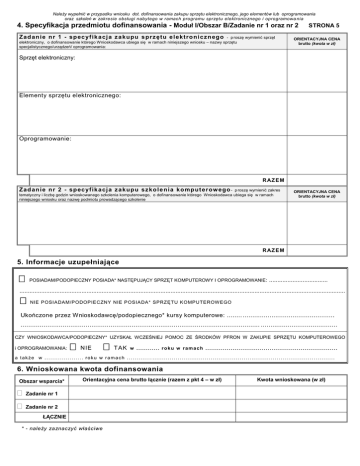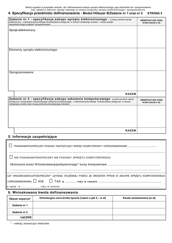 Należy wypełnić w przypadku wniosku dot. dofinansowania zakupu sprzętu elektronicznego, jego elementów lub oprogramowania oraz szkoleń w zakresie obsługi nabytego w ramach programu sprzętu elektronicznego i oprogramowa nia 4. Specyfikacja przedmiotu dofinansowania - Moduł I/Obszar B/Zadanie nr 1 oraz nr 2 Zad an ie n r 1 - sp ec yf ik a cj a z a kupu s prz ęt u e l ekt ro ni cz n ego - p roszę wymienić sprzęt elektroniczny, o dofinansowanie którego Wnioskodawca ubiega się w ramach niniejszego wniosku – nazwy sprzętu specjalistycznego/urządzeń/ oprogramowania: STRONA 5 ORIENTACYJNA CENA brutto (kwota w zł) Sprzęt elektroniczny: Elementy sprzętu elektronicznego: Oprogramowanie: R AZ E M Zad an ie n r 2 - sp ec yf ik a cj a z a kupu sz ko l e nia kom put er ow ego - p roszę wymienić zakres tematyczny i liczbę godzin wnioskowanego szkolenia komputerowego, o dofinansowanie którego Wnioskodawca ubiega się w ramach niniejszego wniosku oraz nazwę podmiotu prowadzącego szkolenie ORIENTACYJNA CENA brutto (kwota w zł) R AZ E M 5. Informacje uzupełniające POSIADAM/PODOPIECZNY POSIADA* NASTĘPUJĄCY SPRZĘT KOMPUTEROWY I OPROGRAMOWANIE : ................................... .................................................................................................................................................................................................. NIE POSIADAM/PODOPIECZNY NIE POSIADA* SPRZĘTU KOMPUTEROW EGO Ukończone przez Wnioskodawcę/podopiecznego* kursy komputerowe: ........ ................................................ ............................................................................................................................. ........................................ CZY WNIOSKODAWCA/PODOPIECZNY* UZYSKAŁ WCZEŚNIEJ POMOC ZE ŚRODKÓW PFRON W ZAKUPIE SPRZĘTU KOMPUTEROWEGO i OPROGRAMOWANIA: NIE T AK w . . . . . . . . . . . . r o k u w r a m a c h . . . . . . . . . . . . . . . . . . . . . . . . . . . . . . . . . . . . . . . . . . . . . . . . . . . . . . . . . . . . . . . . . . . . a także w .................... roku w ramach ............. .............................................................................................. 6. Wnioskowana kwota dofinansowania Obszar wsparcia* Zadanie nr 1 Zadanie nr 2 Orientacyjna cena brutto łącznie (razem z pkt 4 – w zł) ŁĄCZNIE * - należy zaznaczyć właściwe Kwota wnioskowana (w zł) Oświadczam, że: ST RO N A 6 1. o wnioskowane w ramach niniejszego wniosku dofinansowanie ze środków PFRON, ubiegam się wyłącznie za pośrednictwem samorządu powiatu gorlickiego tak - nie, 2. informacje podane we wniosku i załącznikach są zgodne z prawdą oraz przyjmuję do wiadomości, że podanie przez Wnioskodawcę informacji niezgodnych z prawdą, eliminuje wniosek z dalszego rozpatrywania, 3. zobowiązuję się zgłosić bezzwłocznie realizatorowi programu informacje o wszelkich zmianach dot. danych zawartych we wniosku, 4. zapoznałam(em) się z zasadami udzielania pomocy w ramach pilotażowego programu „Aktywny samorząd”, które przyjmuję do wiadomości i stosowania oraz przyjęłam(em) do wiadomości, że tekst programu jest dostępny pod adresem: www.pfron.org.pl, a także: www.pcpr.gorlice.pl 5. w okresie ostatnich 3 lat uzyskałam(em) pomoc ze środków PFRON (w tym za pośrednictwem powiatu) na zakup sprzętu elektronicznego, jego elementów lub oprogramowania: tak - nie, 6. posiadam środki finansowe na pokrycie udziału własnego w zakupie wnioskowanego sprzętu elektronicznego i/lub jego elementów i/lub oprogramowania (w zależności od wysokości przyznanej pomocy finansowej – co najmniej 10% ceny brutto sprzętu elektronicznego i/lub jego elementów i/lub oprogramowania), 7. przyjmuję do wiadomości i stosowania, iż złożenie niniejszego wniosku o dofinansowanie nie gwarantuje uzyskania pomocy w ramach realizacji programu oraz, że warunkiem zawarcia umowy dofinansowania jest spełnianie warunków uczestnictwa określonych w programie także w dniu podpisania umowy, 8. przyjmuję do wiadomości i stosowania, że ewentualne wyjaśnienia, uzupełnienia zapisów lub brakujących załączników do wniosku należy dostarczyć niezwłocznie, w terminie wyznaczonym przez Realizatora programu oraz, że prawidłowo zaadresowana korespondencja, która pomimo dwukrotnego awizowania nie zostanie odebrana, uznawana będzie za doręczoną, 9. w ciągu ostatnich 3 lat byłem(am) stroną umowy dofinansowania ze środków PFRON i rozwiązanej z przyczyn leżących po mojej stronie: tak - nie, 10. przyjmuję do wiadomości i stosowania, iż w przypadku przyznanego dofinansowania, przelanie środków finansowych PFRON następuje na rachunek sprzedawcy przedmiotu zakupu, na podstawie przedstawionej i podpisanej przez Wnioskodawcę faktury VAT. Wnioskodawca nie mogący pisać, lecz mogący czytać, zamiast podpisu może uczynić na dokumencie tuszowy odcisk palca, a obok tego odcisku inna osoba wypisze jej imię i nazwisko umieszczając swój podpis; zamiast Wnioskodawcy może także podpisać się inna osoba, z tym że jej podpis musi być poświadczony przez notariusza lub wójta (burmistrza, prezydenta miasta), starostę lub marszałka województwa z zaznaczeniem, że podpis został złożony na życzenie nie mogącego pisać, lecz mogącego czytać. ................................. dnia ....../ ....../ 20... r. .................................... podpis Wnioskodawcy 7. Załączniki wymagane do wniosku oraz dodatkowe (wiersze 9-10) WYPEŁNIA WYŁĄCZNIE REALIZATOR (należy zaznaczyć właściwe) Nazwa załącznika Dołączono do wniosku Uzupełniono 1. Kserokopia aktualnego orzeczenia o znacznym stopniu niepełnosprawności lub orzeczenia równoważnego albo orzeczenia o niepełnosprawności podopiecznego (osoby do 16 roku życia) 2. Oświadczenie o wysokości przeciętnego miesięcznego dochodu w przeliczeniu na jednego członka rodziny pozostającego we wspólnym gos