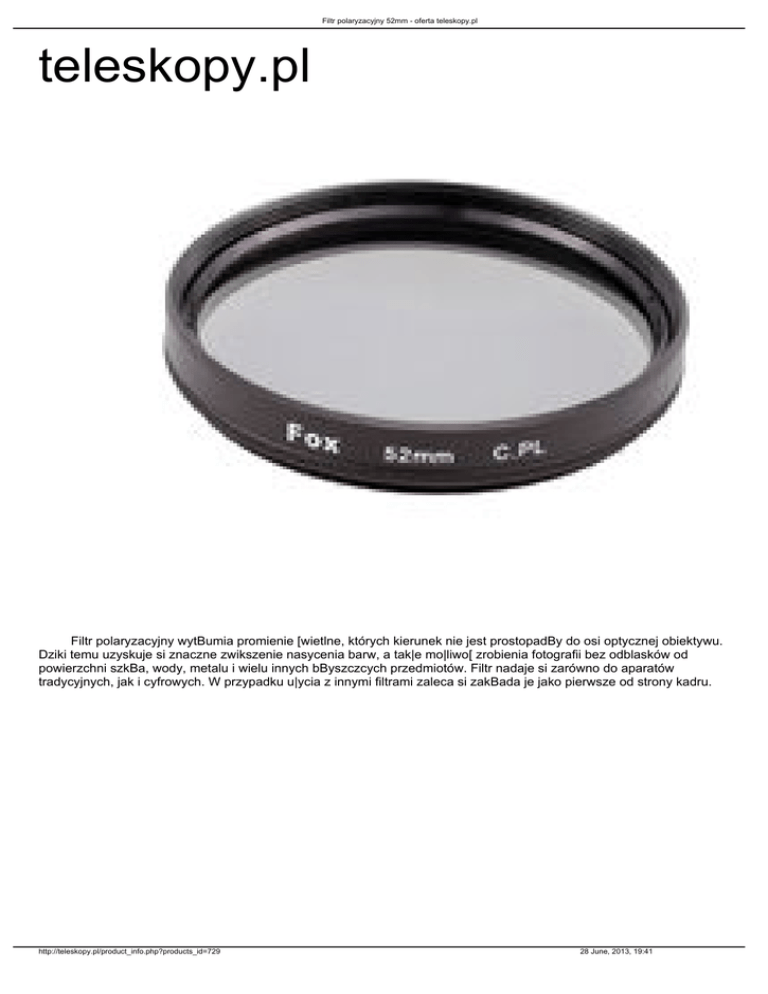 Filtr polaryzacyjny 52mm - oferta teleskopy.pl teleskopy.pl Filtr polaryzacyjny wytBumia promienie [wietlne, których kierunek nie jest prostopadBy do osi optycznej obiektywu. Dziki temu uzyskuje si znaczne zwikszenie nasycenia barw, a tak|e mo|liwo[ zrobienia fotografii bez odblasków od powierzchni szkBa, wody, metalu i wielu innych bByszczcych przedmiotów. Filtr nadaje si zarówno do aparatów tradycyjnych, jak i cyfrowych. W przypadku u|ycia z innymi filtrami zaleca si zakBada je jako pierwsze od strony kadru. http://teleskopy.pl/product_info.php?products_id=729 28 June, 2013, 19:41