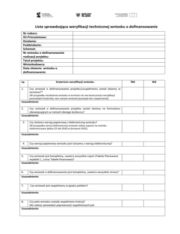 Lista sprawdzająca weryfikacji technicznej wniosku o