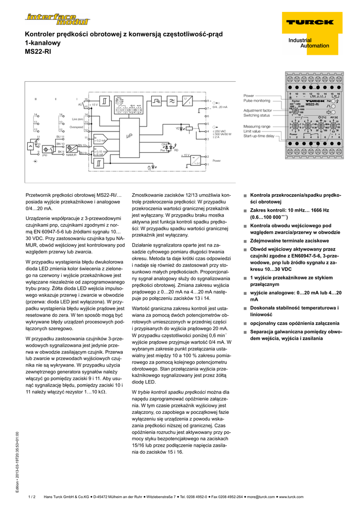 Kontroler prędkości obrotowej z konwersją częstotliwość-prąd 1-kanałowy MS22-RI Przetwornik prędkości obrotowej MS22-Ri/… posiada wyjście przekaźnikowe i analogowe 0/4…20 mA. Urządzenie współpracuje z 3-przewodowymi czujnikami pnp, czujnikami zgodnymi z normą EN 60947-5-6 lub źródłami sygnału 10… 30 VDC. Przy zastosowaniu czujnika typu NAMUR, obwód wejściowy jest kontrolowany pod względem przerwy lub zwarcia. W przypadku wystąpienia błędu dwukolorowa dioda LED zmienia kolor świecenia z zielonego na czerwony i wyjście przekaźnikowe jest wyłączane niezależnie od zaprogramowanego trybu pracy. Żółta dioda LED wejścia impulsowego wskazuje przerwę i zwarcie w obwodzie (przerwa: dioda LED jest wyłączona). W przypadku wystąpienia błędu wyjście prądowe jest resetowane do zera. W ten sposób mogą być wykrywane błędy urządzeń procesowych podłączonych szeregowo. Zmostkowanie zacisków 12/13 umożliwia kontrolę przekroczenia prędkości: W przypadku przekroczenia wartości granicznej przekaźnik jest wyłączany. W przypadku braku mostka aktywna jest funkcja kontroli spadku prędkości: W przypadku spadku wartości granicznej przekaźnik jest wyłączany. Działanie sygnalizatora oparte jest na zasadzie cyfrowego pomiaru długości trwania okresu. Metoda ta daje krótki czas odpowiedzi i nadaje się również do zastosowań przy stosunkowo małych prędkościach. Proporcjonalny sygnał analogowy służy do sygnalizowania prędkości obrotowej. Zmiana zakresu wyjścia prądowego z 0…20 mA na 4…20 mA następuje po połączeniu zacisków 13 i 14. Wartość graniczna zakresu kontroli jest ustawiana za pomocą dwóch potencjometrów obrotowych umieszczonych w przedniej części i przypisanych do wyjścia prądowego 20 mA. W przypadku częstotliwości poniżej 0,6 min wyjście prądowe przyjmuje wartość 0/4 mA. W wybranym zakresie punkt przełączania ustawialny jest między 10 a 100 % zakresu pomiarowego za pomocą kolejnego potencjometru obrotowego. Stan przełączania wyjścia przekaźnikowego sygnalizowany jest przez żółtą diodę LED. -1 Edition • 2013-03-19T20:35:53+01:00 W przypadku zastosowania czujników 3-przewodowych sygnalizowana jest jedynie przerwa w obwodzie zasilającym czujnik. Przerwa lub zwarcie w przewodach wyjściowych czujnika nie są wykrywane. W przypadku użycia zewnętrznego generatora sygnałów należy włączyć go pomiędzy zaciski 9 i 11. Aby usunąć sygnalizację błędu, pomiędzy zaciski 10 i 11 należy włączyć rezystor 1…10 kò. 1/2 ■ ■ Kontrola przekroczenia/spadku prędkości obrotowej Zakres kontroli: 10 mHz… 1666 Hz (0.6…100 000 ) min-1 ■ ■ ■ ■ ■ ■ ■ ■ Kontrola obwodu wejściowego pod względem zwarcia/przerwy w obwodzie Zdejmowalne terminale zaciskowe Obwód wejściowy aktywowany przez czujniki zgodne z EN60947-5-6, 3-przewodowe, pnp lub źródło sygnału z zakresu 10…30 VDC 1 wyjście przekaźnikowe ze stykiem przełącznym wyjście analogowe: 0…20 mA lub 4…20 mA Doskonała stabilność temperaturowa i liniowość opcjonalny czas opóźnienia załączenia Separacja galwaniczna pomiędzy obwodem wejścia, wyjścia i zasilania W trybie kontroli spadku prędkości można dla napędu zaprogramować opóźnienie załączenia. W tym czasie przekaźnik wyjściowy jest załączony, co zapobiega w początkowej fazie wyłączeniu się urządzenia z powodu wskazania prędkości niższej od granicznej. Czas opóźnienia rozruchu jest aktywowany przy pomocy styku bezpotencjałowego na zaciskach 15/16 lub przez podłączenie napięcia zasilania do zacisków 15 i 16. Hans Turck GmbH & Co.KG ñ D-45472 Mülheim an der Ruhr ñ Witzlebenstraße 7 ñ Tel. 0208 4952-0 ñ Fax 0208 4952-264 ñ [email protected] ñ www.turck.com Kontroler prędkości obrotowej z konwersją częstotliwość-prąd 1-kanałowy MS22-RI MS22-RI 0508010 Nominal voltage Napięcie zasilania Częstotliwość Operating voltage range Pobór mocy Universal voltage supply unit 20…250 VAC 40…70 Hz 20…250 VDC ð 3 W Monitoring range / setting range: ð 0.06…100000 min Input frequency 150000 min ï 0.02 ms ï 0.02 ms EN 60947-5-6 8.2 VDC 8.2 mA 1 kò ð 50 ò 1.55 mA 1.75 mA ð 0.1 mA ï 6 mA Pulse time Pulse stop NAMUR Napięcie bez obciążenia Prąd zwarcia Input resistance Cable resistance Próg załączenia: Próg wyłączenia: Próg sygnalizacji przerwy w obwodzie Short-circuit threshold 3-wire input No-load voltage Current 0-signal 1-signal External signal source 0-signal 1-signal Input resistance Edition • 2013-03-19T20:35:53+01:00 Dimensions Typ Nr kat. -1 -1 Output relay electrical lifetime 15 VDC ð 30 mA 0...3VDC 5...30 VDC 0…3 VDC 5…30 VDC 26000 ò Output current Rezystancja obciążenia wyjścia prądowego Obwody wyjściowe (dwustanowe) Napięcie przełączania przekaźnika Prąd przełączania na wyjście Pojemność przełączania na wyjście Częstotliwość przełączania Wykonanie styków 0/4...20 mA ð 0.6 kò 1 x przekaźnik (przełączny) ð 250 VAC/120 VDC ð2A ð 500 VA/60 W ð 10 Hz AgNi, 3µ Au Dokładność pomiarowa Dryft temperaturowy ð 0.1 % pełnej skali ð 0.005 %/K Galvanic separation Test voltage 2.5 kV Rated voltage 250 V Wskazanie Gotowość do pracy Pulse input Stan przełączania Wskazanie błędu zielony yellow żółty czerwony Stopień ochrony Temperatura pracy Wymiary Weight Instrukcja montażu Materiał obudowy Połączenie elektryczne IP20 -25…+60 °C 75x 50x 110 mm 253 g Instalacja na szynie DIN lub panelu montażowym Poliwęglan/ABS 2 x 8-polowe zdejmowalne terminale zaciskowe, zabezpieczenie przed odwrotną polaryzacją, połączenie śrubowe Przekrój zacisku 1 x 2,5 mm / 2 x 1,5 mm 2/2 2 2 Hans Turck GmbH & Co.KG ñ D-45472 Mülheim an der Ruhr ñ Witzlebenstraße 7 ñ Tel. 0208 4952-0 ñ Fax 0208 4952-264 ñ [email protected] ñ www.turck.com