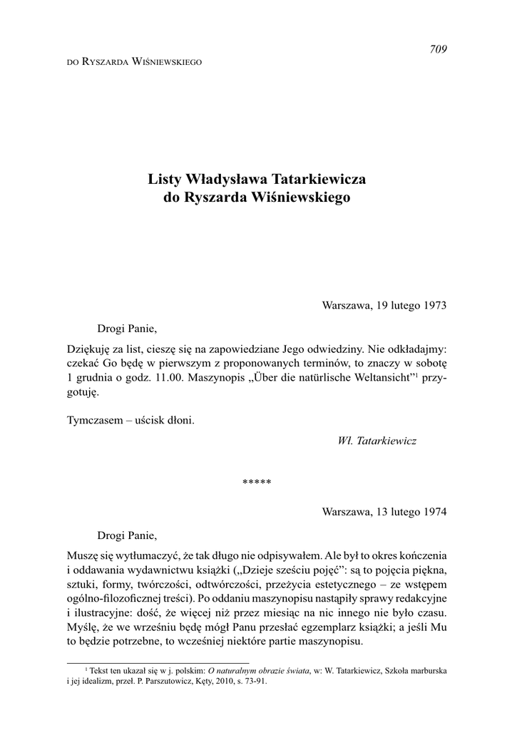 709 DO RYSZARDA WIŚNIEWSKIEGO Listy Władysława Tatarkiewicza do Ryszarda Wiśniewskiego Warszawa, 19 lutego 1973 Drogi Panie, Dziękuję za list, cieszę się na zapowiedziane Jego odwiedziny. Nie odkładajmy: czekać Go będę w pierwszym z proponowanych terminów, to znaczy w sobotę 1 grudnia o godz. 11.00. Maszynopis „Über die natürlische Weltansicht”1 przygotuję. Tymczasem – uścisk dłoni. Wł. Tatarkiewicz ***** Warszawa, 13 lutego 1974 Drogi Panie, Muszę się wytłumaczyć, że tak długo nie odpisywałem. Ale był to okres kończenia i oddawania wydawnictwu książki („Dzieje sześciu pojęć”: są to pojęcia piękna, sztuki, formy, twórczości, odtwórczości, przeżycia estetycznego – ze wstępem ogólno-filozoficznej treści). Po oddaniu maszynopisu nastąpiły sprawy redakcyjne i ilustracyjne: dość, że więcej niż przez miesiąc na nic innego nie było czasu. Myślę, że we wrześniu będę mógł Panu przesłać egzemplarz książki; a jeśli Mu to będzie potrzebne, to wcześniej niektóre partie maszynopisu. 1 Tekst ten ukazał się w j. polskim: O naturalnym obrazie świata, w: W. Tatarkiewicz, Szkoła marburska i jej idealizm, przeł. P. Parszutowicz, Kęty, 2010, s. 73-91. 710 LISTY WŁADYSŁAWA TATARKIEWICZA Szczerze się cieszę, że Pan otworzył przewód doktorski i zaczął pisanie pracy.2 Mam nadzieję, że w pisaniu tym nie natrafi Pan na większe trudności. Plan pracy bowiem jest – w moim przekonaniu – doskonały. Nie znajduję w nim nic, co by dobrze było zmienić. Wysyłam dziś list, choć mam trochę nadziei, że się jutro spotkamy, mianowicie na zorganizowanej przez Inst[ut] Fil[ozofii] Sesji Kantowskiej. Najlepsze pozdrowienia łączę. Wł. Tatarkiewicz ***** Warszawa, 24 marca 1974 Drogi Panie, Dostałem Jego list i – martwię się, że jestem przyczyną trudności, na jakie Pan natrafił. Zastanawiam się nad tymi trudnościami i widzę w sobie dwa ich źródła. Jednym jest dorywczość mej pracy nad etyką. Podczas studiów uniwersyteckich, w duchu czasu, właściwy sens filozofii widziałem w teorii poznania; nie słuchałem ani jednego wykładu z etyki i nie przeczytałem ani jednej większej książki z tej dziedziny, [ani] jednego podręcznika. Znałem dobrze dialogi Platona, ale traktowałem je jako rozważania z dialektyki raczej niż z etyki. Poznałem dobrze „Metafizykę” Arystotelesa, ale nie pamiętam, żebym zaglądał do jego etyki. Później dopiero poznałem dwie książki, które wybitnie mi się podobały: “Principia” Moore’a i „Formalizm” Schellera. Gdy jako bardzo jeszcze młody człowiek znalazłem się na Katedrze, wypadło mi mniej wykładać logikę i teorię poznania, skoro obok mnie wykładał tak znakomity ich znawca jak Jan Łukaszewicz. Praca uniwersytecka skłoniła mnie do etyki. Ale okazało się, że ten temat bardzo mi odpowiada. Z tej dziedziny ogłosiłem pierwszą (po doktorskiej) książkę3 i pierwszą większą rozprawę (o Pascalu)4. Ale losy akademickie, jak mnie przedtem skłoniły do etyki, tak potem mnie od niej oddaliły: do Wilna i Poznania, gdzie miałem katedrę estetyki i historii sztuki. Nie mogło to nie wpłynąć na ówczesny kierunek mej pracy. Gdy w 1923 2 Ryszard Wiśniewski pisał pracę doktorską pt. Dobro, moralność, szczęście i piękno. Studium aksjologii W. Tatarkiewicza, obronioną na Uniwersytecie Mikołaja Kopernika w Toruniu w 1976 r. (promotor: Stanisław Soldenhoff, rec.: Tadeusz Czeżowski, Henryk Jankowski). 3 O bezwzględności i obiektywności dobra i zła, Wydawnictwo Gebethnera i Wolffa, Warszawa – Lublin – Łódź – Kraków, 1919. 4 Porządek dóbr: Studium z Pascala, „Przegląd Filozoficzny”: Księga Pamiątkowa ku uczczeniu dwudziestopięciolecia działalności nauczycielskiej na Katedrze Filozofii w Uniwersytecie Lwowskim Kazimierza Twardowskiego, R. XXIII (1920), s. 295-318. 711 DO RYSZARDA WIŚNIEWSKIEGO [roku] znów znalazłem się na Katedrze w Warszawie, zadanie napisania podręcznika historii filozofii na wiele lat skupiło mnie na tym nowym przedmiocie. Gdy to skończyłem, domagały się opracowania materiały, które tymczasem narosły z historii sztuki, a także z teorii szczęścia. Potem – miałem za mój obowiązek opracowanie III tomu „Historii filozofii”. A później przyszedł okres estetyki, w szczególności jej historii. Patrząc wstecz, myślę, że nie było niemożliwe, żebym zamiast „Historii estetyki” próbował napisać analogiczną historię etyki: byłaby mi może przyszła nawet łatwiej, bo dzięki „Szczęściu” lepiej byłem obznajomiony z materiałem. Ale stało się inaczej. Dość, że od tych bardzo dawnych lat, gdy pisałem „O bezwzględności dobra”, nie było już w mym życiu okresu, kiedy bym w sposób dłuższy, bardziej ciągły i intensywny pracował nad etyką i więcej czasu mógł poświęcić literaturze tego przedmiotu. A jednak – nigdy nie przestałem o niej myśleć. Uderzające jest, że me tematy, z jakimi jeździłem na międzynarodowe zjazdy, były w dużej części czerpane z etyki. Pierwszy taki zjazd był w Oxfordzie w 1930 [roku] o „4 rodzajach sądów etycznych”. W r. 1938 odczyt na zebraniu Międzynar[odowego] Instytutu Filozofii w Amersfoort był o „porządku dóbr”. Na Kongresie Paryskim (IX) 1937 r. – „Co wiemy i czego nie wiemy o wartościach”. Na zjeździe Instytutu Międzynar[odowego] w Lund (1947) – „Zagadnienie aksjologii”. Na Kongresie Międzynarodowym w Amsterdamie (X) 1949 r. – „Moralność a szczęście”. Druga szczęśliwa rzecz, to, że dawniejsze prace z etyki wciąż na nowo przerabiałem. Piszę ponownie: „4 rodzaje sądów” (1930)5, “Honesty and Goodness” (1964 i 65)6, „Obrachunek i nakazy” (1966)7. Podobnie rozdział „Szczęścia” poświęcony najogólniejszym kategoriom etycznym (& XXVII 1. i 2. wydania) został w wydaniach późniejszych zupełnie zmieniony, włączony do 