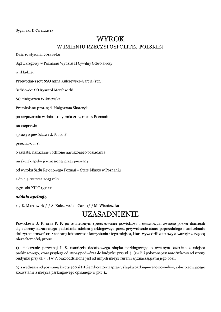 Sygn. akt II Ca 1122/13 WYROK W IMIENIU RZECZYPOSPOLITEJ POLSKIEJ Dnia 10 stycznia 2014 roku Sąd Okręgowy w Poznaniu Wydział II Cywilny Odwoławczy w składzie: Przewodniczący: SSO Anna Kulczewska-Garcia (spr.) Sędziowie: SO Ryszard Marchwicki SO Małgorzata Wiśniewska Protokolant: prot. sąd. Małgorzata Skorczyk po rozpoznaniu w dniu 10 stycznia 2014 roku w Poznaniu na rozprawie sprawy z powództwa J. P. i P. P. przeciwko I. S. o zapłatę, nakazanie i ochronę naruszonego posiadania na skutek apelacji wniesionej przez pozwaną od wyroku Sądu Rejonowego Poznań – Stare Miasto w Poznaniu z dnia 4 czerwca 2013 roku sygn. akt XII C 1311/11 oddala apelację. /-/ R. Marchwicki/-/ A. Kulczewska - Garcia/-/ M. Wiśniewska UZASADNIENIE Powodowie J. P. oraz P. P. po ostatecznym sprecyzowaniu powództwa i częściowym zwrocie pozwu domagali się ochrony naruszonego posiadania miejsca parkingowego przez przywrócenie stanu poprzedniego i zaniechanie dalszych naruszeń oraz ochrony ich prawa do korzystania z tego miejsca, które wywodzili z umowy zawartej z zarządcą nieruchomości, przez: 1) nakazanie pozwanej I. S. usunięcia dodatkowego słupka parkingowego o owalnym kształcie z miejsca parkingowego, które przylega od strony podwórza do budynku przy ul. (...) w P. i położone jest narożnikowo od strony budynku przy ul. (...) w P. oraz oddzielone jest od innych miejsc rurami wyznaczającymi jego boki, 2) zasądzenie od pozwanej kwoty 400 zł tytułem kosztów naprawy słupka parkingowego powodów, zabezpieczającego korzystanie z miejsca parkingowego opisanego w pkt. 1., 3) zasądzenie od pozwanej kwoty 120 zł tytułem pokrycia kosztów parkowania samochodu powodów w strefie płatnego parkowania Miasta P., 4) nakazanie pozwanej zaniechania parkowania samochodu na miejscu parkingowym opisanym w pkt. 1. Pozwana I. S. wniosła o oddalenie powództwa oraz zasądzenie kosztów procesu. Wyrokiem z 4 czerwca 2013 r., sygn. akt XII C (...)Sąd Rejonowy Poznań - Stare Miasto w Poznaniu (1) nakazał pozwanej przywrócenie powodom naruszonego posiadania miejsca parkingowego przez usunięcie dodatkowego owalnego słupka parkingowego z miejsca parkingowego, które przylega od strony podwórza do budynku przy ulicy (...)w P.i położone jest narożnikowo od strony budynku przy ul. (...)w P.oraz oddzielone jest od innych miejsc rurami wyznaczającymi jego boki; (2) nakazał pozwanej, aby zaniechała naruszeń posiadania powodów przez parkowanie samochodu na miejscu parkingowym przylegającym od strony podwórza do budynku przy ulicy (...)w P., położonym narożnikowo od strony budynku przy ul. (...)w P., które oddzielone jest od innych miejsc rurami wyznaczającymi jego boki; (3) umorzył postępowanie co do roszczenia o zapłatę kwoty 100 zł; (4) oddalił powództwo w pozostałym zakresie; (5) kosztami procesu obciążył powodów w zakresie dotychczas poniesionym. Podstawę tego wyroku stanowiły następujące ustalenia faktyczne i rozważania prawne: W marcu 2009 r. powodowie J. P.i P. P.nabyli udział we własności nieruchomości położonej przy ulicy (...)w P.. Poprzednim właścicielem tego udziału był C. O., który korzystał dodatkowo z miejsca parkingowego położonego na podwórzu tej nieruchomości, przylegającego od strony podwórza do budynku przy ul. (...), narożnikowego - od strony budynku przy ul. (...), oddzielonego metalowymi rurami wyznaczającymi jego boki. Poprzedni właściciel C. O. (1)na podstawie umowy z zarządcą przez ponad dziesięć lat korzystał ze wspomnianego miejsca parkingowego, przylegającego do ściany budynku numer (...). Wobec tego zarządzająca nieruchomością E. S.zezwoliła powodom, po nabyciu przez nich udziału w nieruchomości, na parkowanie samochodu w tym samym miejscu, zastrzegając sobie prawo cofnięcia tej decyzji. W dniu 1 czerwca 2009 r. powodowie zawarli z E. S. , która działała jako administrator nieruchomości, umowę, na podstawie której otrzymali do nieodpłatnego użytkowania wyżej opisane miejsce postojowe na nieruchomości, przy kamienicy numer 5, z którego wcześniej korzystał C. O.. W tym czasie E. S. miała większość udziałów w nieruchomości i zajmowała się administrowaniem nią. Nie zawierała ona na piśmie umowy ze wszystkimi współwłaścicielami o zarządzanie nieruchomością, a jedynie z niektórymi. Pozostali współwłaściciele wiedzieli, że sprawuje ona faktycznie zarząd nieruchomością i dokonywali na jej konto opłat związanych z nieruchomością. Część współwłaścicieli, w tym pozwana, kwestionowała jednak sposób administrowania nieruchomością przez tego świadka i domagała się złożenia sprawozdana z zarządu. Następnie wspomniani współwłaściciele zażądali ustanowienia wspólnego zarządu, w którym będą uczestniczyć. W 2009 r. nadal wpłacali jednak na konto E. S. należności związane z korzystaniem z nieruchomości. E. S. nigdy nie uzgadniała ze wszystkimi współwłaścicielami sposobu wykorzystywania podwórza, na którym znajdują się miejsca parkingowe. Rozmowy takie prowadziła jedynie z niektórymi, zmotoryzowanymi , współwłaścicielami nieruchomości. Wspomniane miejsce parkingowe, w dacie przejęcia go w posiadanie przez powodów, było wyposażone w blokadę – słupek parkingowy trwale przymocowany, który po jego postawieniu i zamknięciu uniemożliwiał wjazd na miejsce parkingowe. Słupek ten miał wówczas ponad 10 lat. Powodowie po zakupie udziału w nieruchomości rozpoczęli remont lokalu, w związku z czym korzystali z miejsca parkingowego, uprzednio zajmowanego przez C. O.. Stawiali tam swój samochód albo kontener na gruz i śmieci, a nadto zezwalali na parkowanie na tym miejscu osobom wykonującym prace remontowe. W 2009 r. wprowadzili się do lokalu i nadal stawiali swój pojazd na tym miejscu parkingowym. W tym czasie blokada w postaci słupka zamontowanego na miejscu parkingowym była sprawna – zamknięcie słupka działa
