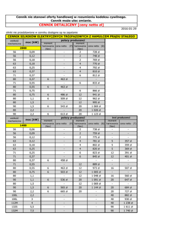 Cennik nie stanowi oferty handlowej w rozumieniu kodeksu cywilnego. Cennik może ulec zmianie. CENNIK DETALICZNY [ceny netto zł] 2016-01-29 silniki nie przedstawione w cenniku dostępne są na zapytanie CENNIK SILNIKÓW ELEKTRYCZNYCH TRÓJFAZOWYCH Z HAMULCEM PRĄDU STAŁEGO wielkość mechaniczna moc [kW] 2800 polscy producenci moment hamowania cena netto [Nm] moment (P) hamowania cena netto (B) [Nm] 56 0,09 - 2 728 zł 56 0,12 - 2 748 zł 56 0,18 - 2 769 zł 63 0,18 - 4 770 zł 63 0,25 - 4 792 zł 63 0,37 - 4 810 zł 71 0,37 - 6 812 zł 80 0,37 71 0,55 6 833 zł 80 0,55 71 0,75 - 6 866 zł 80 0,75 6 486 zł 12 941 zł 80 1,1 6 509 zł 12 962 zł 80 1,5 - 12 995 zł 90 1,5 543 zł 20 1 069 zł 80 2,2 - 20 1 026 zł 90 2,2 613 zł 20 1 123 zł wielkość mechaniczna moc [kW] 1400 6 463 zł - 6 6 6 - 463 zł - polscy producenci moment hamowania cena netto [Nm] inni producenci moment moment (P) hamowania cena netto (B) hamowania cena netto (T) [Nm] [Nm] 56 0,06 - 2 738 zł - - 56 0,09 - 2 759 zł - - 56 0,12 - 2 775 zł - - 63 0,12 - 4 781 zł 5 357 zł 63 0,18 - 4 802 zł 5 359 zł 63 0,25 - 4 820 zł 5 369 zł 71 0,25 - 6 823 zł 12 391 zł 71 0,37 - 6 845 zł 12 401 zł 80 0,37 - - - 71 0,55 80 6 458 zł - 12 889 zł - - 0,55 6 463 zł 12 973 zł 16 507 zł 80 0,75 6 503 zł 12 1 005 zł - - 80 1,1 - 12 1 048 zł 16 560 zł 90 1,1 536 zł 20 1 091 zł 20 647 zł 80 1,5 - 12 1 069 zł - - 90 1,5 6 565 zł 20 1 144 zł 20 684 zł 90 2,2 6 665 zł 20 - 20 727 zł 100L 2,2 - - 40 882 zł 6 100L 3 - - 40 930 zł 112M 4 - - 40 1 238 zł 132S 5,5 - - 90 1 611 zł 132M 7,5 - - 90 1 740 zł Cennik nie stanowi oferty handlowej w rozumieniu kodeksu cywilnego. Cennik może ulec zmianie. CENNIK DETALICZNY [ceny netto zł] 2016-01-29 silniki nie przedstawione w cenniku dostępne są na zapytanie CENNIK SILNIKÓW ELEKTRYCZNYCH TRÓJFAZOWYCH Z HAMULCEM PRĄDU STAŁEGO wielkość mechaniczna moc [kW] 900 polscy producenci moment hamowania cena netto [Nm] moment (P) hamowania cena netto (B) [Nm] 56 0,06 - 2 823 zł 63 0,09 - 4 855 zł 63 0,12 - 4 866 zł 71 0,18 - 6 877 zł 71 0,25 - 6 889 zł 80 0,25 71 0,37 - 6 901 zł 80 0,37 6 469 zł 12 951 zł 80 0,55 6 500 zł 12 973 zł 80 0,75 - 12 1 048 zł 90 0,75 538 zł 20 1 069 zł 80 1,1 - 12 1 123 zł 90 1,1 6 663 zł 20 1 176 zł 90 1,5 6 713 zł wielkość mechaniczna moc [kW] 700 6 6 463 zł - - polscy producenci moment hamowania cena netto [Nm] moment (P) hamowania cena netto (B) [Nm] 63 0,06 - 4 951 zł 71 0,09 - 6 973 zł 71 0,12 - 6 997 zł 71 0,18 - 6 1 016 zł 80 0,18 6 550 zł 12 1 069 zł 80 0,25 6 563 zł 12 1 123 zł 80 0,37 - 12 1 176 zł 90 0,37 6 575 zł 20 1 261 zł 80 0,55 - 12 1 240 zł 90 0,55 - 20 1 283 zł