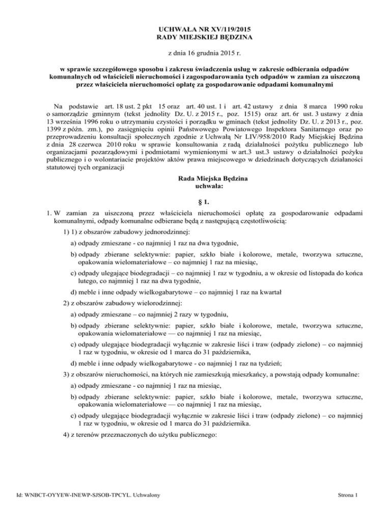 UCHWAŁA NR XV/119/2015 RADY MIEJSKIEJ BĘDZINA z dnia 16 grudnia 2015 r. w sprawie szczegółowego sposobu i zakresu świadczenia usług w zakresie odbierania odpadów komunalnych od właścicieli nieruchomości i zagospodarowania tych odpadów w zamian za uiszczoną przez właściciela nieruchomości opłatę za gospodarowanie odpadami komunalnymi Na podstawie art. 18 ust. 2 pkt 15 oraz art. 40 ust. 1 i art. 42 ustawy z dnia 8 marca 1990 roku o samorządzie gminnym (tekst jednolity Dz. U. z 2015 r., poz. 1515) oraz art. 6r ust. 3 ustawy z dnia 13 września 1996 roku o utrzymaniu czystości i porządku w gminach (tekst jednolity Dz. U. z 2013 r., poz. 1399 z późn. zm.), po zasięgnięciu opinii Państwowego Powiatowego Inspektora Sanitarnego oraz po przeprowadzeniu konsultacji społecznych zgodnie z Uchwałą Nr LIV/958/2010 Rady Miejskiej Będzina z dnia 28 czerwca 2010 roku w sprawie konsultowania z radą działalności pożytku publicznego lub organizacjami pozarządowymi i podmiotami wymienionymi w art.3 ust.3 ustawy o działalności pożyku publicznego i o wolontariacie projektów aktów prawa miejscowego w dziedzinach dotyczących działaności statutowej tych organizacji Rada Miejska Będzina uchwala: § 1. 1. W zamian za uiszczoną przez właściciela nieruchomości opłatę za gospodarowanie odpadami komunalnymi, odpady komunalne odbierane będą z następującą częstotliwością: 1) 1) z obszarów zabudowy jednorodzinnej: a) odpady zmieszane - co najmniej 1 raz na dwa tygodnie, b) odpady zbierane selektywnie: papier, szkło białe i kolorowe, metale, tworzywa sztuczne, opakowania wielomateriałowe – co najmniej 1 raz na miesiąc, c) odpady ulegające biodegradacji – co najmniej 1 raz w tygodniu, a w okresie od listopada do końca lutego, co najmniej 1 raz na dwa tygodnie, d) meble i inne odpady wielkogabarytowe – co najmniej 1 raz na kwartał 2) z obszarów zabudowy wielorodzinnej: a) odpady zmieszane – co najmniej 2 razy w tygodniu, b) odpady zbierane selektywnie: papier, szkło białe i kolorowe, metale, tworzywa sztuczne, opakowania wielomateriałowe — co najmniej 1 raz na miesiąc, c) odpady ulegające biodegradacji wyłącznie w zakresie liści i traw (odpady zielone) – co najmniej 1 raz w tygodniu, w okresie od 1 marca do 31 października, d) meble i inne odpady wielkogabarytowe - co najmniej 1 raz na tydzień; 3) z obszarów nieruchomości, na których nie zamieszkują mieszkańcy, a powstają odpady komunalne: a) odpady zmieszane - co najmniej 1 raz na miesiąc, b) odpady zbierane selektywnie: papier, szkło białe i kolorowe, metale, tworzywa sztuczne, opakowania wielomateriałowe — co najmniej 1 raz na miesiąc, c) odpady ulegające biodegradacji wyłącznie w zakresie liści i traw (odpady zielone) – co najmniej 1 raz w tygodniu, w okresie od 1 marca do 31 października. 4) z terenów przeznaczonych do użytku publicznego: Id: WNBCT-OYYEW-INEWP-SJSOB-TPCYL. Uchwalony Strona 1 a) opróżnianie koszy ulicznych oraz koszy z parków, przystanków - co najmniej 1 raz w tygodniu, z częstotliwością zapewniającą niedopuszczenie do ich przepełnienia i wysypywania odpadów na ziemię; b) opróżnianie pojemników do selektywnej zbiórki odpadów tzw. "gniazda" – co najmniej 1 raz w miesiącu. 2. W ramach uiszczonej opłaty za gospodarowanie odpadami komunalnymi odpady komunalne takie jak przeterminowane leki i chemikalia, zużyte baterie i akumulatory, zużyty sprzęt elektryczny i elektroniczny oraz opony mieszkańcy oddają do Punktu Selektywnego Zbierania Odpadów Komunalnych prowadzonego przez podmiot wyłoniony w drodze postępowania przetargowego na odbieranie i zagospodarowanie odpadów komunalnych z terenu miasta. 3. Odpady budowlane i rozbiórkowe stanowiące odpady komunalne pochodzące z drobnych remontów prowadzonych we własnym zakresie przez właściciela nieruchomości można na bieżąco i nieodpłatnie dostarczyć do Punktu Selektywnego Zbierania Odpadów Komunalnych, przy użyciu własnego środka transportu. 4. Odbiór odpadów przez podmiot wyłoniony w drodze postępowania przetargowego odbywa się zgodnie z harmonogramem udostępnionym właścicielom nieruchomości, z których odbiór ma być dokonany. 5. W przypadku odpadów zielonych powstających w związku ze świadczeniem usług przez dany podmiot, zagospodarowanie odpadów należy do obowiązków tego podmiotu. 6. Jako część usługi w zakresie odbierania odpadów komunalnych od właścicieli nieruchomości, w zamian za uiszczoną przez właściciela opłatę za gospodarowanie odpadami komunalnymi, gmina zapewnia wyposażenie nieruchomości w worki do selektywnej zbiórki odpadów. 7. Na terenie zabudowy wielorodzinnej oraz na terenach przeznaczonych do użytku publicznego "gniazda" do selektywnej zbiórki odpadów dostępne będą dla mieszkańców 24 godzin na dobę. 8. Punkt Selektywnego Zbierania Odpadów Komunalnych jako miejsce odbioru i gromadzenia odpadów komunalnych zbieranych selektywnie, prowadzony przez podmiot wyłoniony w drodze postępowania przetargowego na odbieranie i zagospodarowanie odpadów komunalnych z terenu miasta, świadczyć będzie usługi od poniedziałku do piątku w godzinach od 1000 do 1800 . 9. Właściciele nieruchomości samodzielnie przekazują odpady zebrane selektywnie, określone w Regulaminie utrzymania czystości i porządku na terenie miasta Będzina, do Punktu Selektywnego Zbierania Odpadów Komunalnych w sytuacji gdy ich przekazanie w wyznaczonym harmonogramem terminie jest dla właściciela nieruchomości niemożliwe. Do Punktu Selektywnego Zbierania Odpadów Komunalnych należy odpady dowieźć własnym transportem. § 2. 1. Właściciele nieruchomości mogą zgłaszać przypadki niewłaściwego świadczenia usług przez przedsiębiorcę odbierającego odpady komunalne oraz prowadzącego Punkt Selektywnego Zbierania Odpadów Komunalnych w formie pisemnej ( za pośrednictwem pisma tradycyjnego lub przesyłki elektronicznej