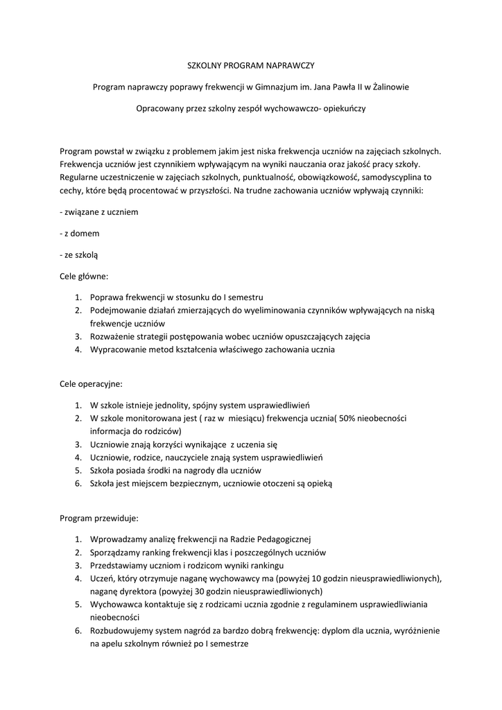 SZKOLNY PROGRAM NAPRAWCZY Program naprawczy poprawy frekwencji w Gimnazjum im. Jana Pawła II w Żalinowie Opracowany przez szkolny zespół wychowawczo- opiekuńczy Program powstał w związku z problemem jakim jest niska frekwencja uczniów na zajęciach szkolnych. Frekwencja uczniów jest czynnikiem wpływającym na wyniki nauczania oraz jakość pracy szkoły. Regularne uczestniczenie w zajęciach szkolnych, punktualność, obowiązkowość, samodyscyplina to cechy, które będą procentować w przyszłości. Na trudne zachowania uczniów wpływają czynniki: - związane z uczniem - z domem - ze szkolą Cele główne: 1. Poprawa frekwencji w stosunku do I semestru 2. Podejmowanie działań zmierzających do wyeliminowania czynników wpływających na niską frekwencje uczniów 3. Rozważenie strategii postępowania wobec uczniów opuszczających zajęcia 4. Wypracowanie metod kształcenia właściwego zachowania ucznia Cele operacyjne: 1. W szkole istnieje jednolity, spójny system usprawiedliwień 2. W szkole monitorowana jest ( raz w miesiącu) frekwencja ucznia( 50% nieobecności informacja do rodziców) 3. Uczniowie znają korzyści wynikające z uczenia się 4. Uczniowie, rodzice, nauczyciele znają system usprawiedliwień 5. Szkoła posiada środki na nagrody dla uczniów 6. Szkoła jest miejscem bezpiecznym, uczniowie otoczeni są opieką Program przewiduje: 1. 2. 3. 4. Wprowadzamy analizę frekwencji na Radzie Pedagogicznej Sporządzamy ranking frekwencji klas i poszczególnych uczniów Przedstawiamy uczniom i rodzicom wyniki rankingu Uczeń, który otrzymuje naganę wychowawcy ma (powyżej 10 godzin nieusprawiedliwionych), naganę dyrektora (powyżej 30 godzin nieusprawiedliwionych) 5. Wychowawca kontaktuje się z rodzicami ucznia zgodnie z regulaminem usprawiedliwiania nieobecności 6. Rozbudowujemy system nagród za bardzo dobrą frekwencję: dyplom dla ucznia, wyróżnienie na apelu szkolnym również po I semestrze Zadania wychowawcy: 1. Nagradza pochwałą uczniów o bardzo dobrej frekwencji na forum klasy, na zebraniu z rodzicami 2. Poznaje przyczyny nieobecności uczniów, współdziała z pedagogiem w zakresie pomocy uczniom 3. Informuje rodzica o nieobecnościach zgodnie z regulaminem. Zadania nauczycieli: 1. Współdziałają ze sobą pedagogiem szkolnym we wszystkich sprawach dotyczących uczniów 2. Nauczyciele potrafią postępować z dziećmi trudnymi, wymagającymi specjalnej troski Zadania rodziców: 1. 2. 3. 4. Współpracują ze szkołą Informują wychowawcę o przyczynach nieobecności dziecka w szkole Współtworzą spójny plan oddziaływań wychowawczych Rada Rodziców finansuje nagrody dla uczniów ze 100% frekwencją Zadania ucznia: 1. Usprawiedliwia nieobecności na zajęciach zgodnie z regulaminem Przewidywane rezultaty działań: 1. 2. 3. 4. 5. Szkoła posiada regulamin usprawiedliwiania nieobecności Zwiększenie frekwencji, w efekcie podniesienie wyników nauczania Uczniowie mają wysoki stopień motywacji Liczba godzin nieusprawiedliwionych spada Uczniowie są świadomi konsekwencji swego zachowania zarówno pozytywnego jak i negatywnego 6. Nauczyciele stosują pozytywne i bardziej efektywne sposoby kontroli klasowej 7. Szkoła jest miejscem dla ucznia gdzie stawiane mu są wymagania, ale oferuje się też atrakcyjne możliwości spędzenia czasu wolnego i nauki ETAPY WDARAŻANIA PROGRAMU Lp. Etap 1. - Wywiad, pogadanka, ankieta wśród uczniów, rodziców na temat przyczyn niepowodzeń szkolnych i niskiej frekwencji - uświadomienie uczniom i rodzicom zależności między frekwencją a wynikami w nauce 2. - opracowanie działań, celem których jest poprawa frekwencji - wprowadzenie monitorowania frekwencji poszczególnych klas - opracowanie systemu nagród za najlepszą frekwencję - przedstawienie wyników w formie graficznej i eksponowanie na tablicy informacyjnej - motywowanie uczniów do lepszej frekwencji - zapewnienie uczniom bezpieczeństwa na terenie szkoły - uświadomienie zagrożeń wynikających z nie przestrzegania regulaminu -pedagogizacja rodziców na temat zagrożeń wynikających z opuszczania zajęć szkolnych - zorganizowanie cyklu spotkań z pedagogiem dla uczniów o najniższej frekwencji - indywidualne rozmowy pedagoga z uczniami - uświadamianie uczniom korzyści wynikających z nauki poprzez wskazywanie pozytywnych przykładów - ewaluacja programu - opracowanie wniosków oraz ocena funkcjonowania programu 3. 4. 5. 6. 7. 8. 9. 10. Termin Odpowiedzialni Wychowawcy, pedagog Raz na miesiąc koniec II semestru Wychowawcy, pedagog Praca ciągła Praca ciągła Nauczyciele, pedagog Dyrektor, wychowawcy, nauczyciele II semestr Wychowawca, pedagog Cały rok Pedagog szkolny Praca ciągła Nauczyciele, wychowawcy Czerwiec 2012 Zespół, Rada Pedagogiczna zespół