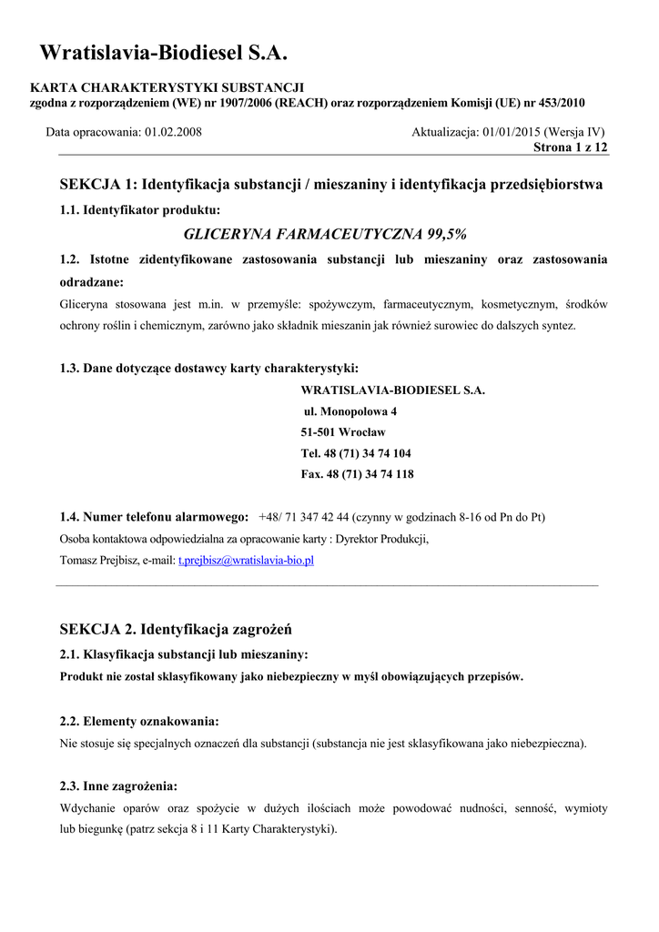 Wratislavia-Biodiesel S.A. KARTA CHARAKTERYSTYKI SUBSTANCJI zgodna z rozporządzeniem (WE) nr 1907/2006 (REACH) oraz rozporządzeniem Komisji (UE) nr 453/2010 Data opracowania: 01.02.2008 Aktualizacja: 01/01/2015 (Wersja IV) Strona 1 z 12 SEKCJA 1: Identyfikacja substancji / mieszaniny i identyfikacja przedsiębiorstwa 1.1. Identyfikator produktu: GLICERYNA FARMACEUTYCZNA 99,5% 1.2. Istotne zidentyfikowane zastosowania substancji lub mieszaniny oraz zastosowania odradzane: Gliceryna stosowana jest m.in. w przemyśle: spożywczym, farmaceutycznym, kosmetycznym, środków ochrony roślin i chemicznym, zarówno jako składnik mieszanin jak również surowiec do dalszych syntez. 1.3. Dane dotyczące dostawcy karty charakterystyki: WRATISLAVIA-BIODIESEL S.A. ul. Monopolowa 4 51-501 Wrocław Tel. 48 (71) 34 74 104 Fax. 48 (71) 34 74 118 1.4. Numer telefonu alarmowego: +48/ 71 347 42 44 (czynny w godzinach 8-16 od Pn do Pt) Osoba kontaktowa odpowiedzialna za opracowanie karty : Dyrektor Produkcji, Tomasz Prejbisz, e-mail: [email protected] __________________________________________________________________________________________________ SEKCJA 2. Identyfikacja zagrożeń 2.1. Klasyfikacja substancji lub mieszaniny: Produkt nie został sklasyfikowany jako niebezpieczny w myśl obowiązujących przepisów. 2.2. Elementy oznakowania: Nie stosuje się specjalnych oznaczeń dla substancji (substancja nie jest sklasyfikowana jako niebezpieczna). 2.3. Inne zagrożenia: Wdychanie oparów oraz spożycie w dużych ilościach może powodować nudności, senność, wymioty lub biegunkę (patrz sekcja 8 i 11 Karty Charakterystyki). Wratislavia-Biodiesel S.A. KARTA CHARAKTERYSTYKI SUBSTANCJI zgodna z rozporządzeniem (WE) nr 1907/2006 (REACH) oraz rozporządzeniem Komisji (UE) nr 453/2010 Data opracowania: 01.02.2008 Aktualizacja: 01/01/2015 (Wersja IV) Strona 2 z 12 ___________________________________________________________________________________________________ SEKCJA 3. Skład / informacja o składnikach 3.1. Substancje: Substancja : nr CAS Glicerol ( 1,2,3- Propantriol) 56-81-5 nr WE 200-289-5 uł. masowy % min. 99,5 Zwroty R brak SEKCJA 4. Środki pierwszej pomocy 4.1. Opis środków pierwszej pomocy: 4.1.1. Wdychanie: W razie dłuższego kontaktu poprzez drogi oddechowe zapewnić dostęp świeżego powietrza. Jeśli poszkodowany poczuje się źle, należy skontaktować się z lekarzem. 4.1.2. Kontakt ze skórą: Produkt nie powoduje podrażnień, jednak zaleca się zdjąć zanieczyszczoną odzież i przemyć skórę wodą. Jeżeli wystąpią jakiekolwiek podrażnienia, skontaktować się z lekarzem. 4.1.3. Kontakt z oczami: Produkt nie powoduje podrażnień oczu, jednak zaleca się przepłukać oczy dużą ilością letniej wody, najlepiej bieżącej. Usunąć soczewki kontaktowe. Unikać silnego strumienia wody ze względu na ryzyko mechanicznego uszkodzenia rogówki. Jeżeli podrażnienie wystąpi należy skonsultować się z lekarzem-okulistą. 4.1.4. Połknięcie: W przypadku połknięcia nie powodować wymiotów. Zaleca się wypłukać usta. W przypadku wystąpienia jakichkolwiek dolegliwości, należy skontaktować się z lekarzem. 4.2. Najważniejsze ostre i opóźnione objawy oraz skutki narażenia: Dłuższe przebywanie w atmosferze oparów gliceryny lub spożycie większej ilości może powodować pogorszenia samopoczucia, nudności, wymioty lub biegunkę. W przypadku nasilania się objawów należy skontaktować się z lekarzem. 4.3. Wskazania dotyczące wszelkiej natychmiastowej pomocy lekarskiej i szczególnego postępowania z poszkodowanym: Brak specjalnych zaleceń Wratislavia-Biodiesel S.A. KARTA CHARAKTERYSTYKI SUBSTANCJI zgodna z rozporządzeniem (WE) nr 1907/2006 (REACH) oraz rozporządzeniem Komisji (UE) nr 453/2010 Data opracowania: 01.02.2008 Aktualizacja: 01/01/2015 (Wersja IV) Strona 3 z 12 __________________________________________________________________________________________________ SEKCJA 5. Postępowanie w przypadku pożaru Substancja palna. Temperatura zapłonu czystego produktu wynosi ok. 177 °C. Samozapłon następuje w temperaturze powyżej 370 °C. Pojemniki nieobjęte pożarem w miarę możliwości przetransportować w bezpieczne miejsce. Pojemniki narażone na działanie ognia chłodzić rozproszonym strumieniem wody. 5.1. Środki gaśnicze: Odpowiednie środki gaśnicze: woda, gaśnice proszkowe i śniegowe, piany gaśnicze. Niewłaściwe środki gaśnicze: wszystkie środki gaśnicze są dozwolone. 5.2. Szczególne zagrożenia związane z substancją lub mieszaniną: W procesie spalania może powstawać trująca akroleina oraz tlenek węgla (produkt niepełnego spalania). Należy stosować odzież termochronną i gazoszczelną, zamiennie sprzęt ochronny układu oddechowego. Gorąca gliceryna mocno przylega do skóry powodując dotkliwe oparzenia. 5.3. Informacje dla straży pożarnej: Patrz punkt 5.1 i 5.2 Karty Charakterystyki. SEKCJA 6. POSTĘPOWANIE W PRZYPADKU NIEZAMIERZONEGO UWOLNIENIA DO ŚRODOWISKA 6.1. Indywidualne środki ostrożności, wyposażenie ochronne i procedury w sytuacjach awaryjnych: 6.1.1. Dla osób nienależących do personelu udzielającego pomocy: W przypadku przecieku lub niezamierzonego uwolnienia należy wyeliminować potencjalne źródła zapłonu i zabezpieczyć miejsce przed osobami postronnymi. Zaleca się stosowanie podstawowej ochrony w postaci rękawic ochronnych (np. gumowych) oraz okularów. Wratislavia-Biodiesel S.A. KARTA CHARAKTERYSTYKI SUBSTANCJI zgodna z rozporządzeniem (WE) nr 1907/2006 (REACH) oraz rozporządzeniem Komisji (UE) nr 453/2010 Data opracowania: 01.02.2008 Aktualizacja: 01/01/2015 (Wersja IV) Strona 4 z 12 6.1.2. Dla osób udzielających pomocy: Osoby bezpośrednio uczestniczące w neutralizacji wycieku powinny posiadać ubranie ochronne w postaci szczelnych rękawic oraz okularów. W przypadku kontaktu z gorącą substancją należy stosować odzież termochronną i sprzęt do ochrony dróg oddechowych.